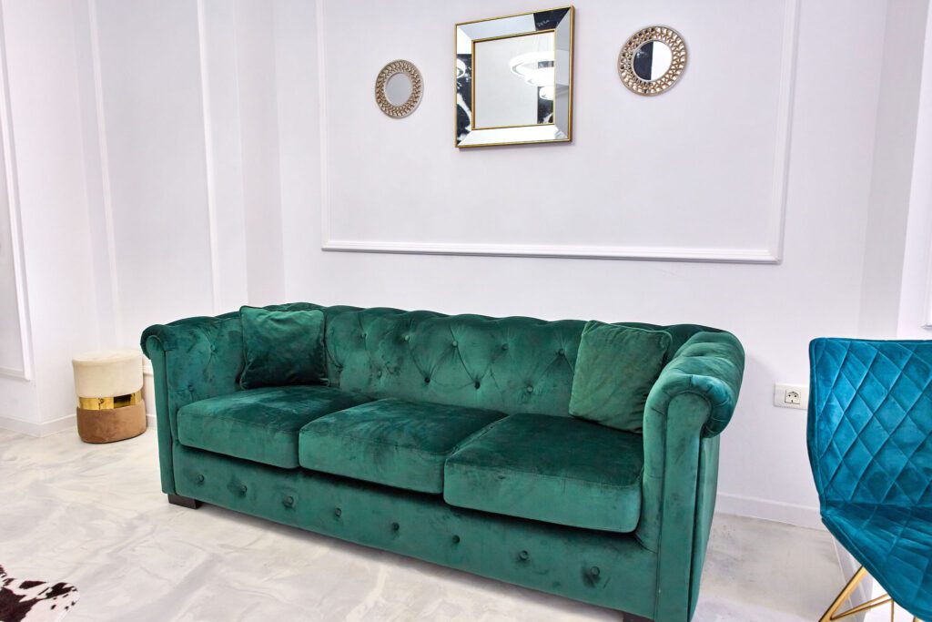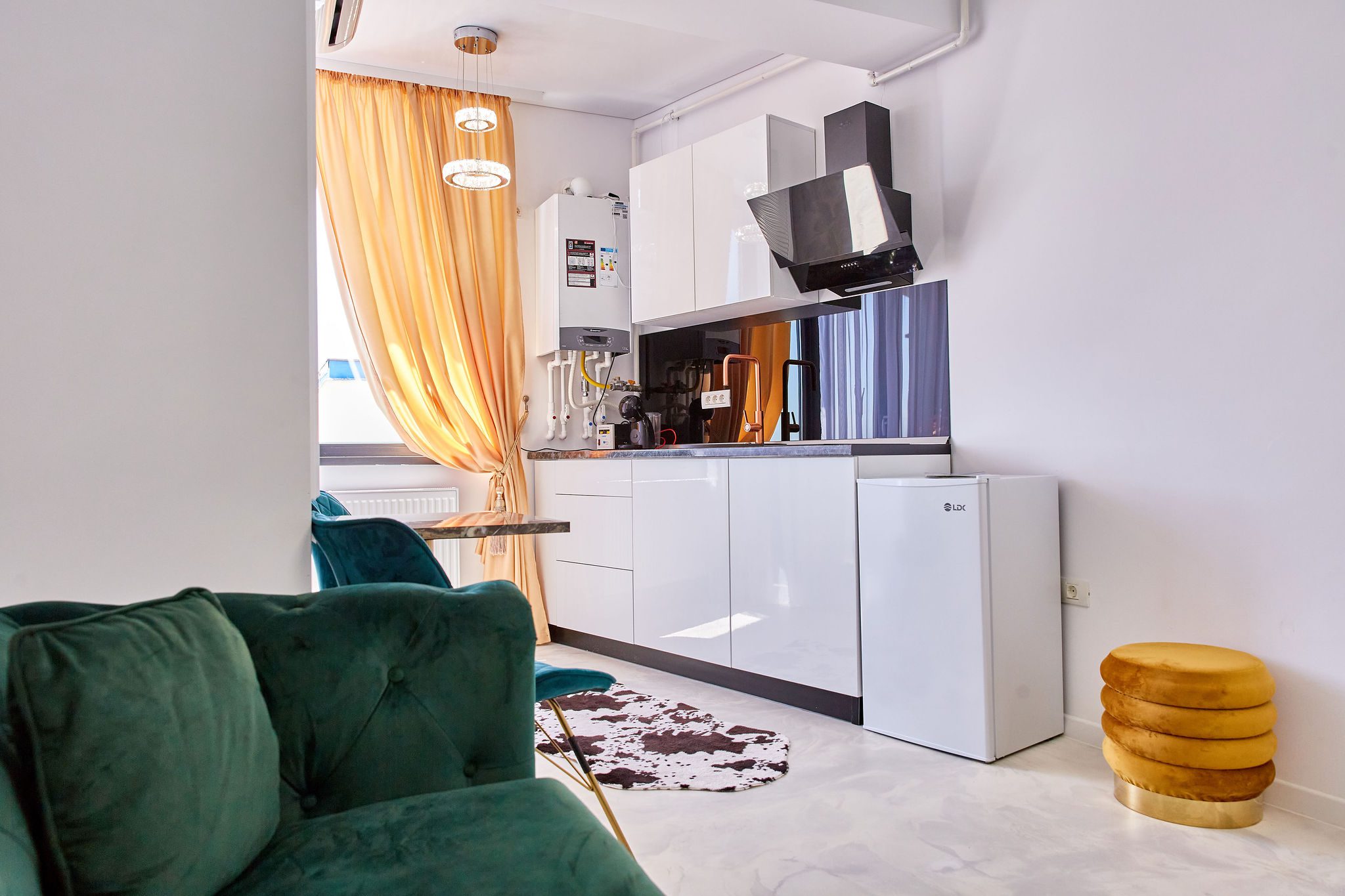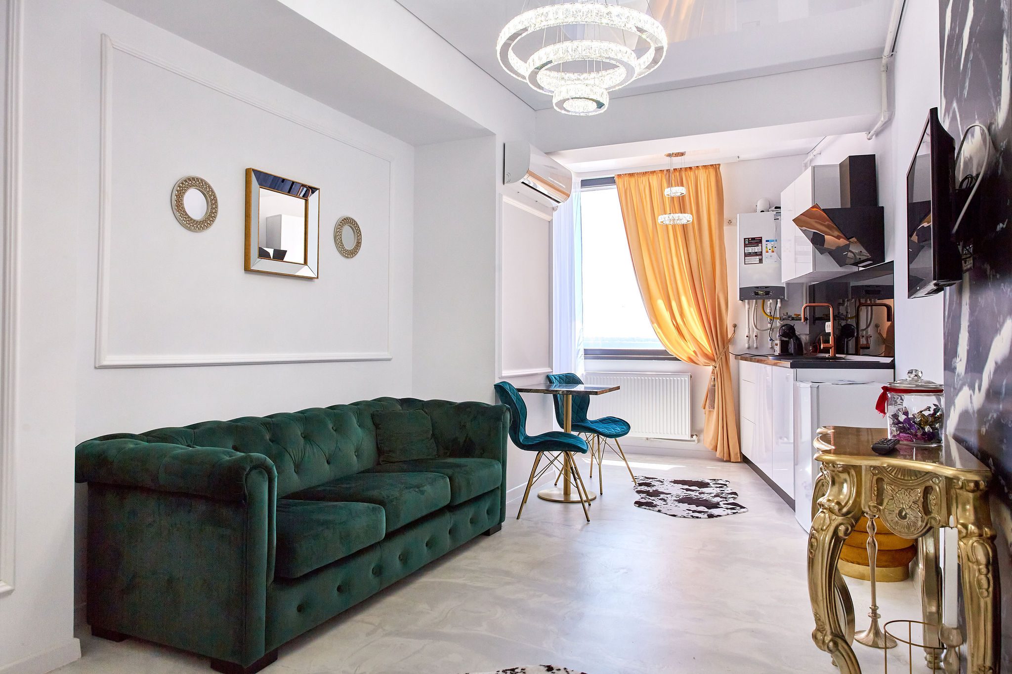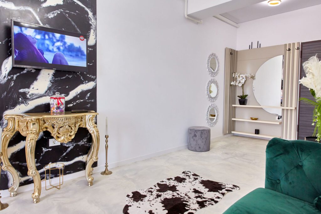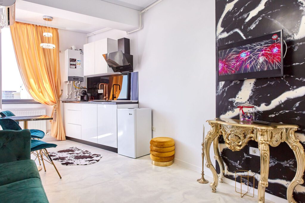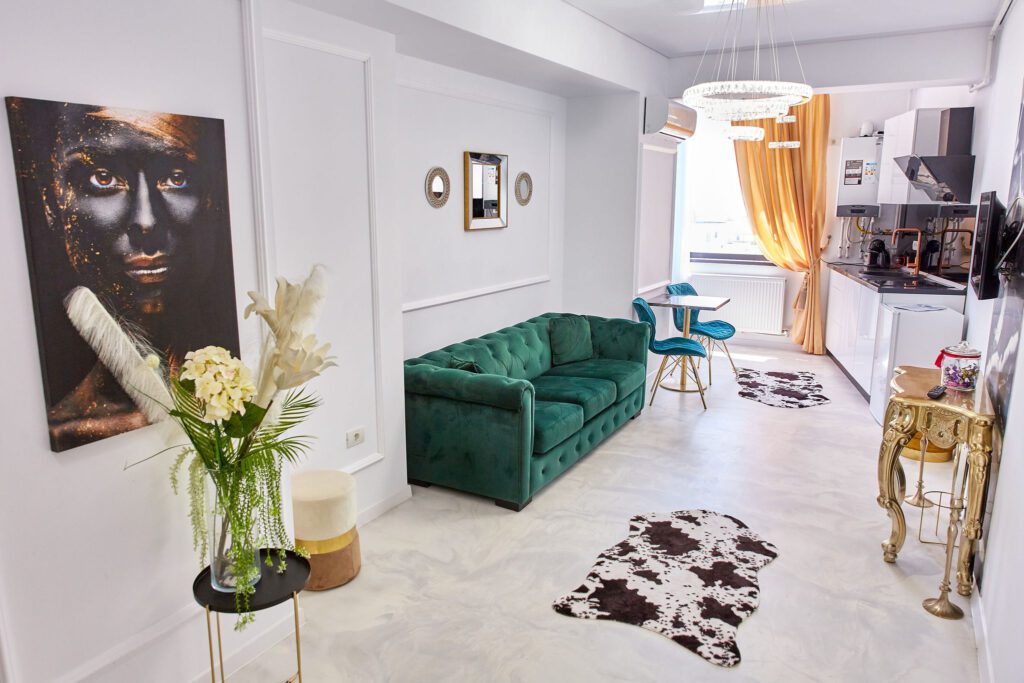 Sufragerie: Sufrageria open space a apartamentului De Beni strălucește de lux și rafinament. Canapeaua extensibilă, într-o nuanță vibrantă de verde smarald, realizată din catifea, oferă un contrast sofisticat cu finisajele camerei. În fața canapelei, un televizor modern completează zona de relaxare, oferind un loc ideal pentru a vă destinde după o zi lungă.