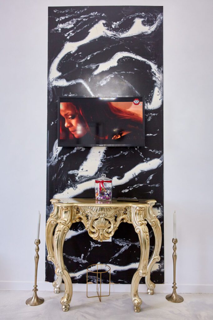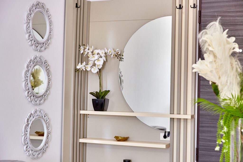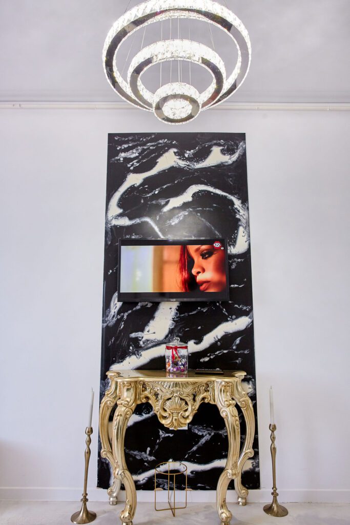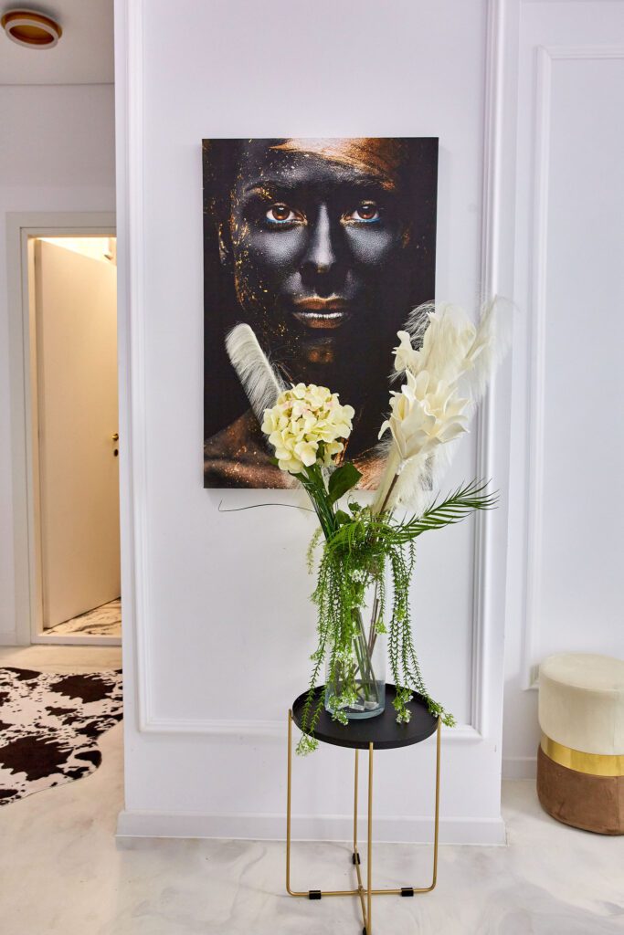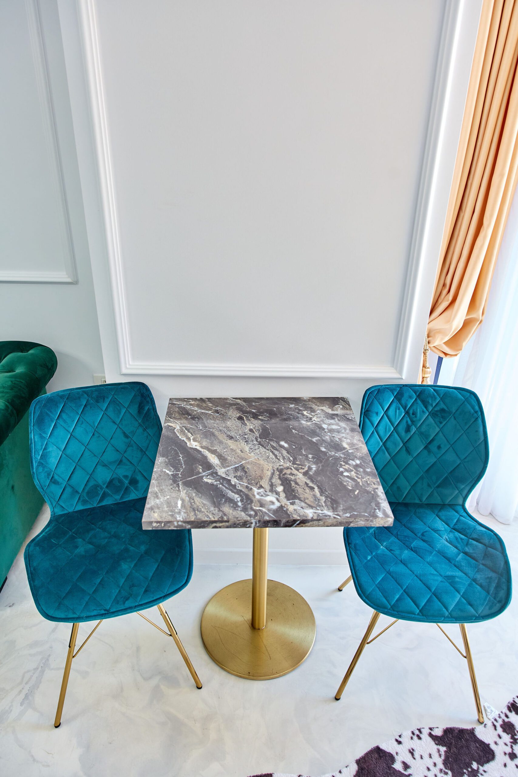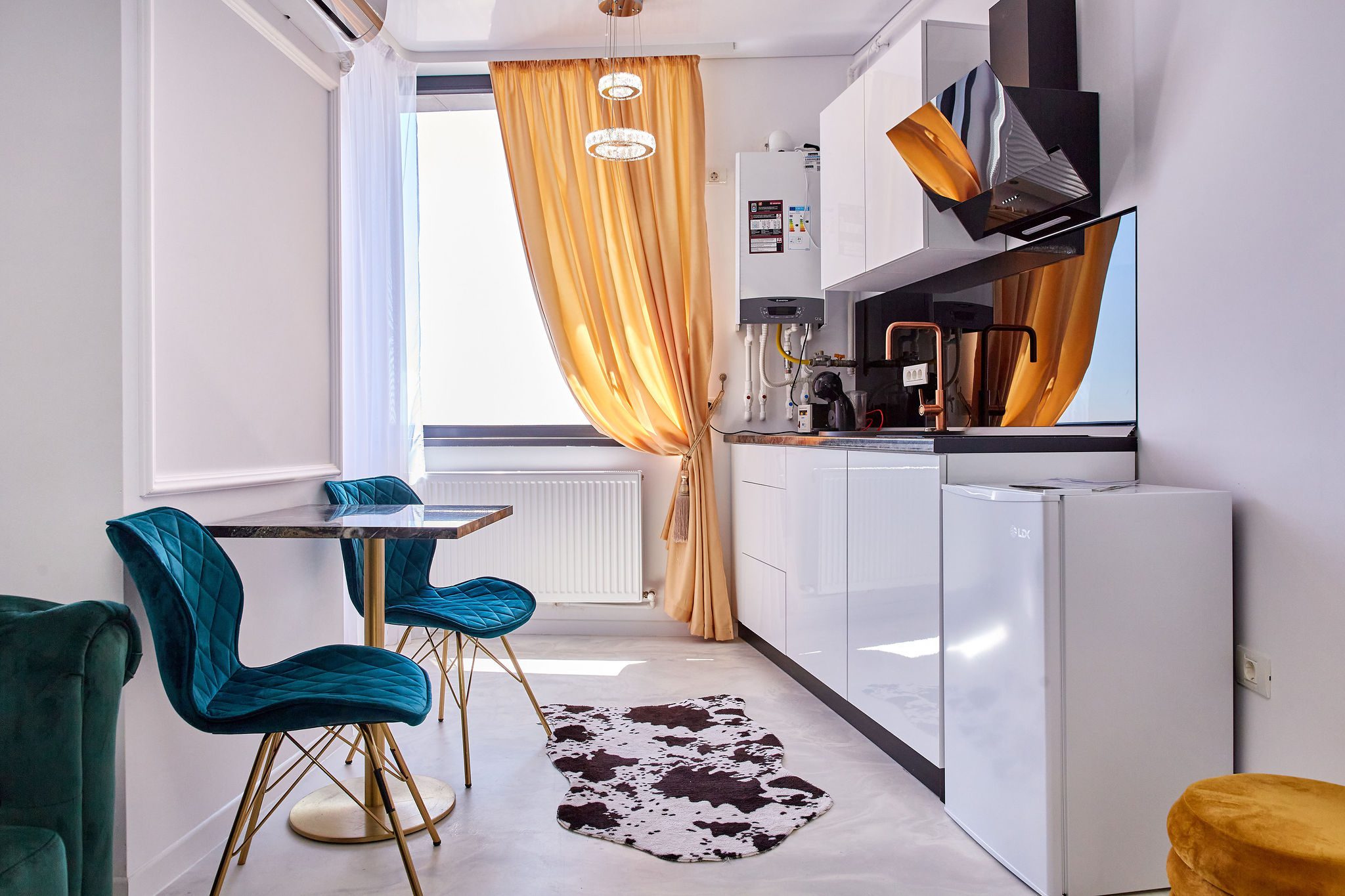 Sufragerie: Sufrageria open space a apartamentului De Beni strălucește de lux și rafinament. Canapeaua extensibilă, într-o nuanță vibrantă de verde smarald, realizată din catifea, oferă un contrast sofisticat cu finisajele camerei. În fața canapelei, un televizor modern completează zona de relaxare, oferind un loc ideal pentru a vă destinde după o zi lungă.