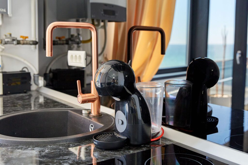 Bucătărie: Bucătăria, în același ton de lux, este echipată cu cele mai noi aparate și utilități. Contoarele lustruite și mobilierul elegant demonstrează un simț al detaliului și al calității. Dotările includ o plita electrica moderna, aparat de cafea, un frigider spațios și alte ustensile esențiale pentru gătit, făcând din gătit o adevărată plăcere.
