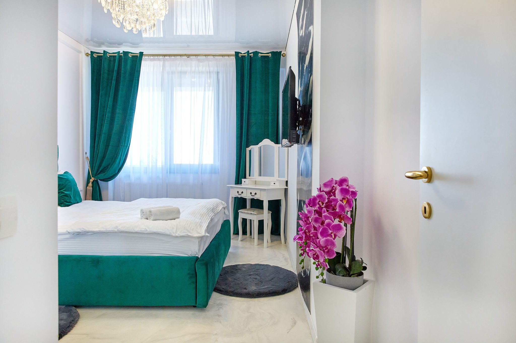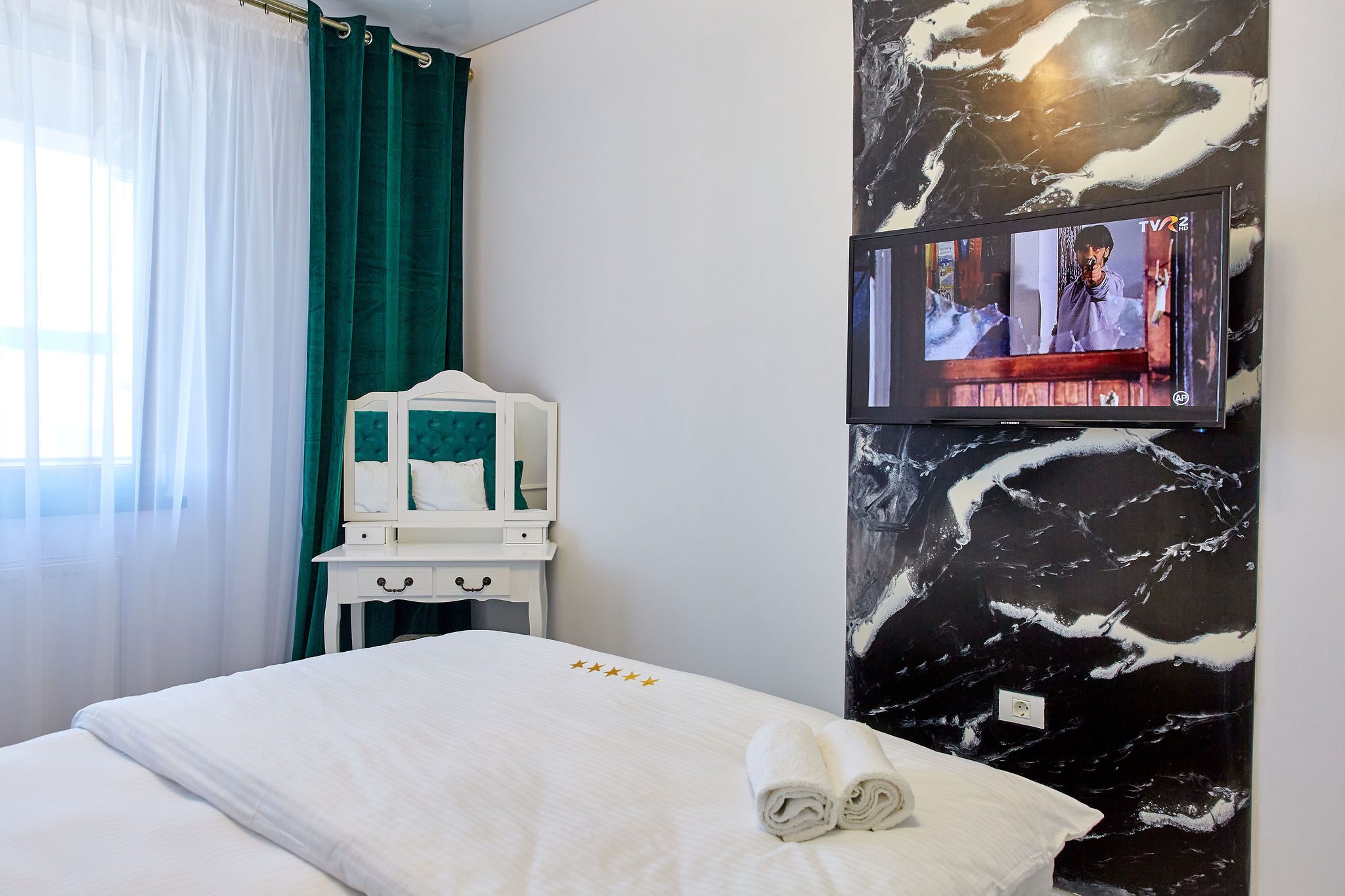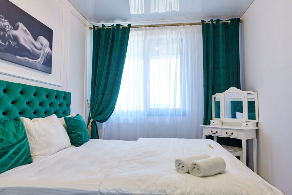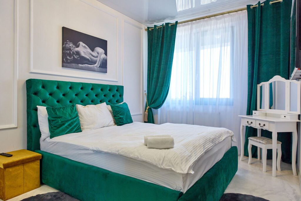 Dormitor: Dormitorul, un adevărat refugiu, păstrează aceeași temă de verde smarald, cu un pat matrimonial generos și draperii asortate. Lenjeria alba pe pat adaugă un plus de eleganță și contrast. Televizorul modern montat pe perete permite vizionarea emisiunilor preferate direct din confortul patului.