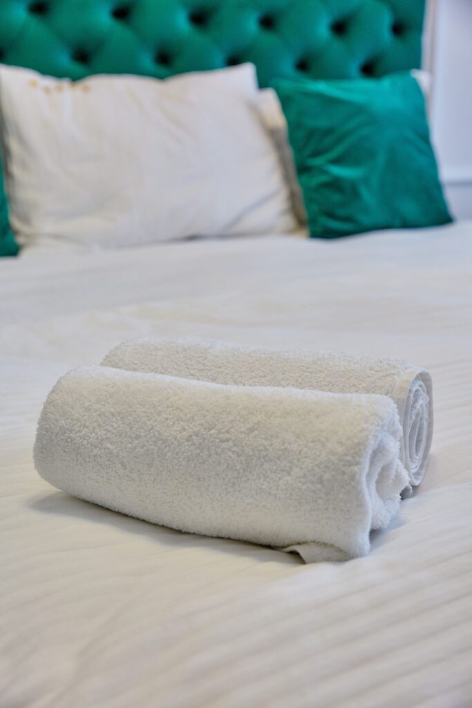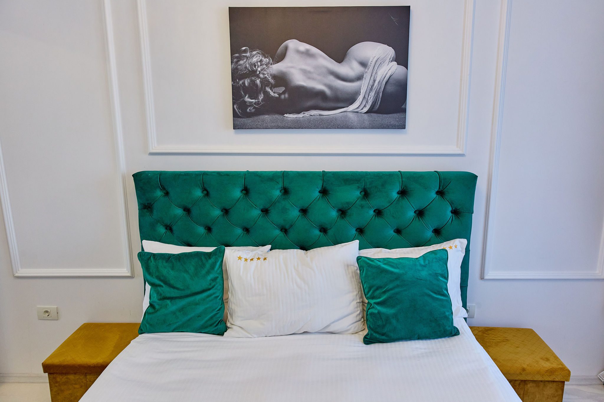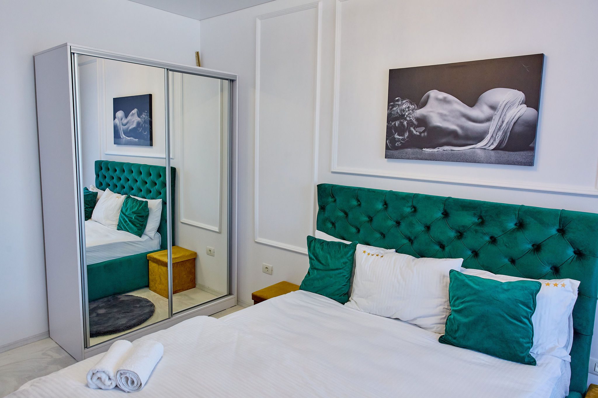 Dormitor: Dormitorul, un adevărat refugiu, păstrează aceeași temă de verde smarald, cu un pat matrimonial generos și draperii asortate. Lenjeria alba pe pat adaugă un plus de eleganță și contrast. Televizorul modern montat pe perete permite vizionarea emisiunilor preferate direct din confortul patului.