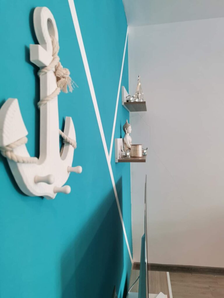 În apartamentul Sims din Complexul Alezzi, sufrageria cu design open space emană o atmosferă calmă și echilibrată. Canapeaua extensibilă, în nuanțe de gri, se potrivește perfect cu peretele albastru, creând un contrast plăcut și invitant. Acest spațiu este ideal pentru relaxare și socializare, fiind punctul central al apartamentului.