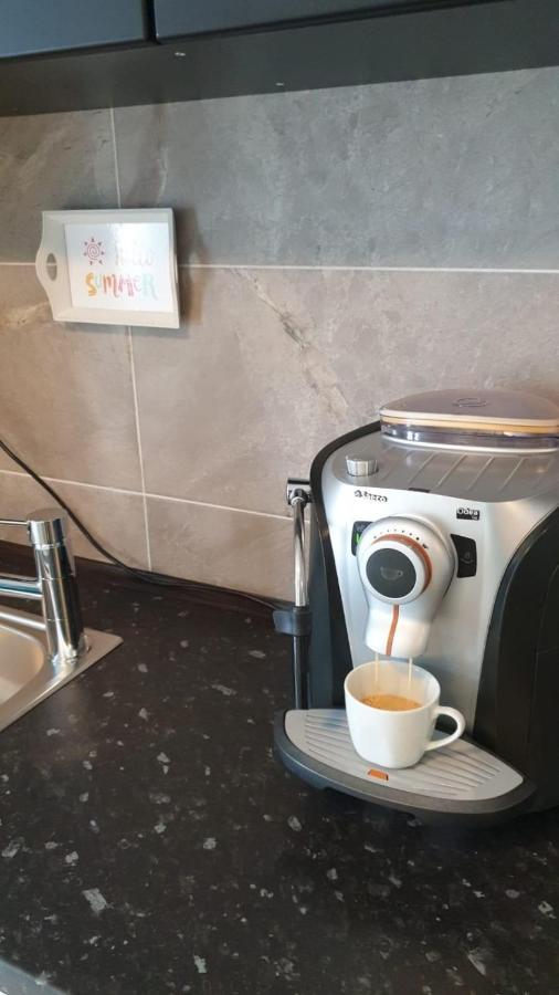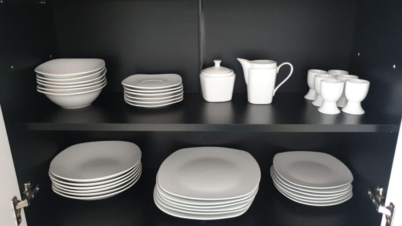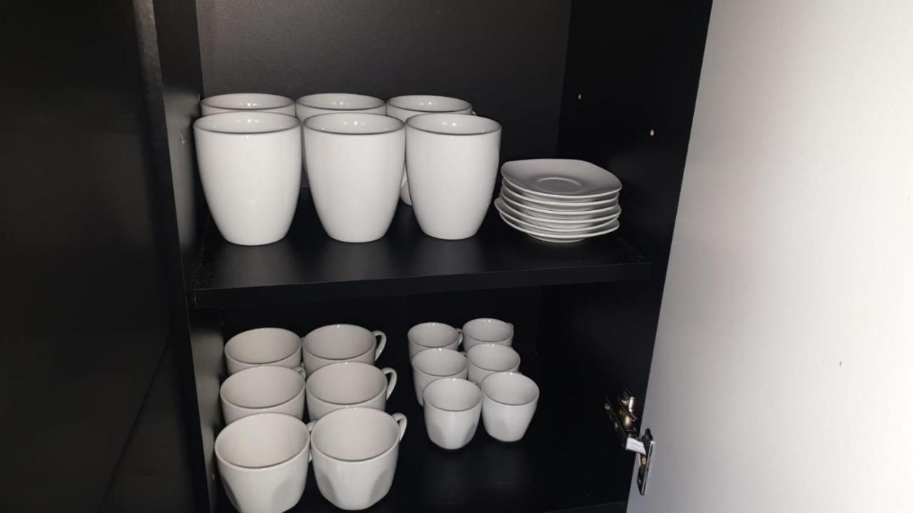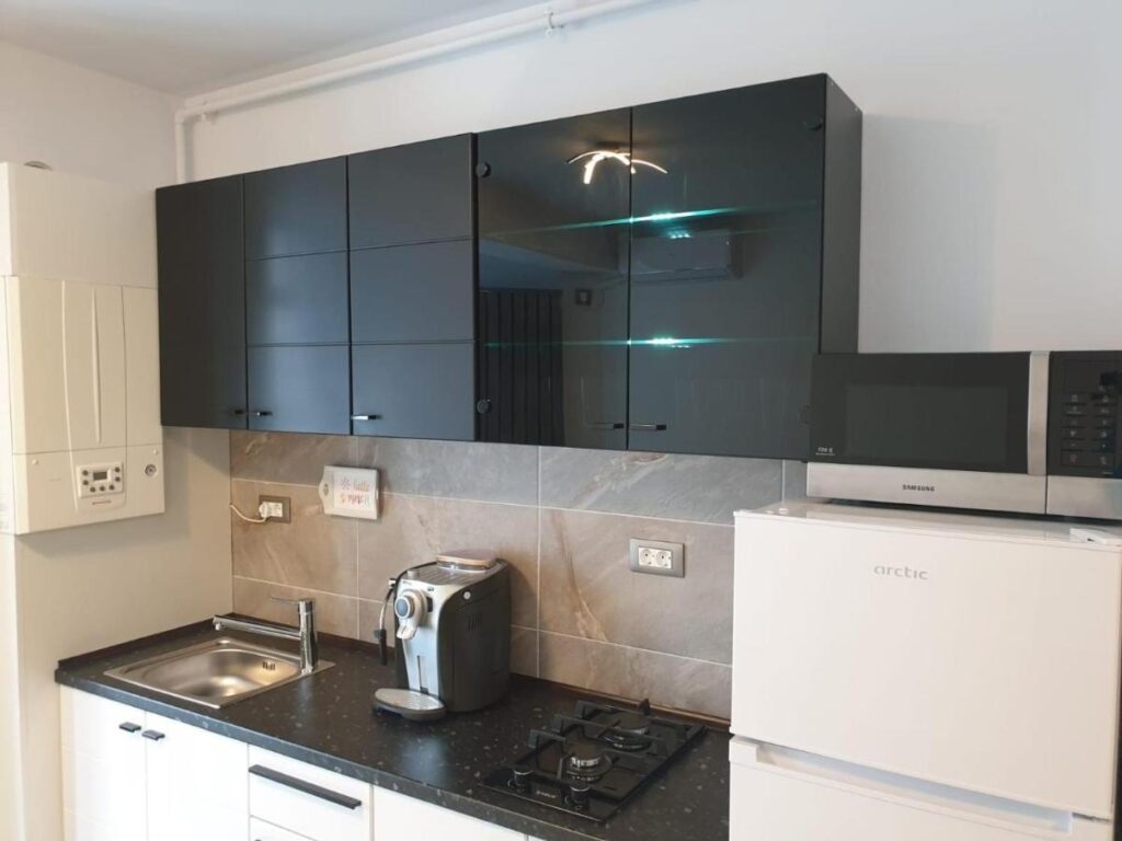 Bucătăria, cu design modern, se mândrește cu mobilier în tonuri de alb și negru, oferind un aspect curat și elegant. Dotată cu toate utilitățile esențiale pentru gătit, bucatăria dispune de aragaz , aparat de cafea , cuptor cu microunde, frigider dar și de o masă de servit mesele, unde poți savura micul dejun sau o cină în familie. Cromatica alb-negru aduce un plus de stil și rafinament spațiului.