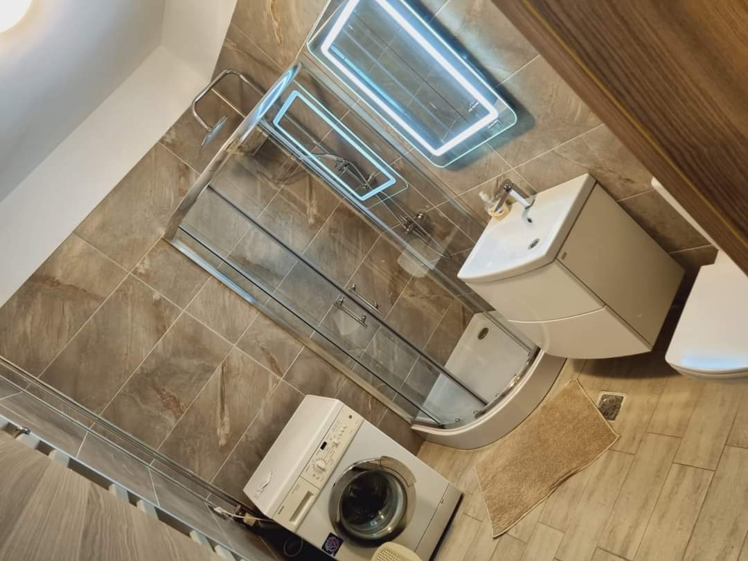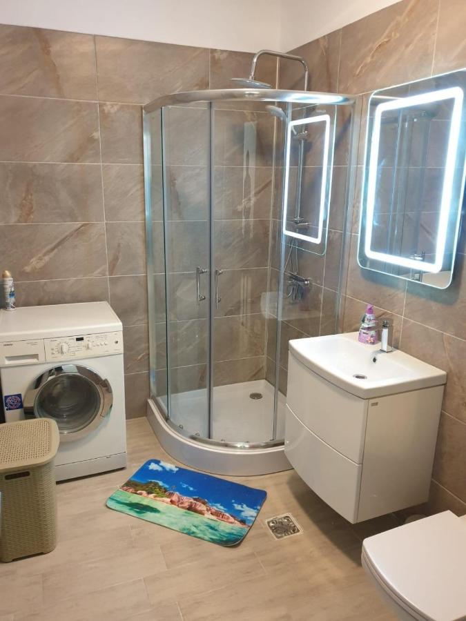 Baia, cu un design modern și practic, este dotată cu o cabină de duș și o mașină de spălat. Combinația de culori și materiale folosite reflectă bunul gust și atenția la detalii, asigurând un spațiu plăcut și funcțional.
