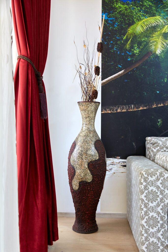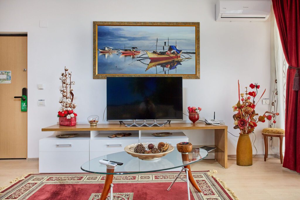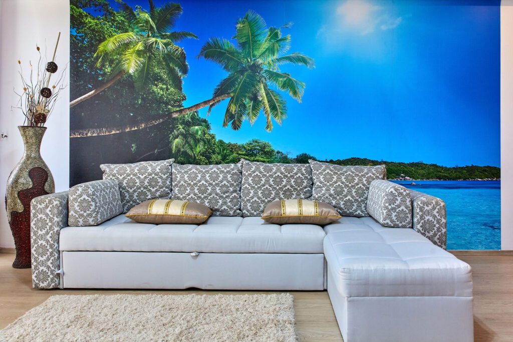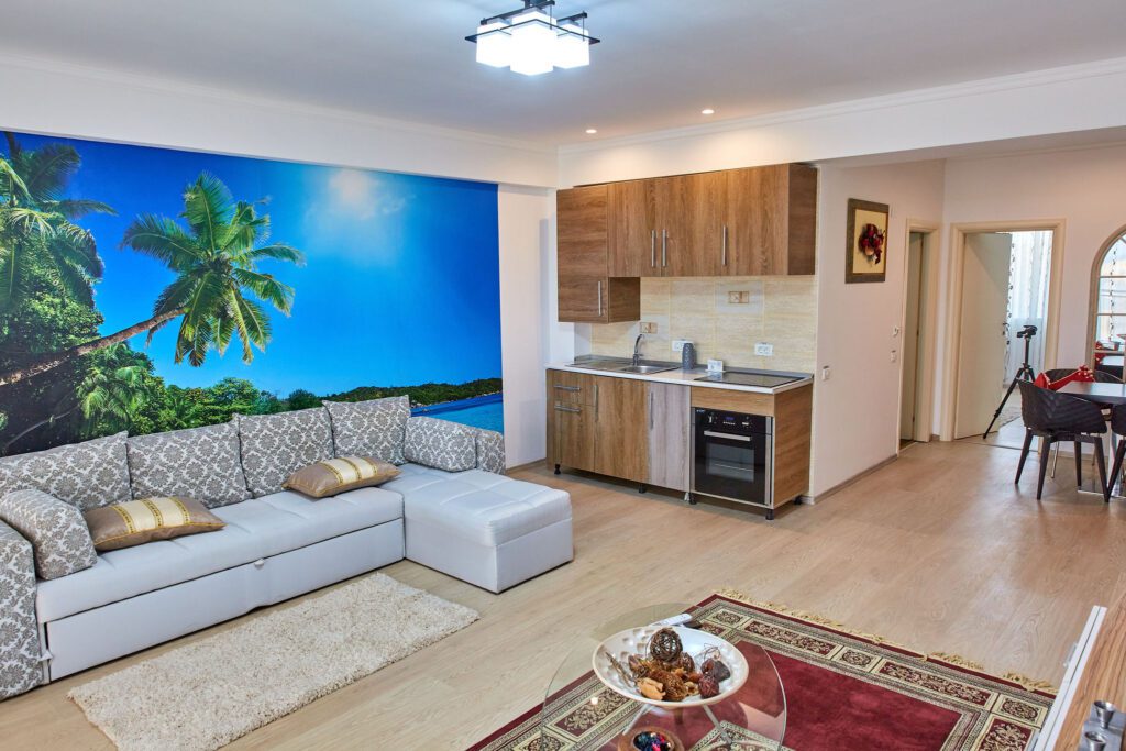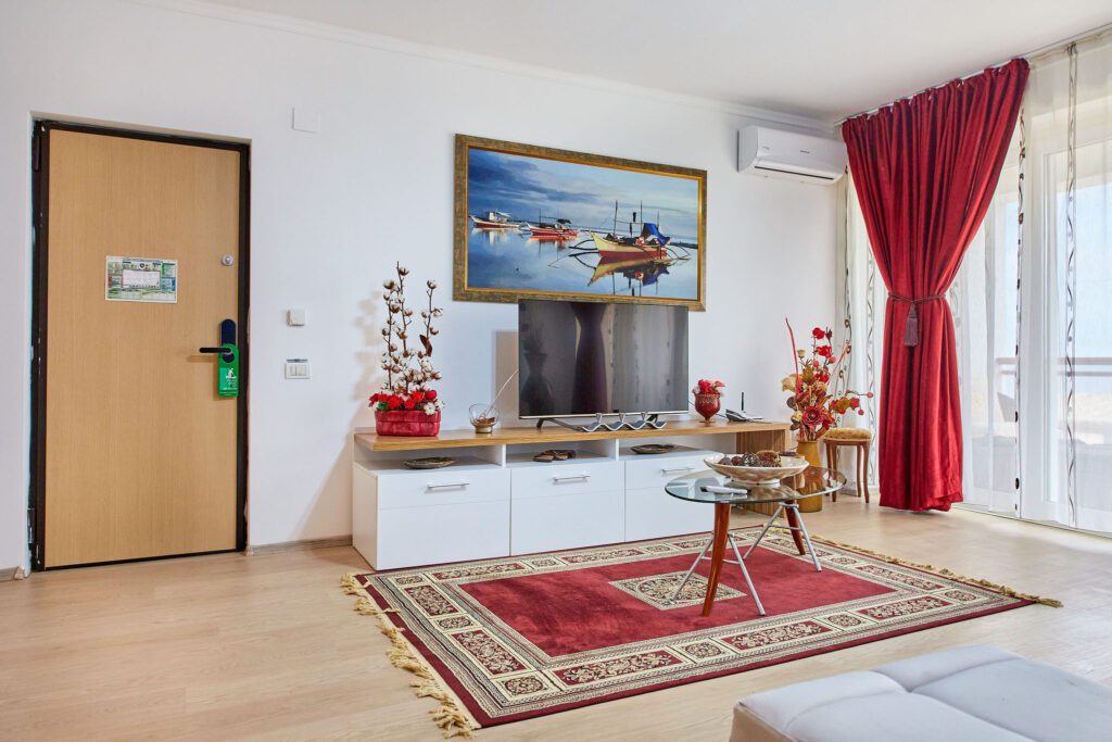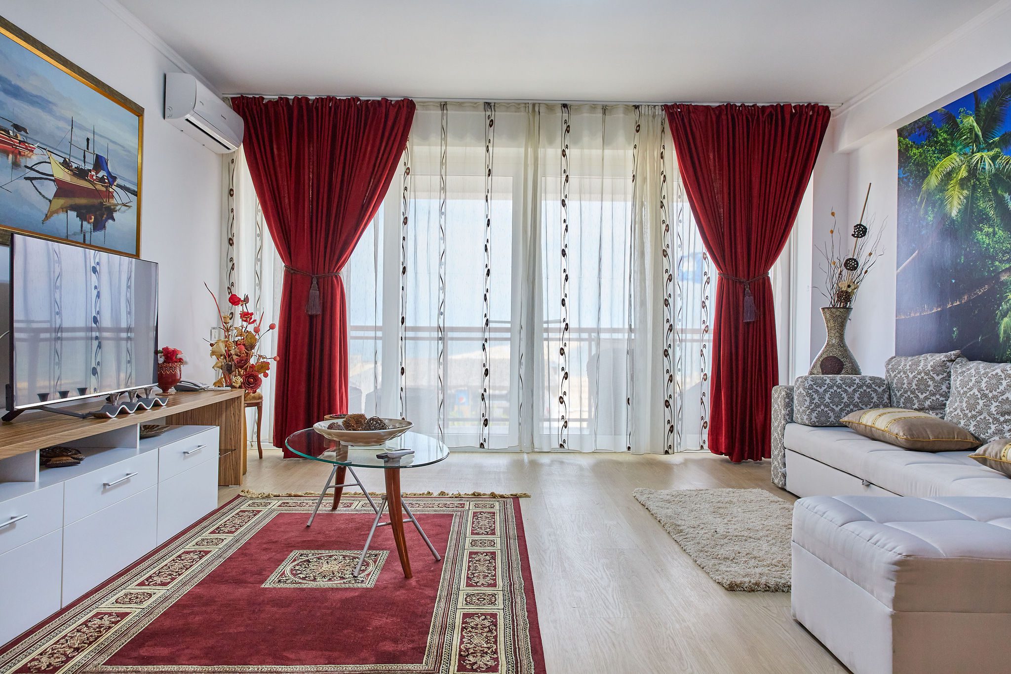 Sufrageria open space este spațiul principal al apartamentului și te întâmpină cu o canapea extensibilă într-o nuanță deschisă, invitând la momente de relaxare. În spatele acesteia, un tapet impresionant cu palmieri și mări albastre adaugă o notă tropicală și evocă sentimentul unei vacanțe perpetue. Elementul central al camerei este mobilierul alb, pe care este așezat un televizor. În fața canapelei, un covor roșu în stil rustic adaugă un contrast puternic și aduce o notă de autenticitate. Draperiile roșii completează designul, oferind intimitate și o atmosferă caldă.
