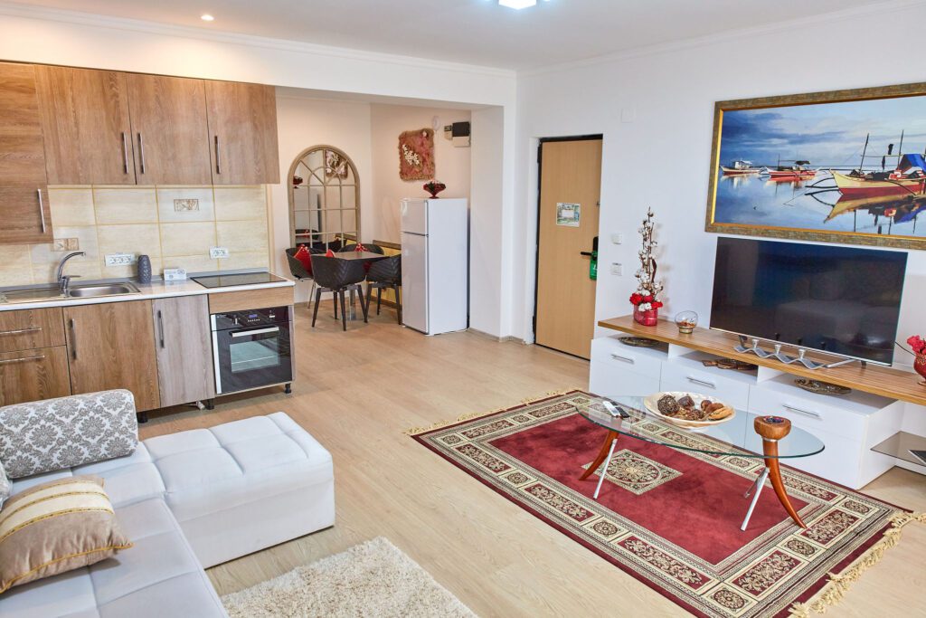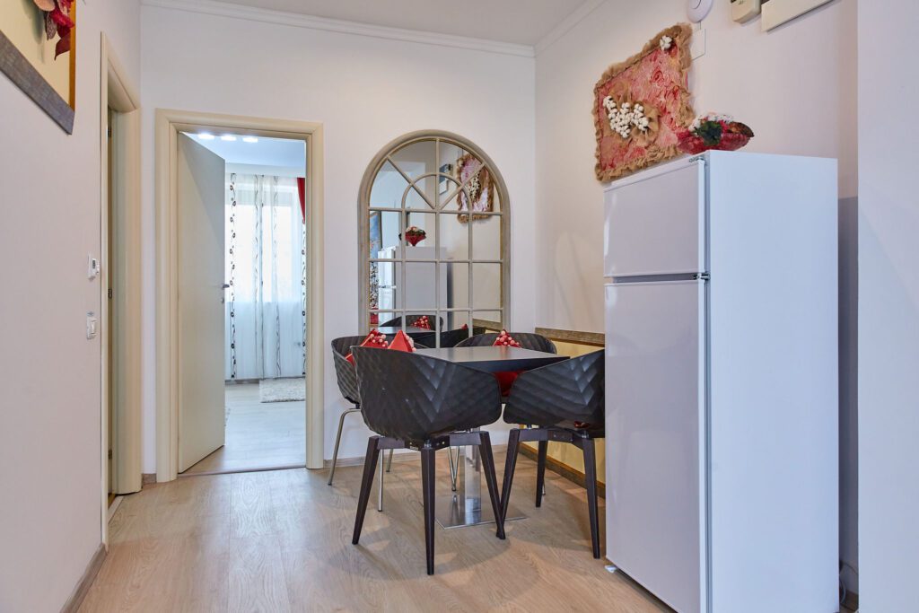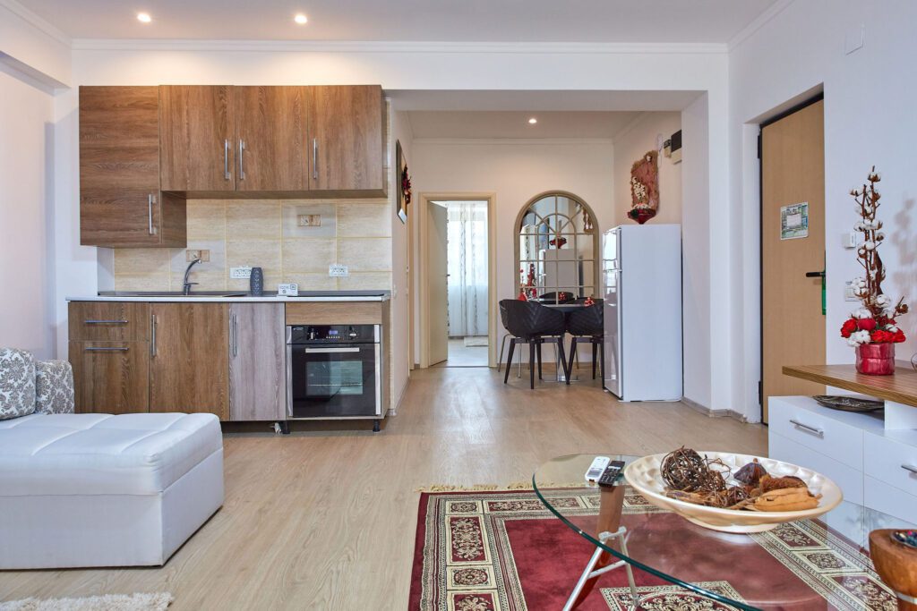Bucătăria se remarcă prin mobilierul din lemn, care îmbină funcționalitatea cu estetica. Bucataria este doatata cu plita electrica moderna si cuptor, de asemenea veti gasi vesela.Acest spațiu este completat de o masă neagră, modernă, însoțită de scaune în aceeași nuanță, oferind locul perfect pentru servirea meselor.