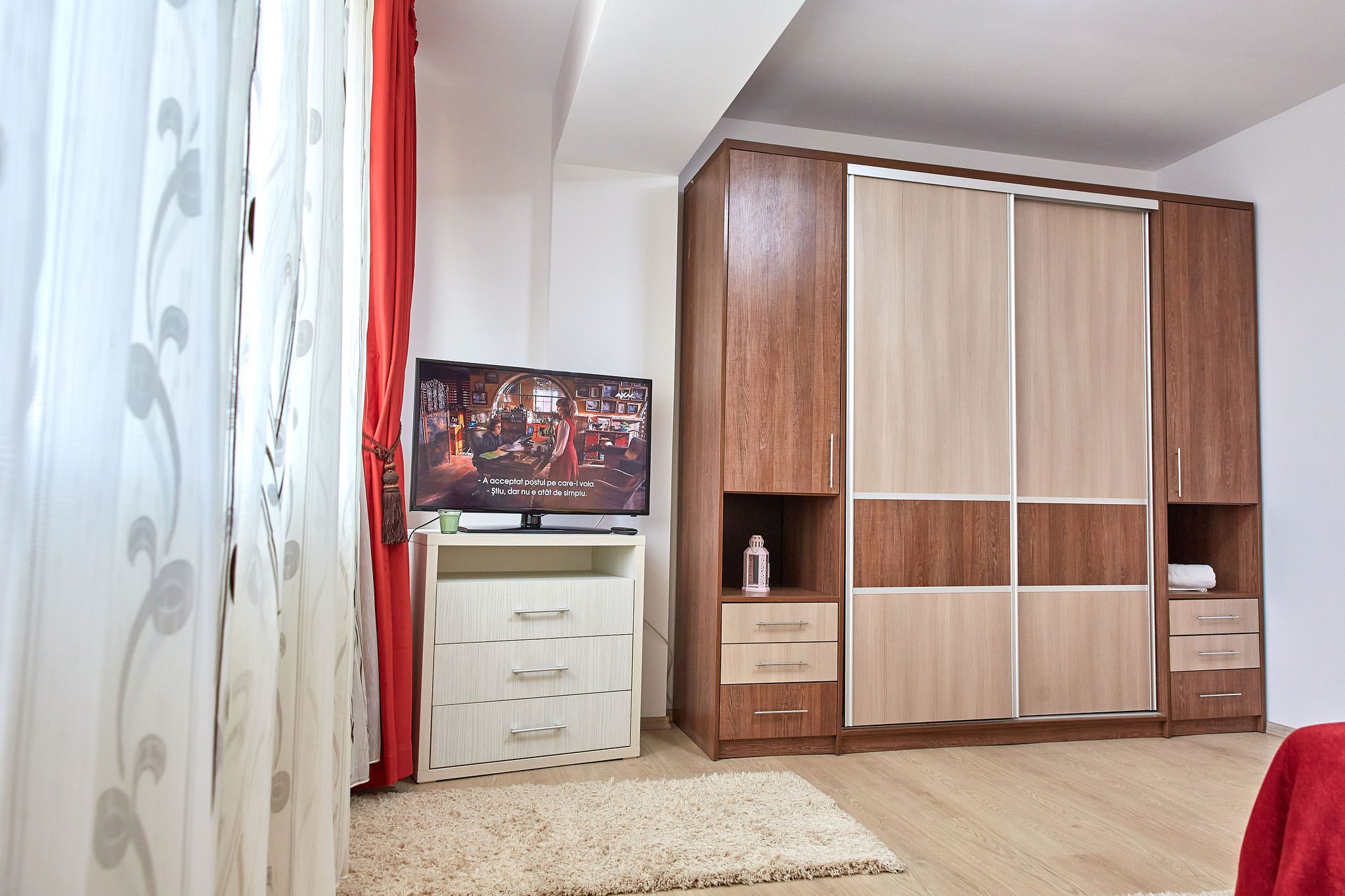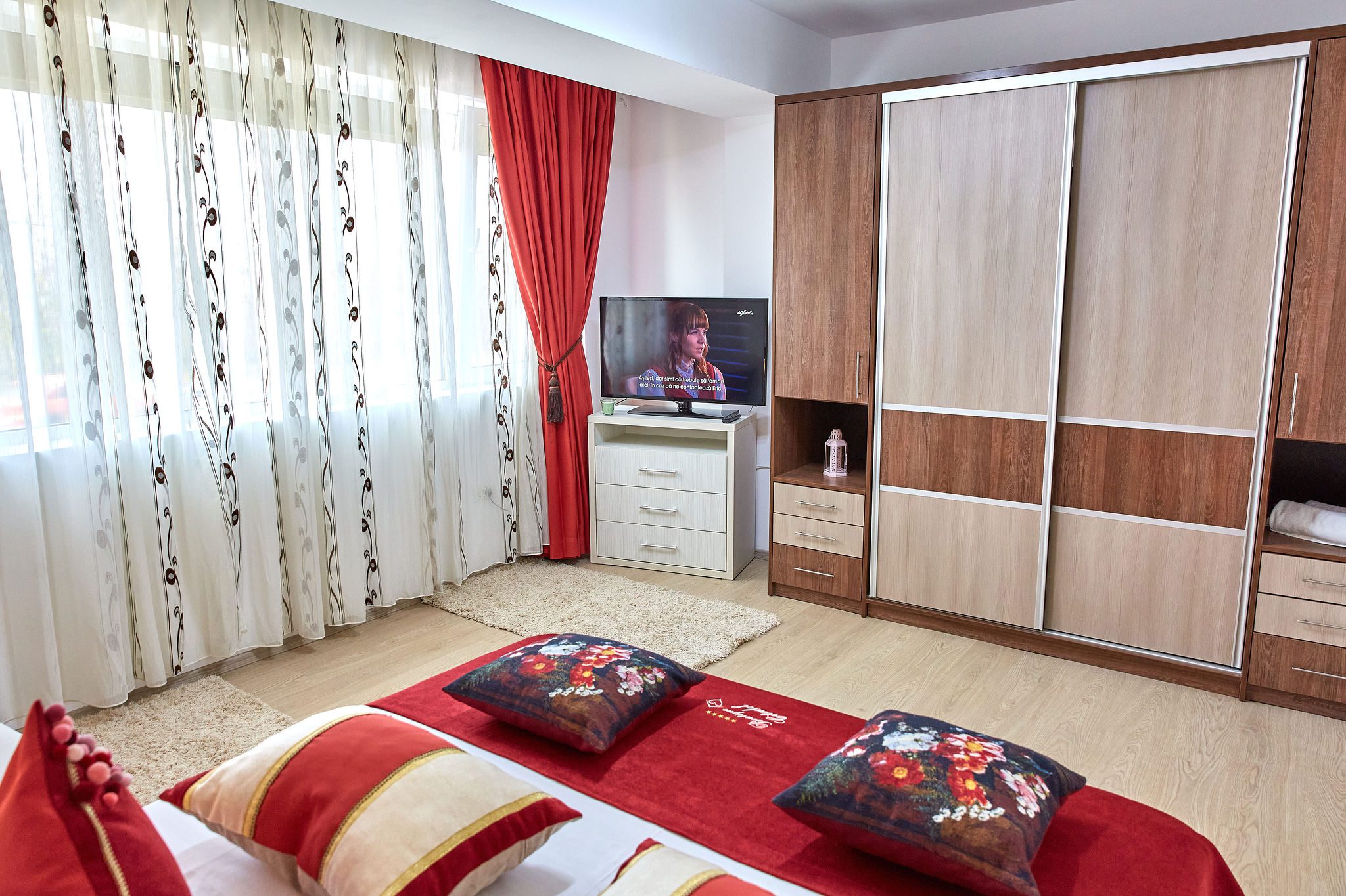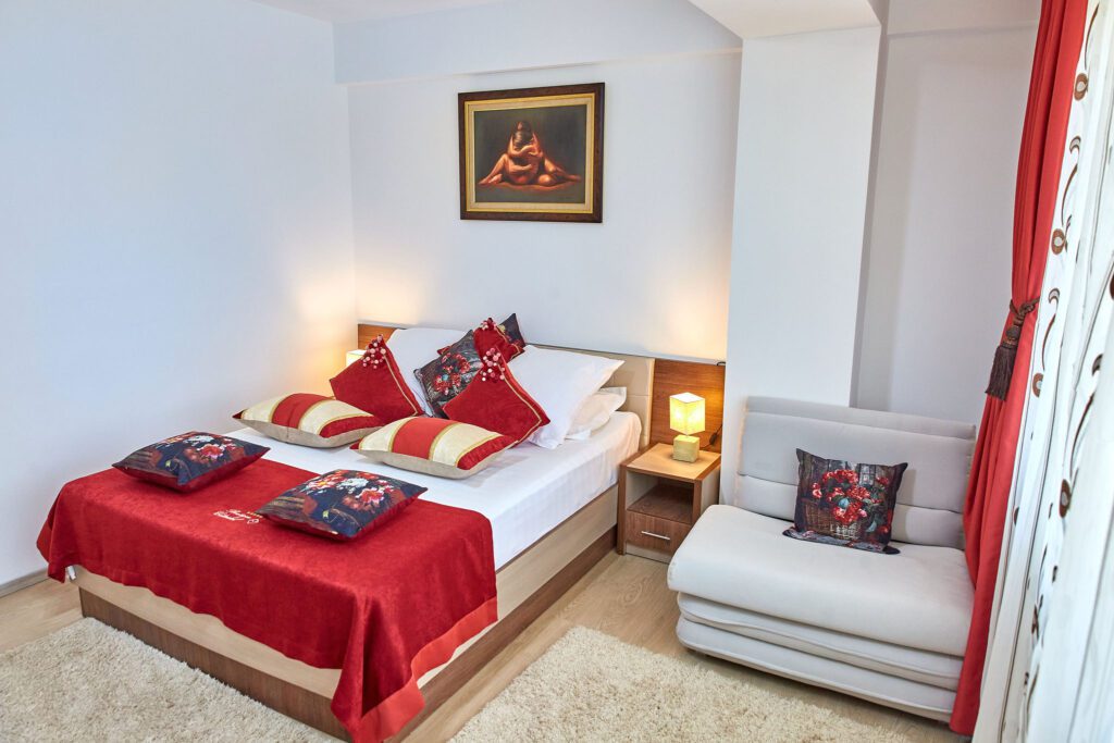 Dormitorul emană pasiune și confort. Patul matrimonial, cu lenjerie roșie, te invită la odihnă și relaxare. În fața patului, un televizor oferă divertisment, iar dressingul generos asigură spațiul necesar pentru depozitarea lucrurilor personale. Draperiile roșii, în aceeași nuanță cu lenjeria, aduc o notă de coerență în design.
