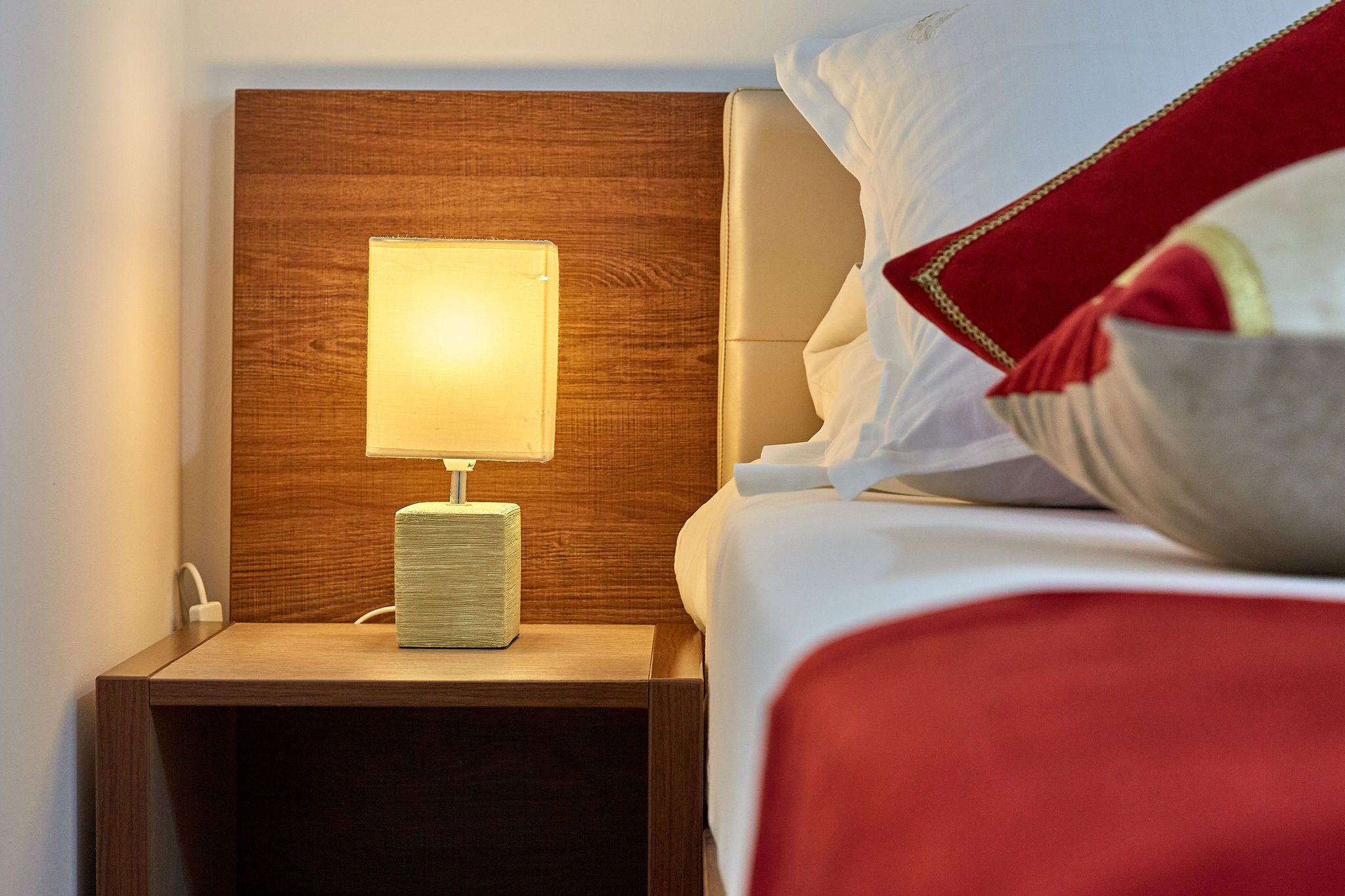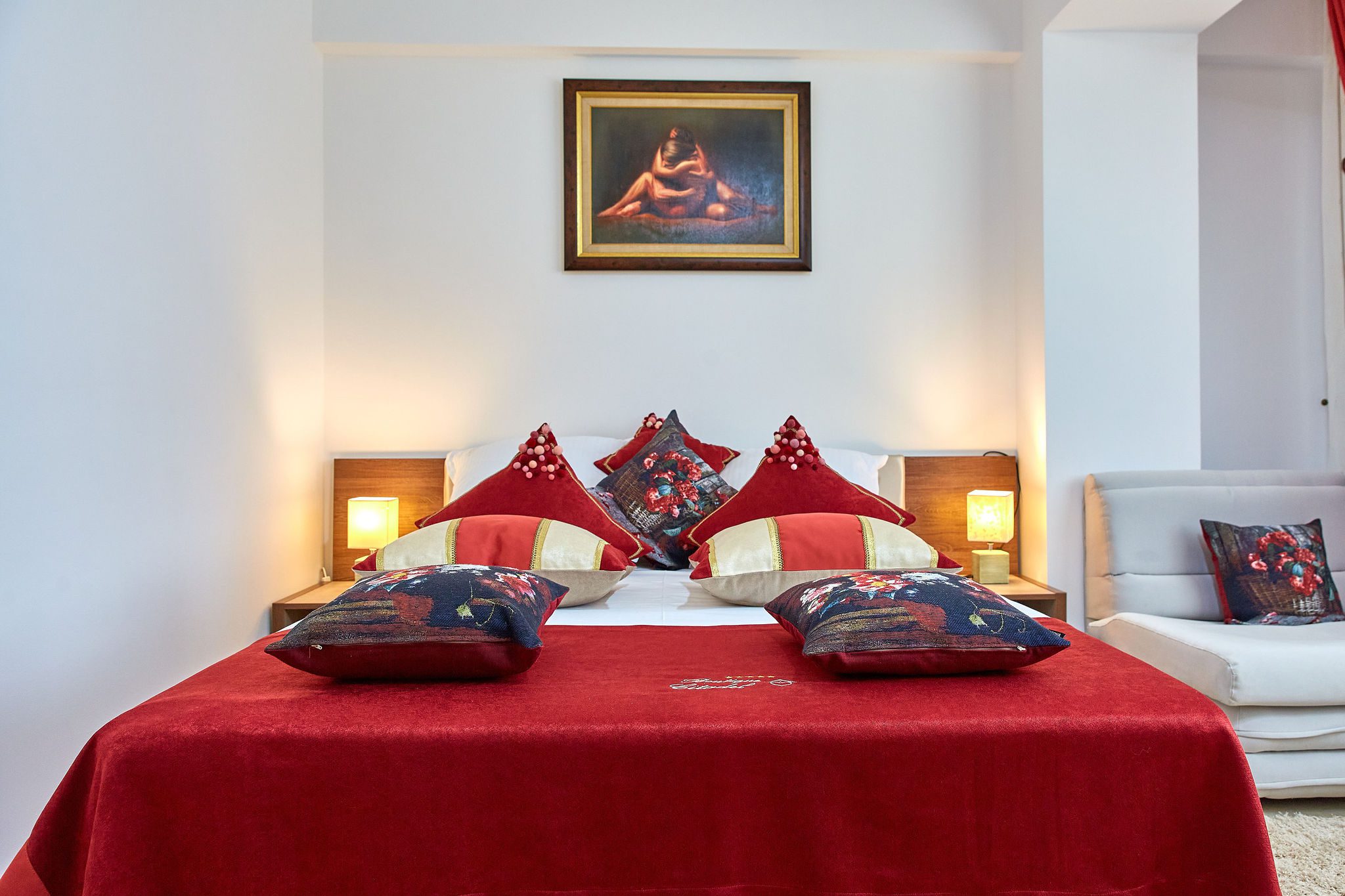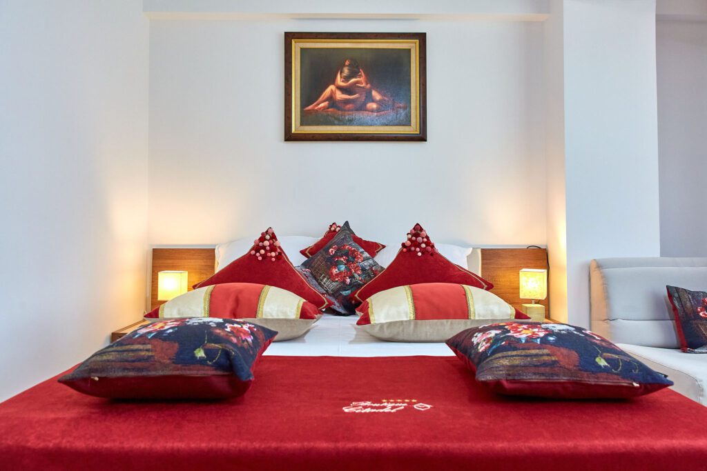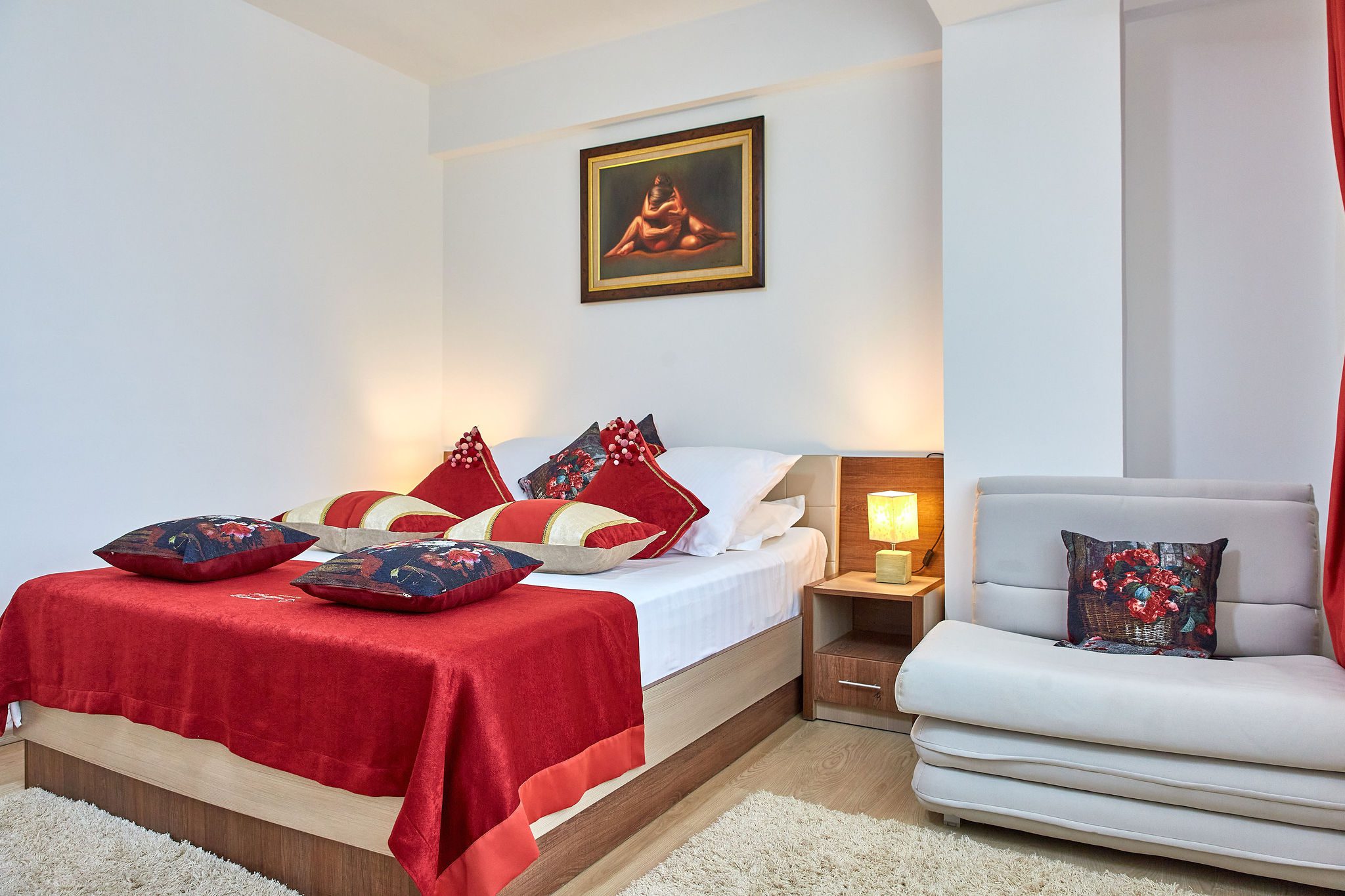 Dormitorul emană pasiune și confort. Patul matrimonial, cu lenjerie roșie, te invită la odihnă și relaxare. În fața patului, un televizor oferă divertisment, iar dressingul generos asigură spațiul necesar pentru depozitarea lucrurilor personale. Draperiile roșii, în aceeași nuanță cu lenjeria, aduc o notă de coerență în design.