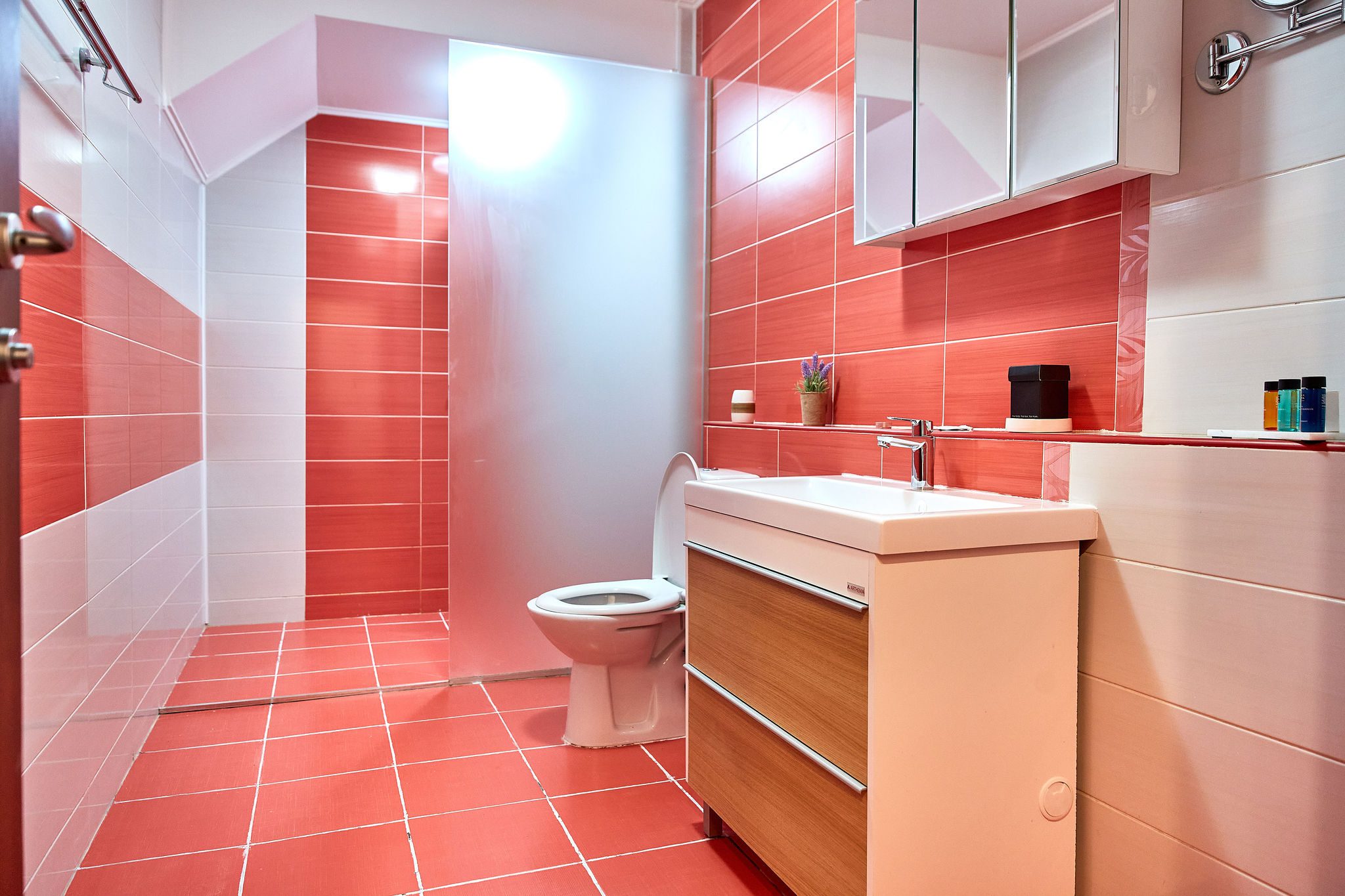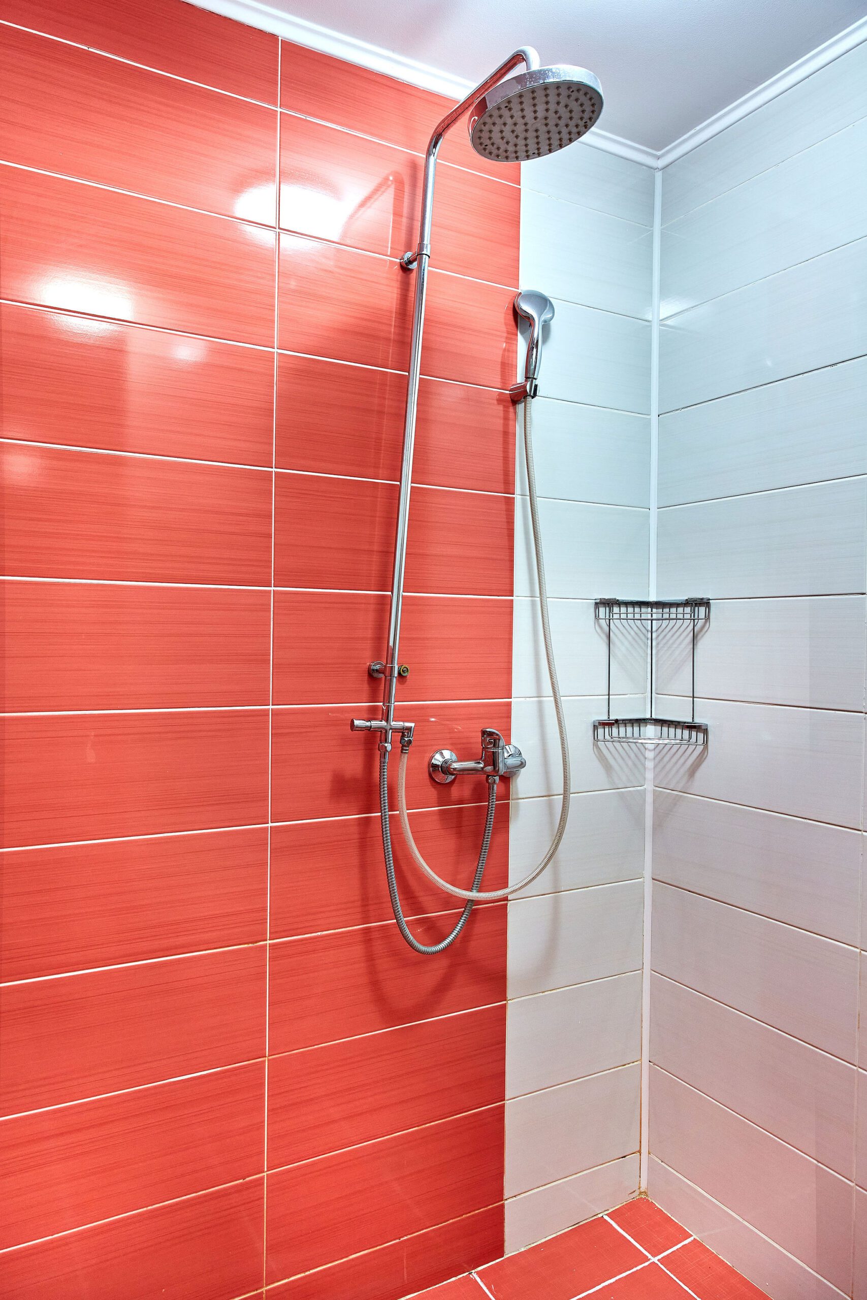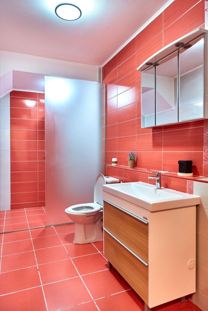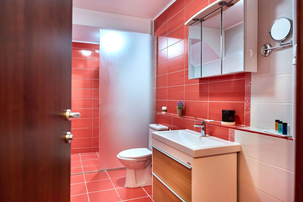 Baia combină faianta roșie cu mobilierul alb, creând un echilibru cromatic plăcut și modern. Dusul promite momente de răsfăț, iar mobilierul alb adaugă un plus de eleganță și funcționalitate.