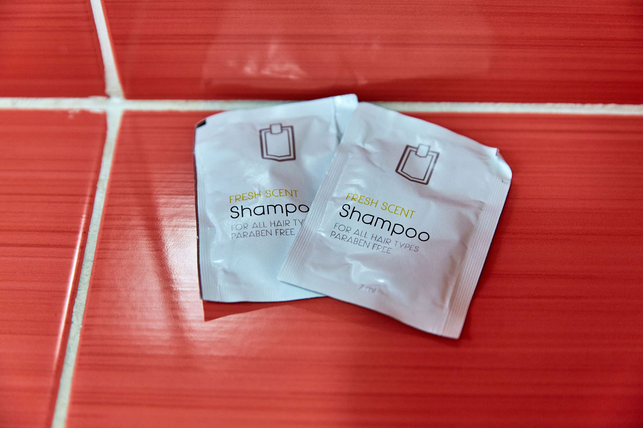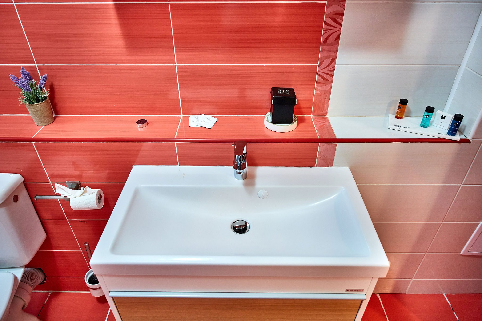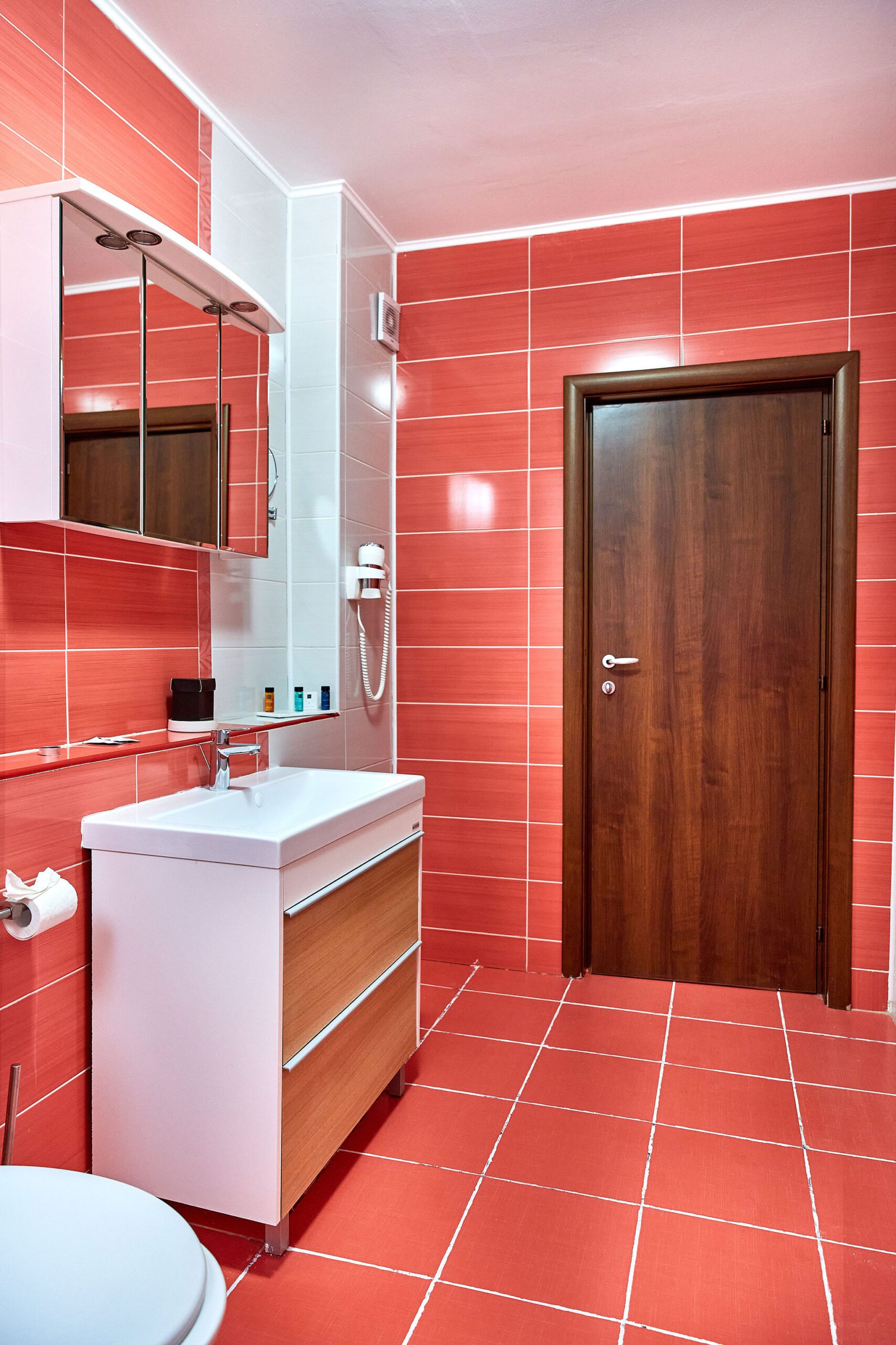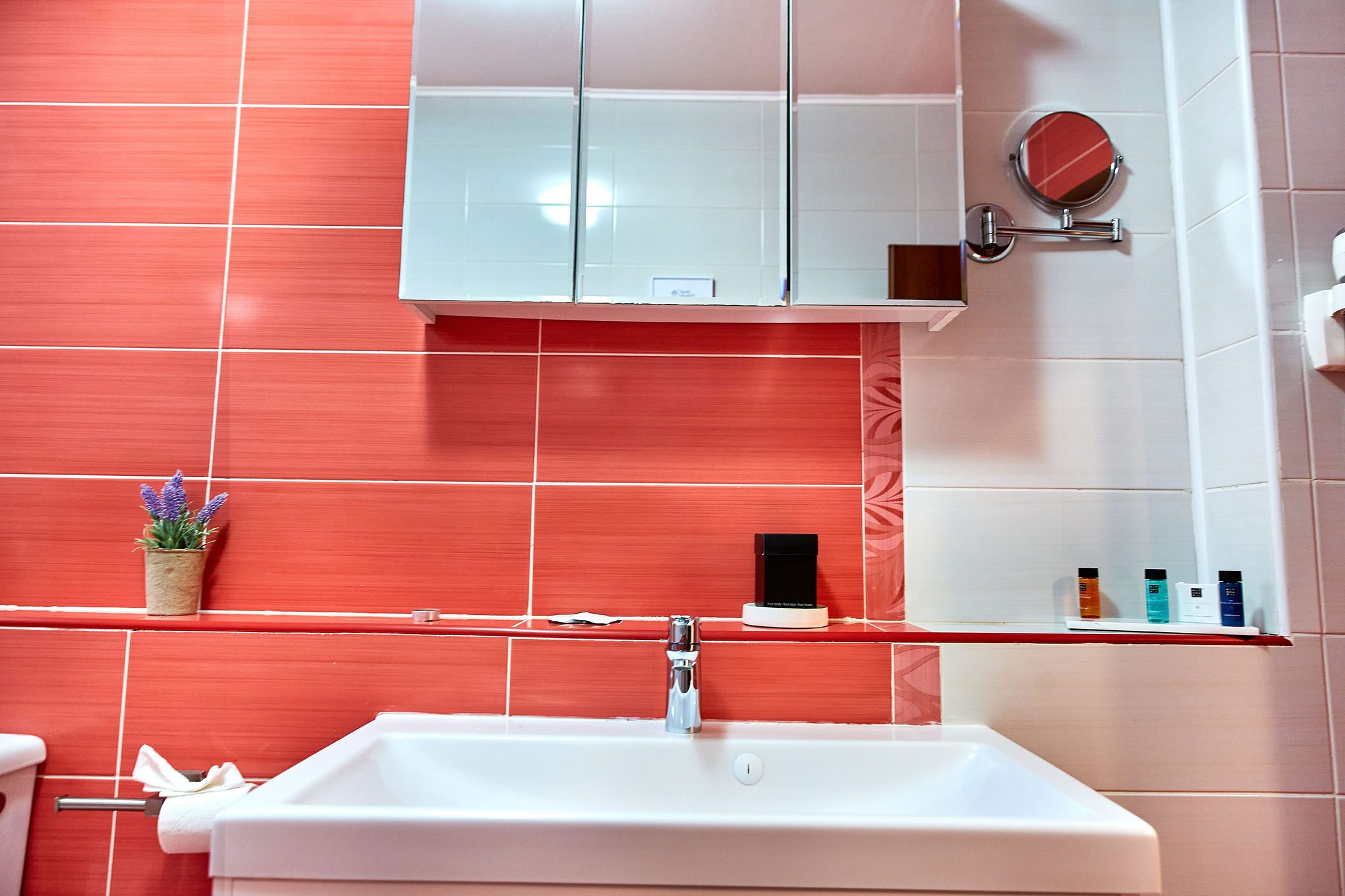 Baia combină faianta roșie cu mobilierul alb, creând un echilibru cromatic plăcut și modern. Dusul promite momente de răsfăț, iar mobilierul alb adaugă un plus de eleganță și funcționalitate.