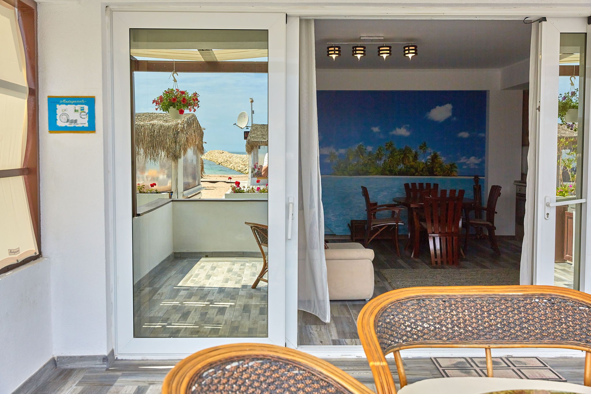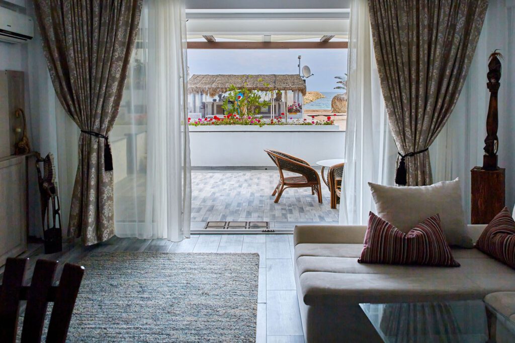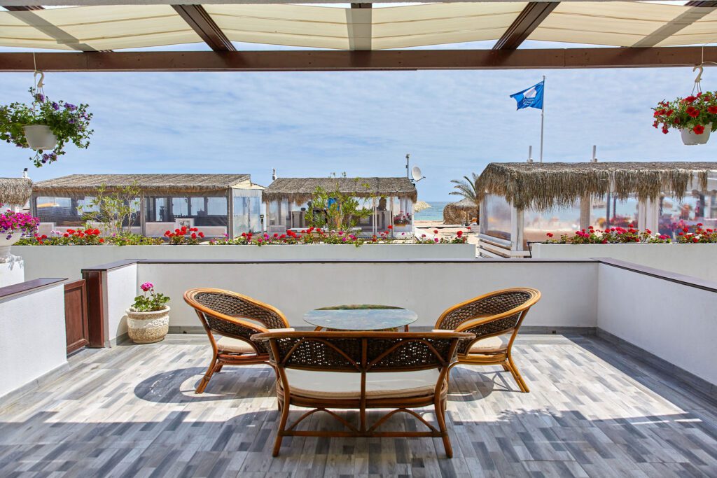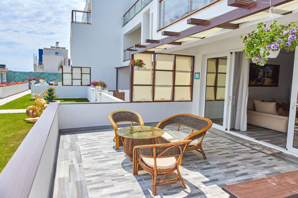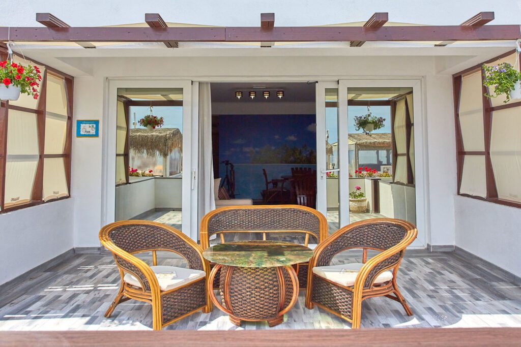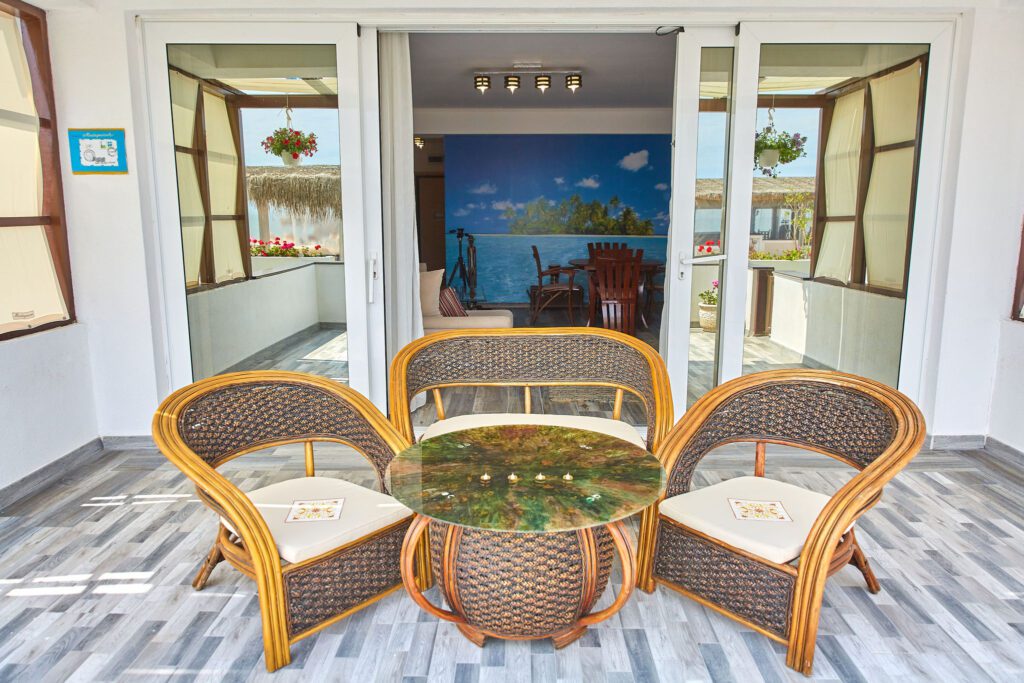 Balconul este cu adevărat special, oferind o priveliște directă către mare, fiind situat chiar pe plajă. Este locul perfect pentru a admira răsăritul sau apusul, având un mobilier ales cu grijă pentru a completa perfect atmosfera paradisiacă.