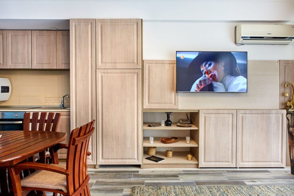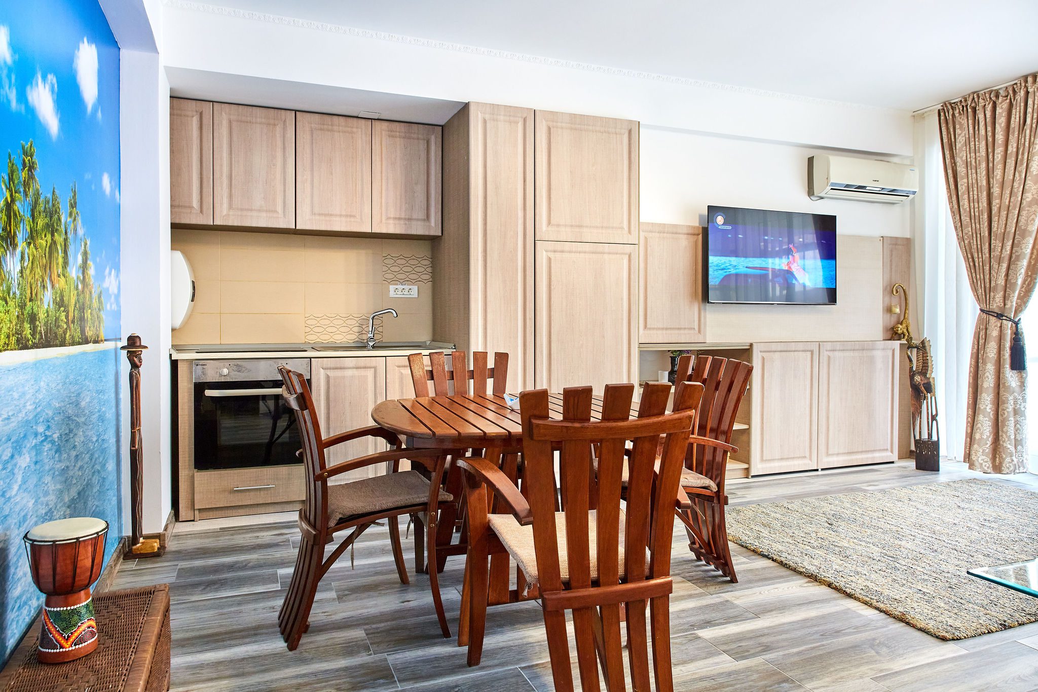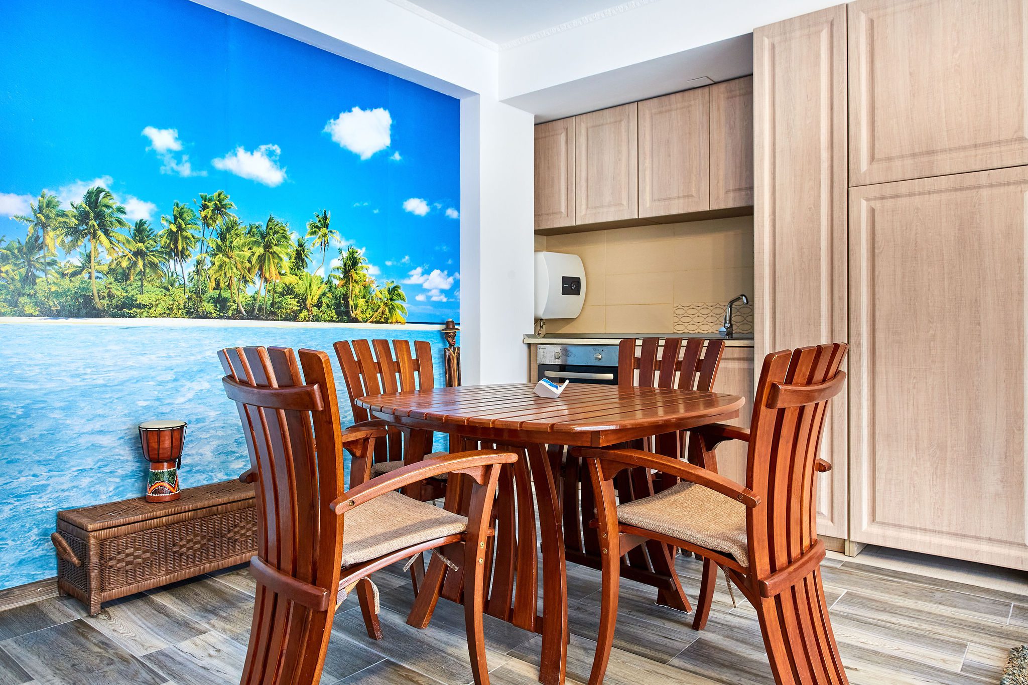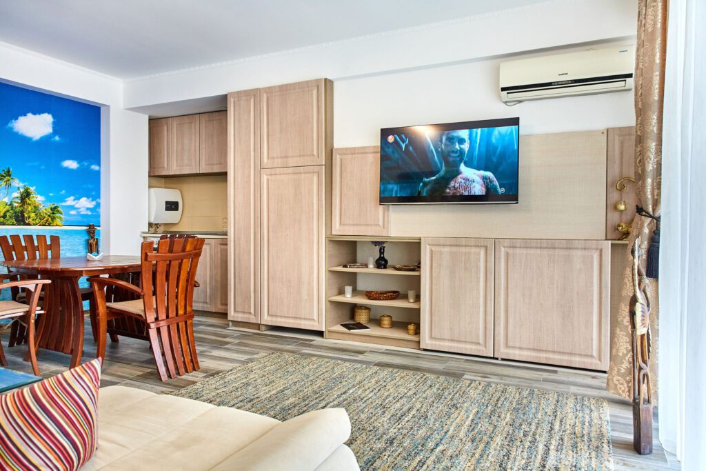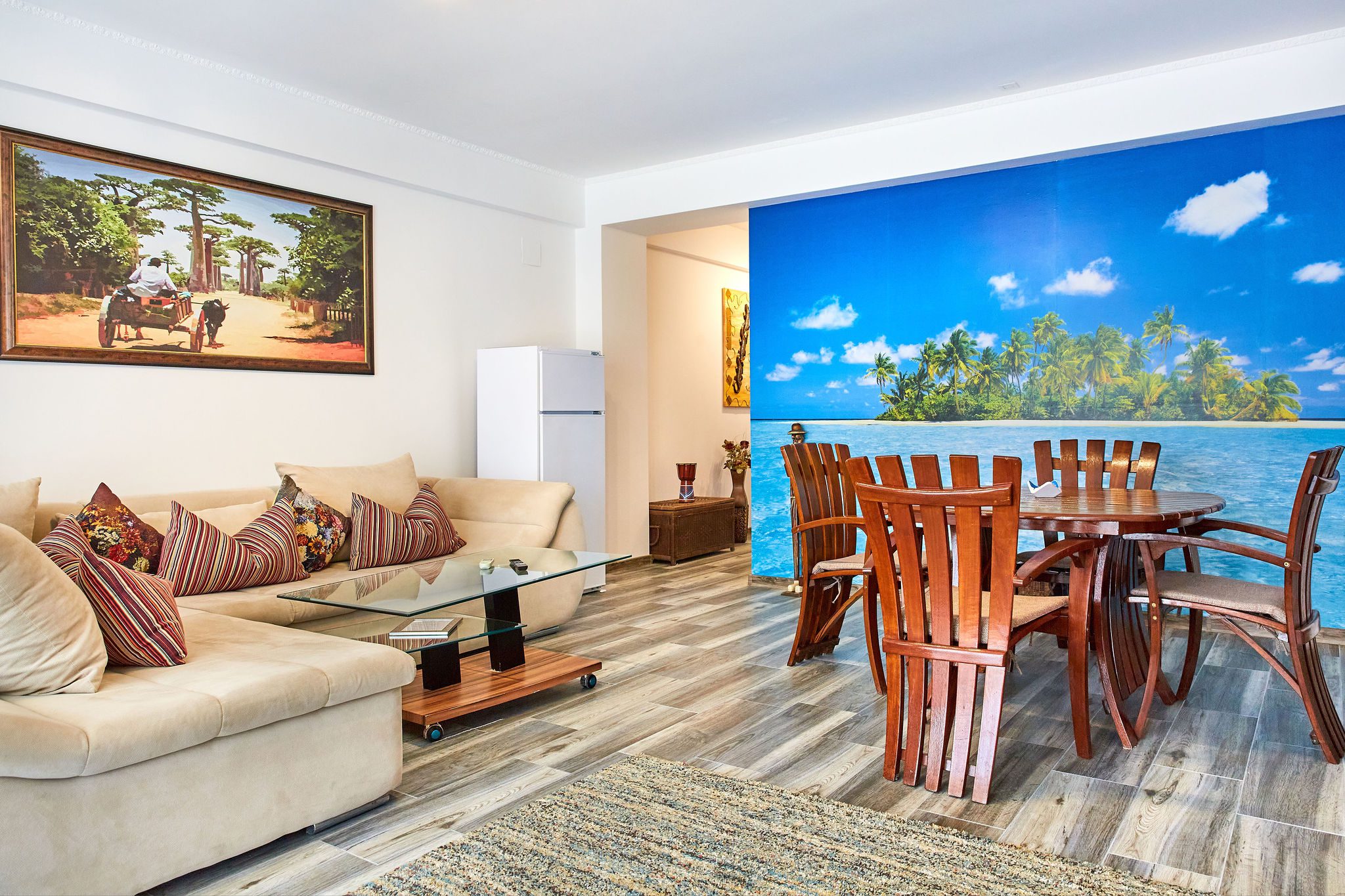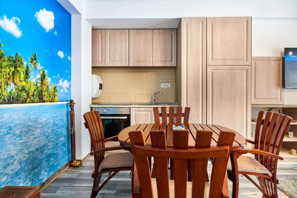 Sufrageria open space este luminată și spațioasă, centrata în jurul unei canapele extensibile de culoare deschisă. Pernele decorative adaugă un strop de culoare și personalitate. În dreapta canapelei, o masă cu scaune din lemn în stil exotic evocă esența unui refugiu tropical. Peretele adiacent este îmbrăcat într-un tapet impresionant ce înfățișează palmieri și mări albastre, creând astfel o atmosferă relaxantă și evocând paradisul tropical al Madagascarului.