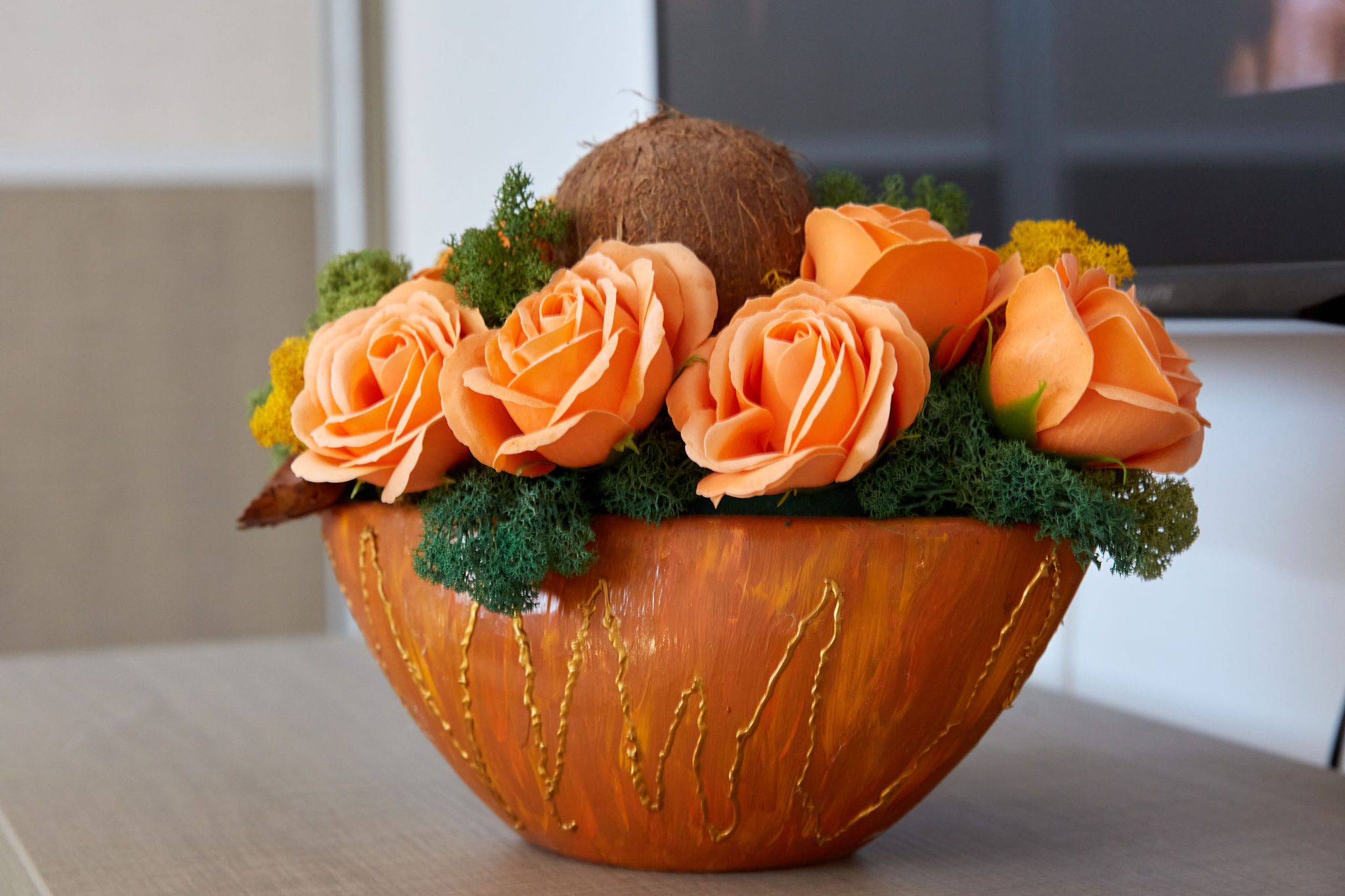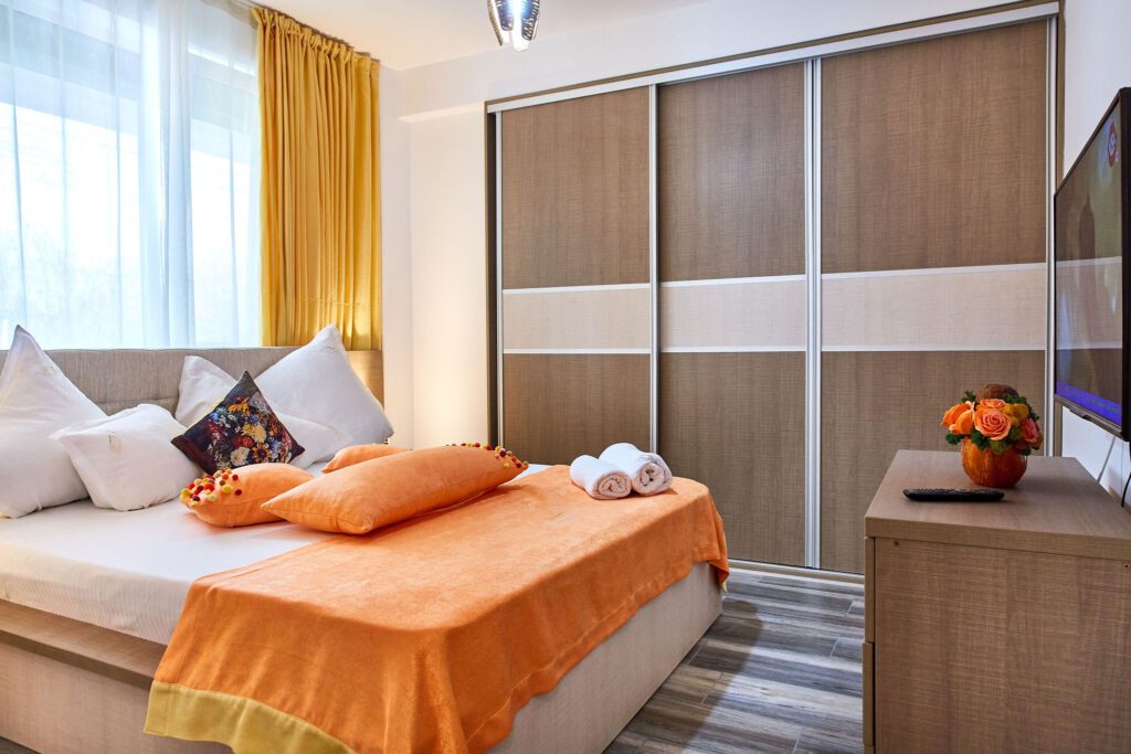 Dormitorul se distinge printr-o paletă cromatică dominată de bej, care emană liniște și confort. Patul matrimonial bej își invită oaspeții la odihnă, iar dressingul generos asigură tot spațiul necesar pentru depozitare. În fața patului, un televizor modern oferă divertisment. Draperiile galbene adaugă un strop de luminozitate și vioiciune în încăpere.