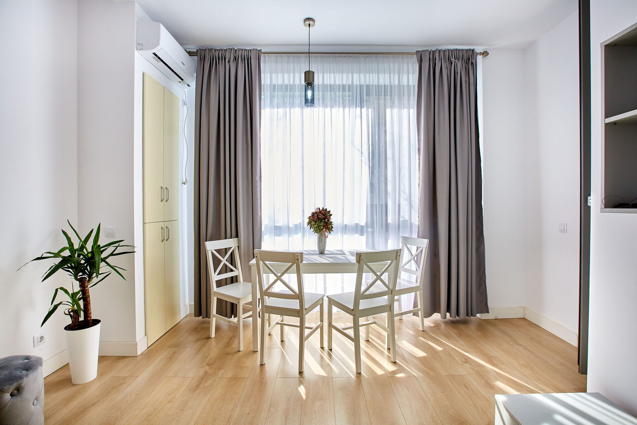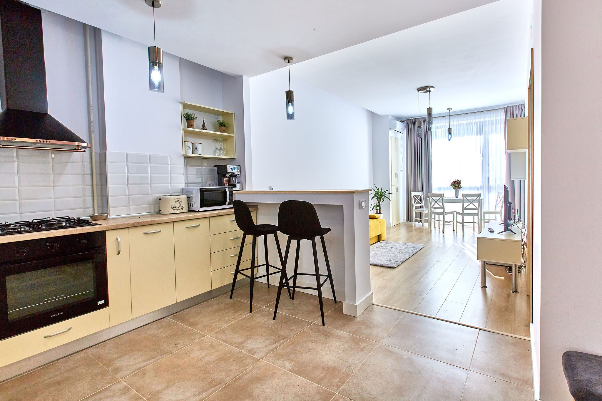 Sufrageria open space este definită de o canapea extensibilă galbenă, care adaugă un strop de culoare și vioiciune încăperii. În fața acesteia, un mobilier elegant găzduiește un televizor, oferind un colț de relaxare ideal pentru serile liniștite. În apropiere de fereastra ce inundă spațiul cu lumină naturală, o masă însoțită de scaune așteaptă să fie locul unde sunt servite mesele zilnice. Draperiile gri completează designul, oferind intimitate și un contrast plăcut.