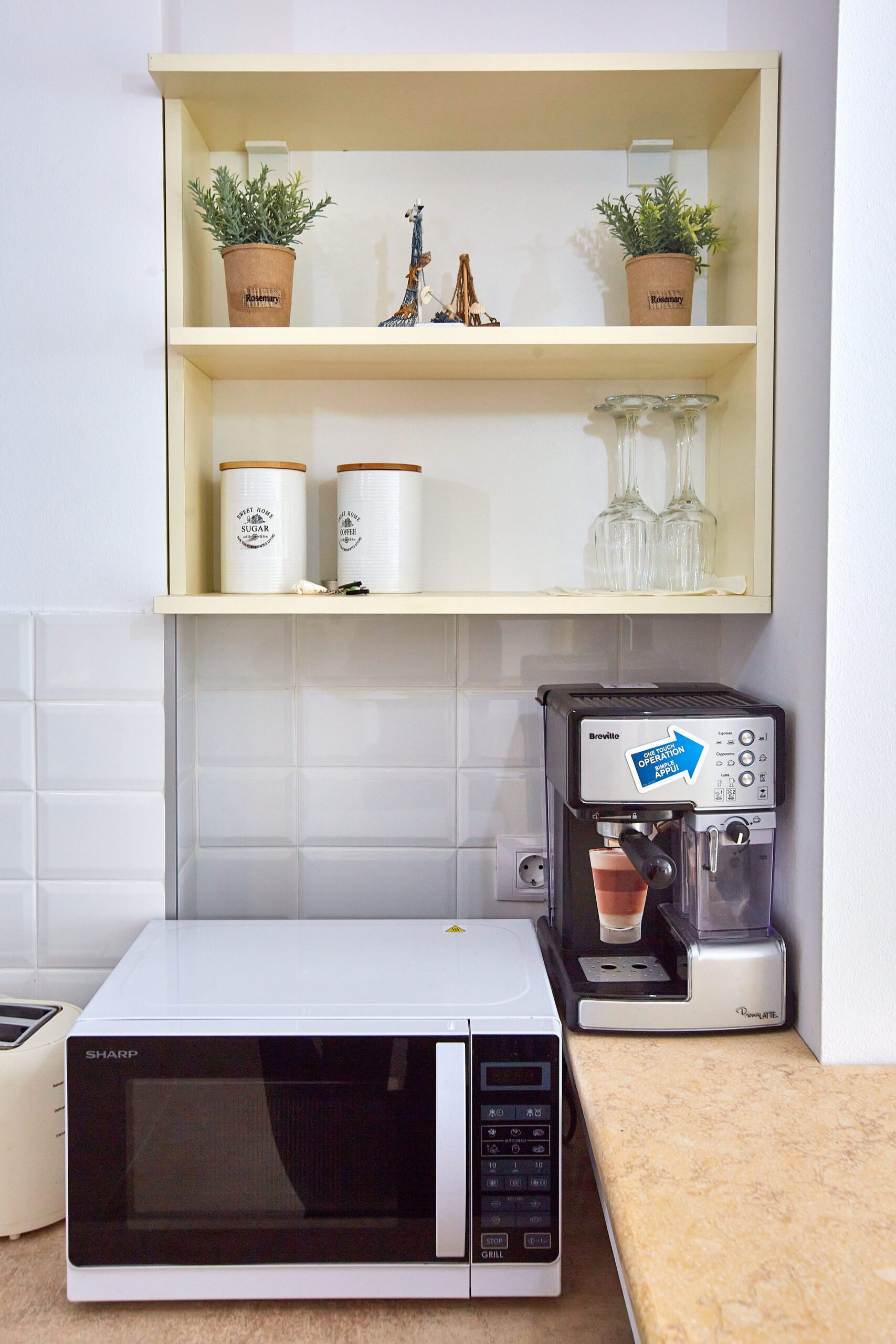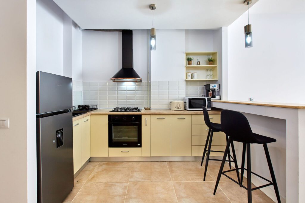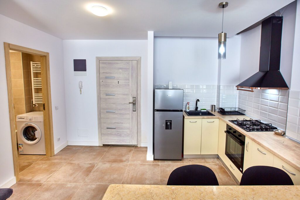 Bucătăria emană o atmosferă caldă și primitorie, grație mobilei bej. Elementele electrocasnice negre precum cuptorul ,frigiderul, cuptorul cu microunde, aparatul de cafea, hota , chiuveta adaugă un aer modern și funcțional, asigurând toate facilitățile pentru gătit. Un coltar spațios, însoțit de două scaune negre, oferă un spațiu suplimentar pentru servirea micului dejun sau a unei cafele.