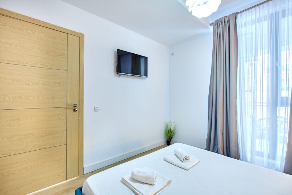 Dormitorul este o oază de liniște și relaxare. Patul matrimonial cu nuanțe albastre și lenjerie albă invită la odihnă, în timp ce dressingul alb, generos, asigură soluții de depozitare pentru garderobă. Televizorul montat pe perete în fața patului oferă posibilitatea de a viziona filme sau emisiuni direct din confortul patului. Draperiile gri, asemănătoare celor din sufragerie, asigură coerența designului și intimitate.