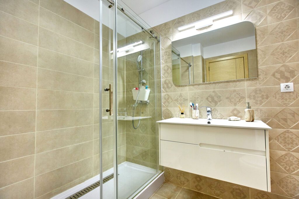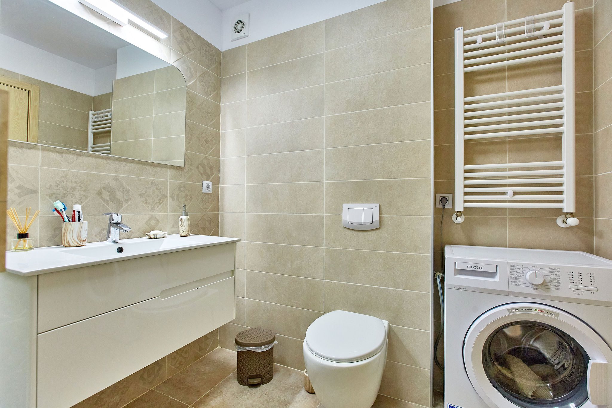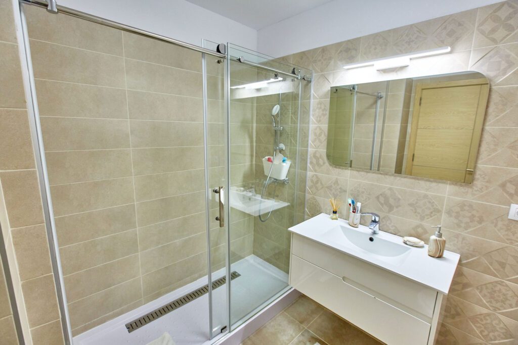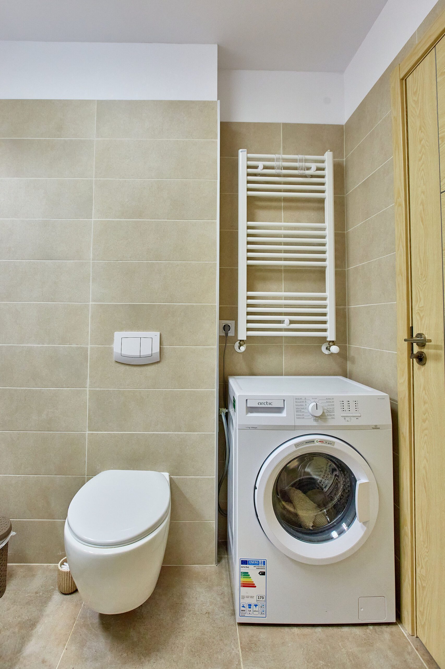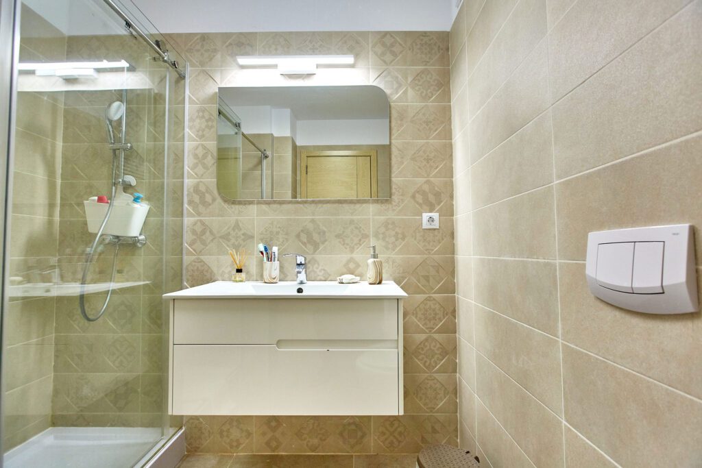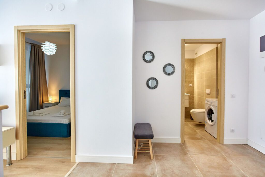 Baia, cu un design modern, dispune de un dus walk-in, oferind o experiență revigorantă. Mașina de spălat este integrată astfel încât să maximizeze spațiul disponibil, fără a compromite estetica.