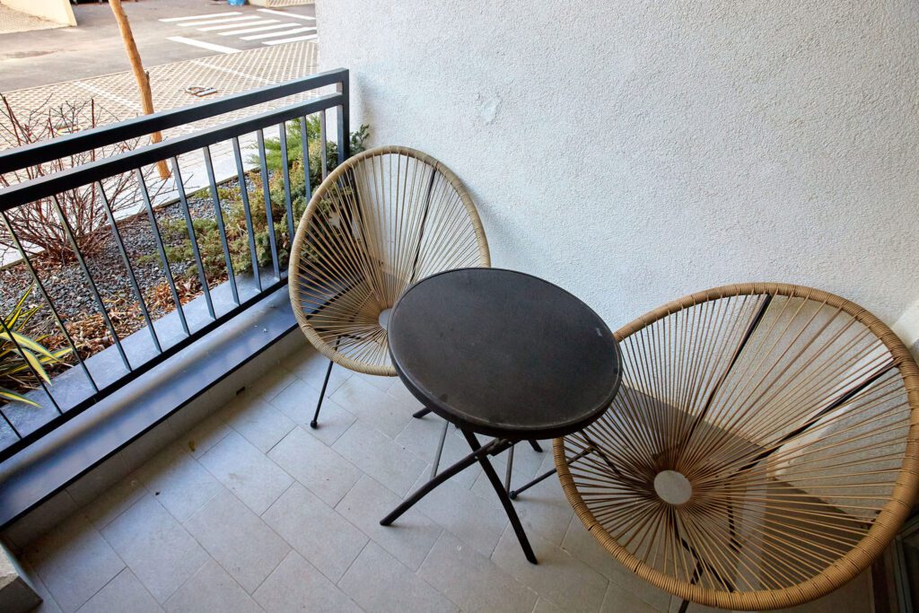 Balconul se prezintă ca un loc ideal pentru relaxare în aer liber. Dotat cu o masă și scaune, este perfect pentru a savura o băutură sau o masă în timp ce te bucuri de priveliște.