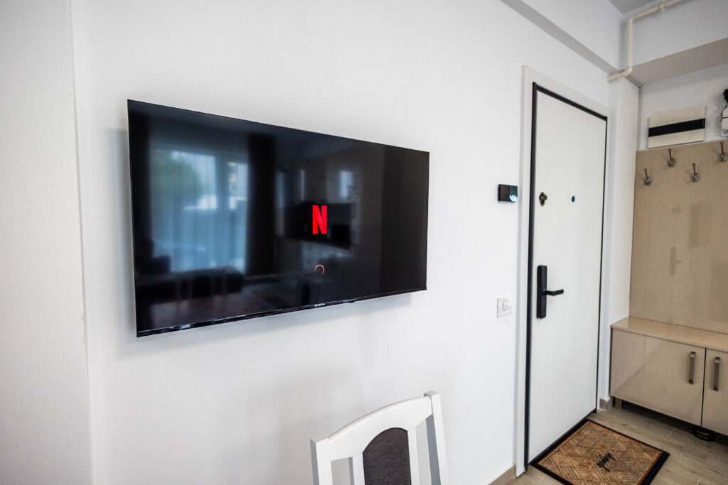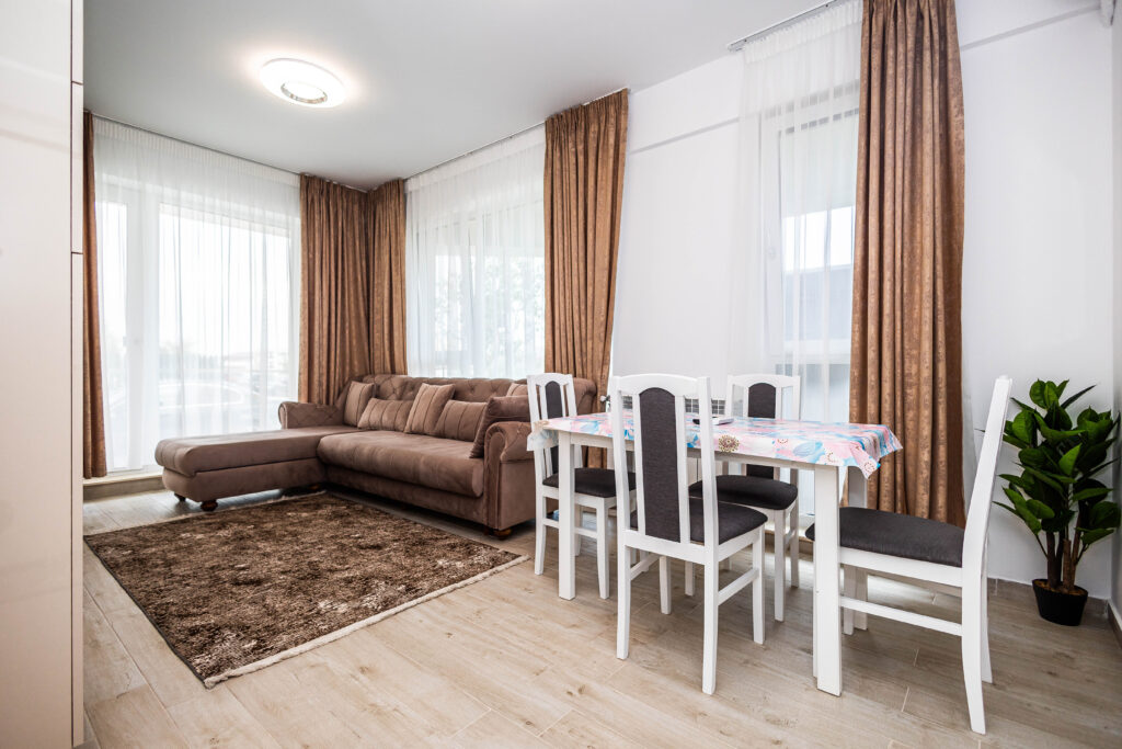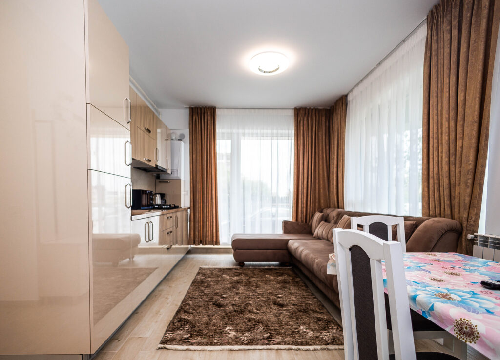 Livingul open space este luminos și primitor, echipat cu o canapea extensibilă confortabilă, perfectă pentru odihnă sau pentru găzduirea oaspeților suplimentari. Zona de zi comunică direct cu bucătăria și zona de luat masa, creând un spațiu ideal pentru petrecerea timpului împreună.