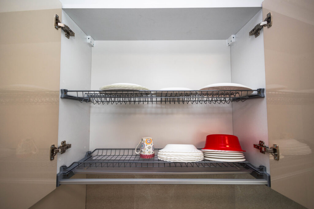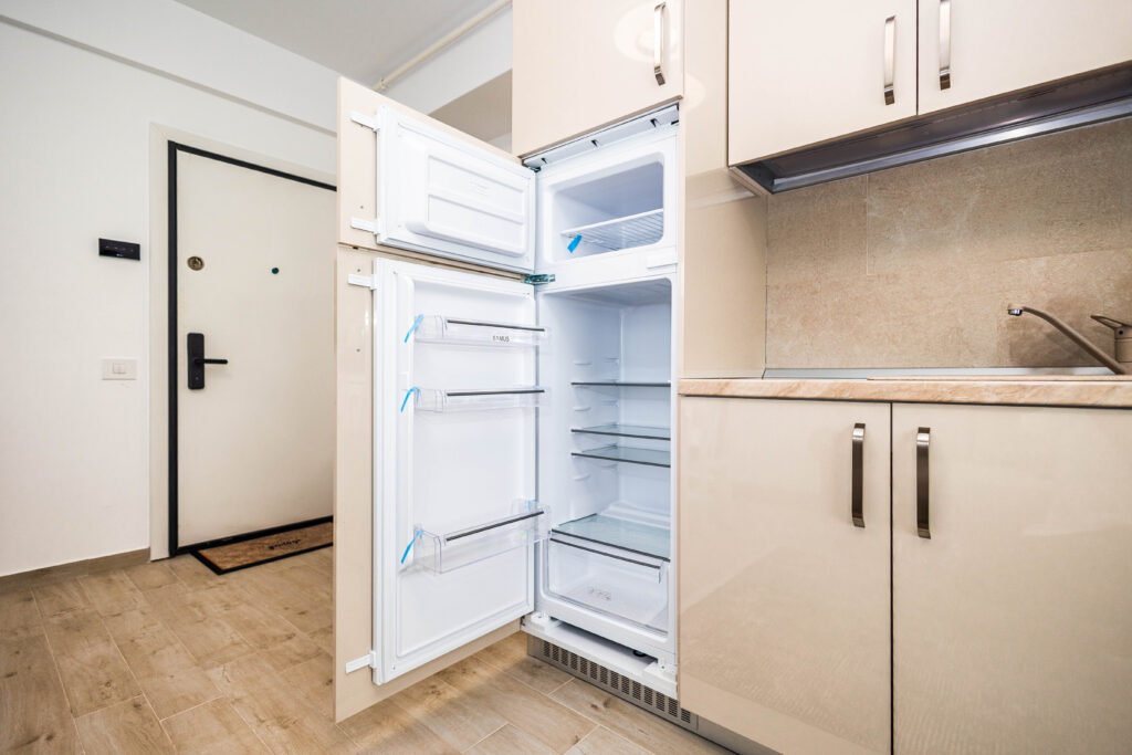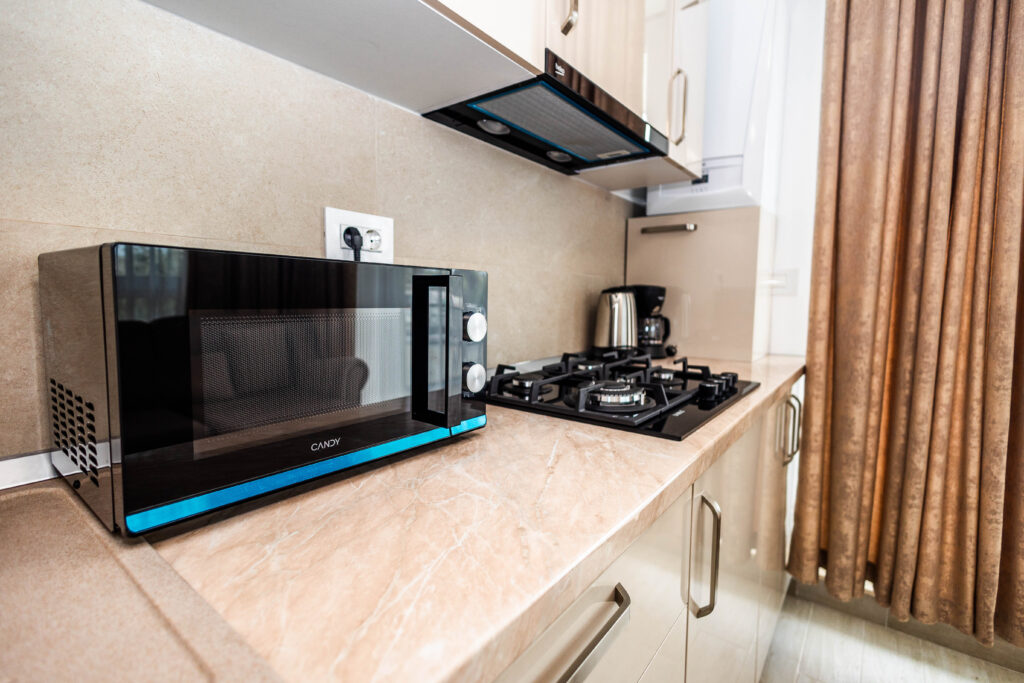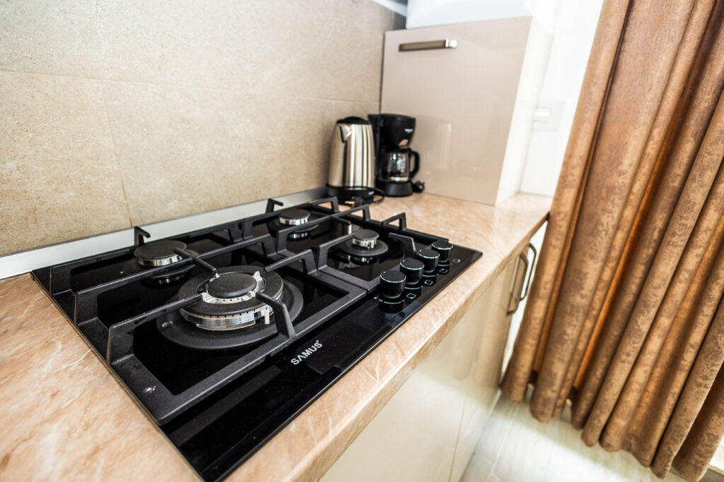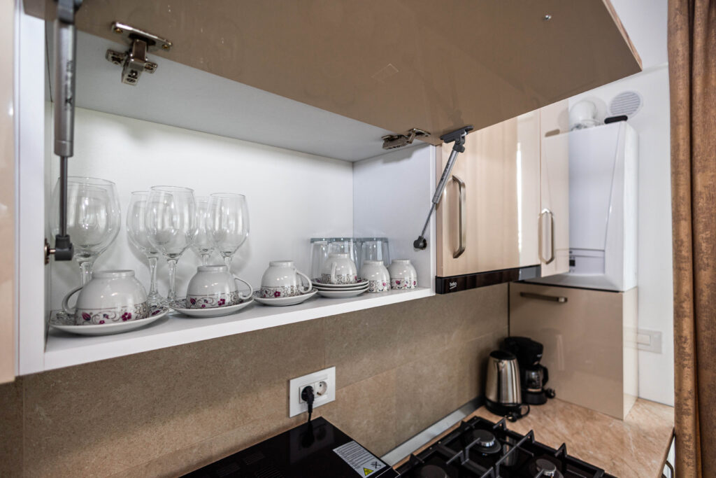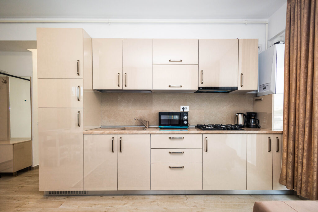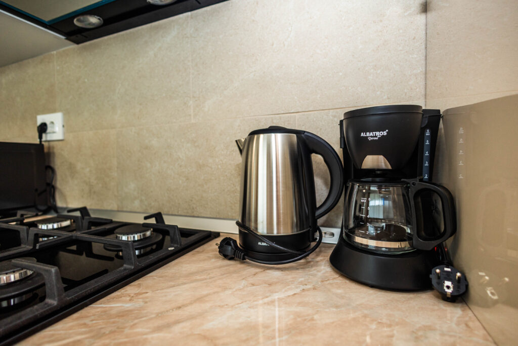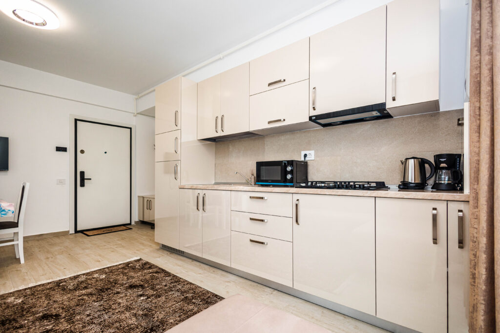 Bucătăria este complet utilată și gândită pentru a răspunde tuturor nevoilor de zi cu zi. Este dotată cu plită, cuptor cu microunde, prăjitor de pâine, aparat de cafea, frigider, chiuvetă, dulapuri și toate ustensilele necesare pentru prepararea și servirea meselor. În completare, există o masă de dining cu scaune, perfectă pentru mic dejunuri relaxante sau cine în familie.