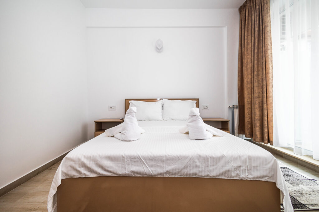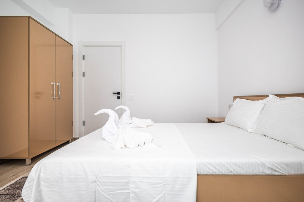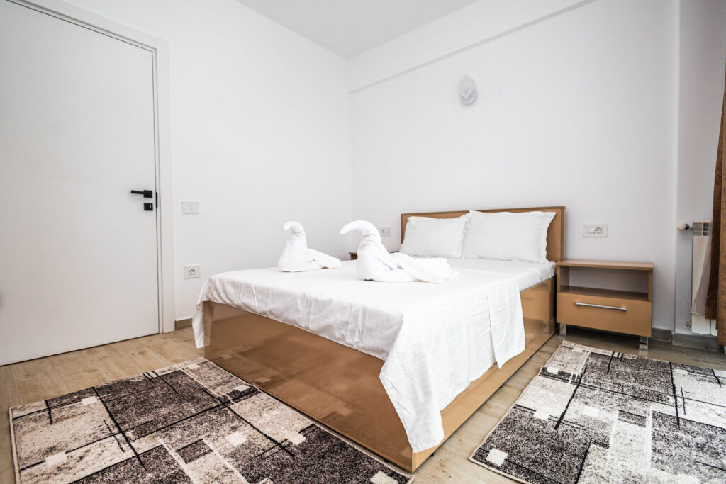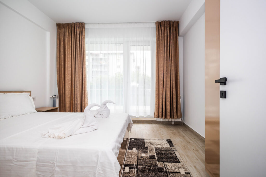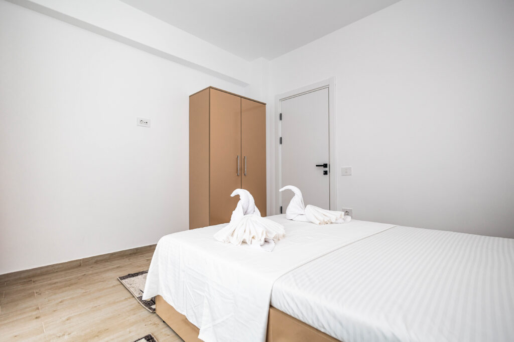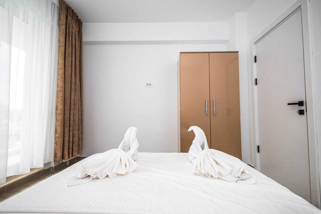 Dormitorul este amenajat cu un pat matrimonial spațios și un dulap generos pentru depozitarea hainelor și a bagajelor, astfel încât să păstrezi totul organizat pe durata șederii.