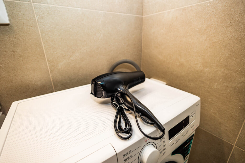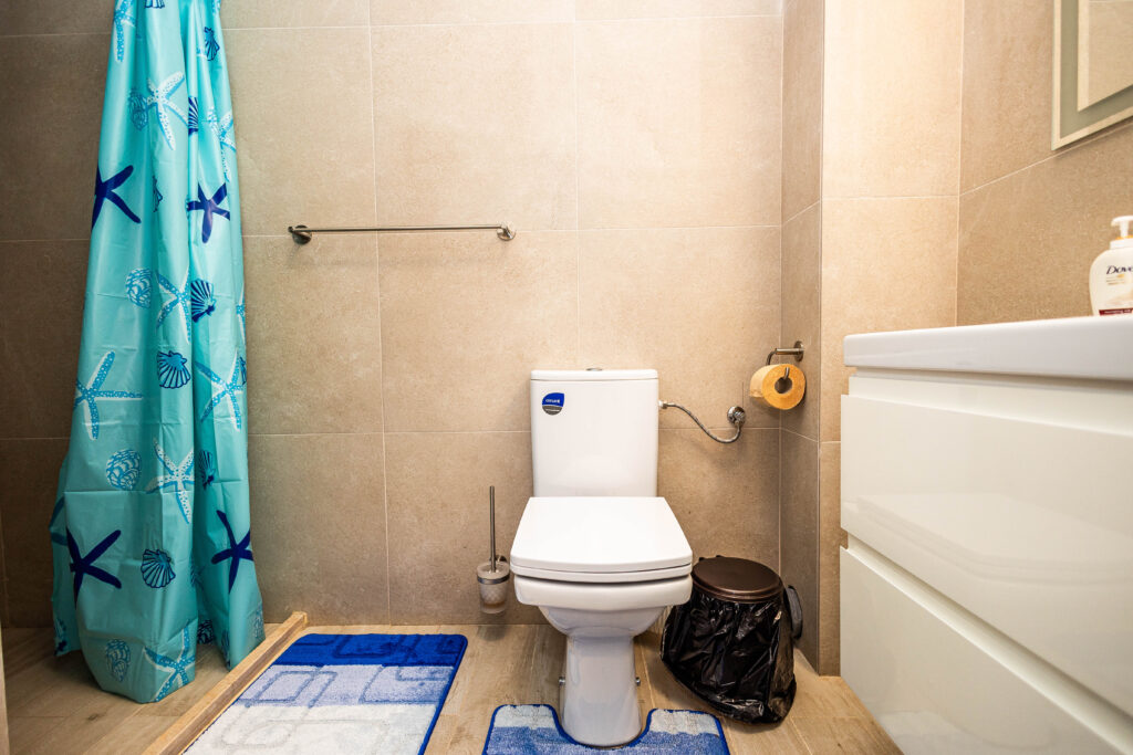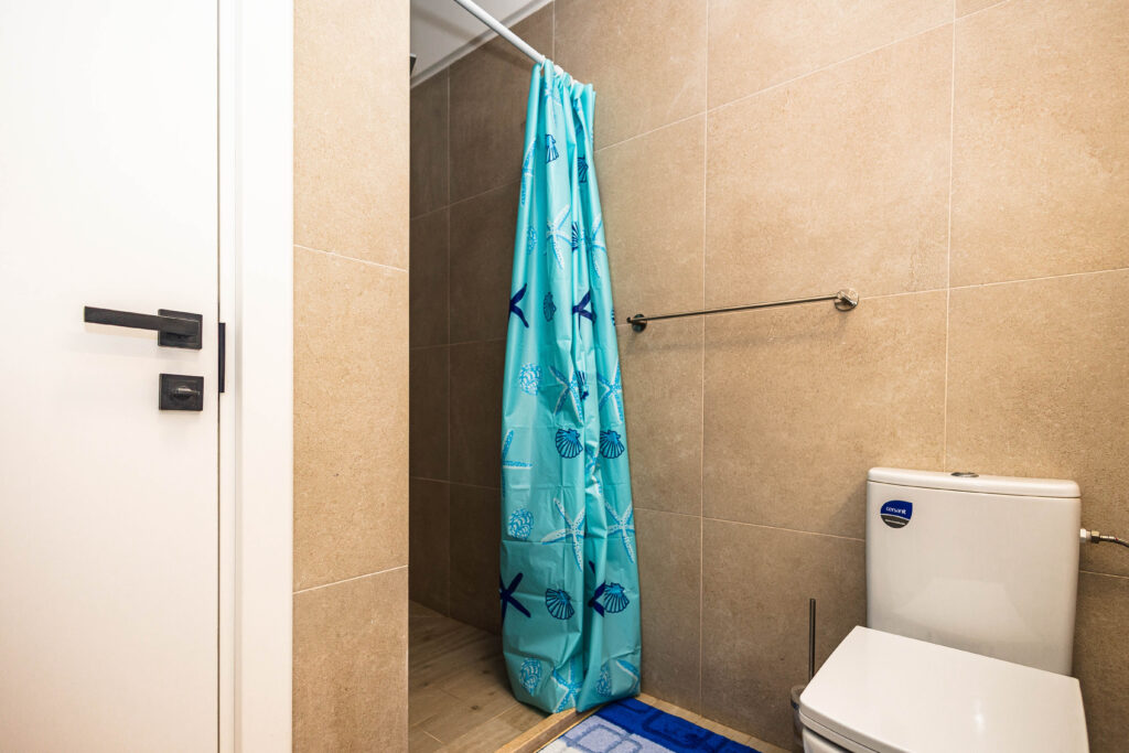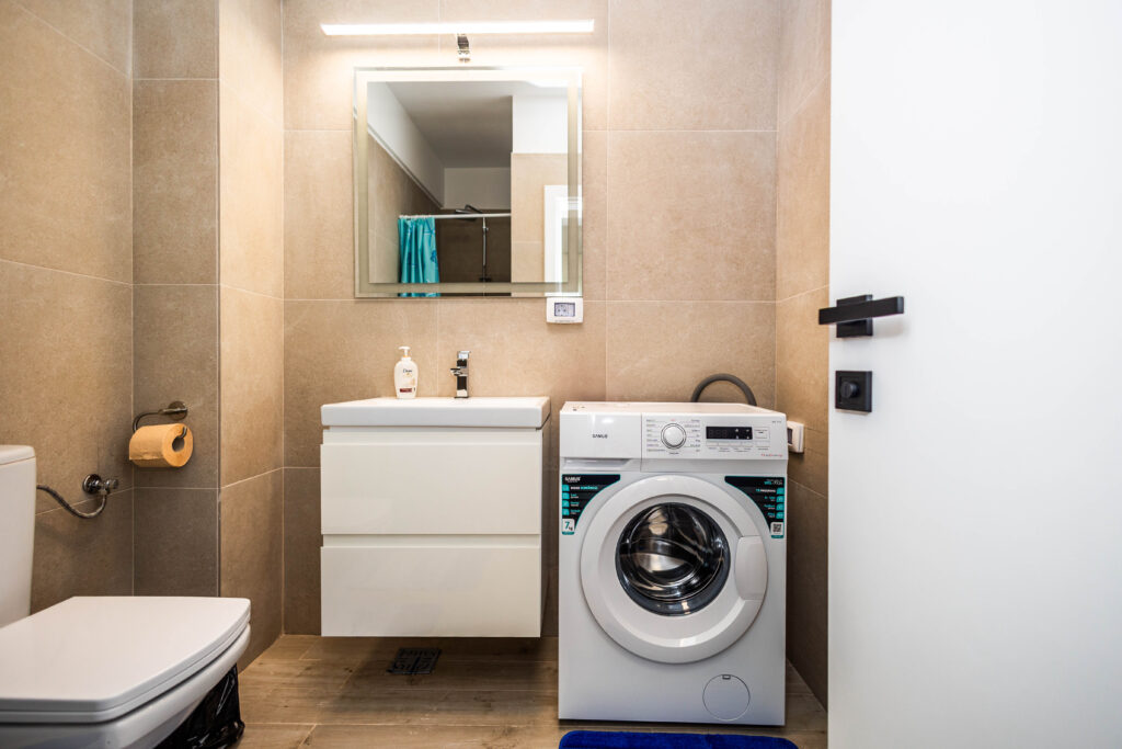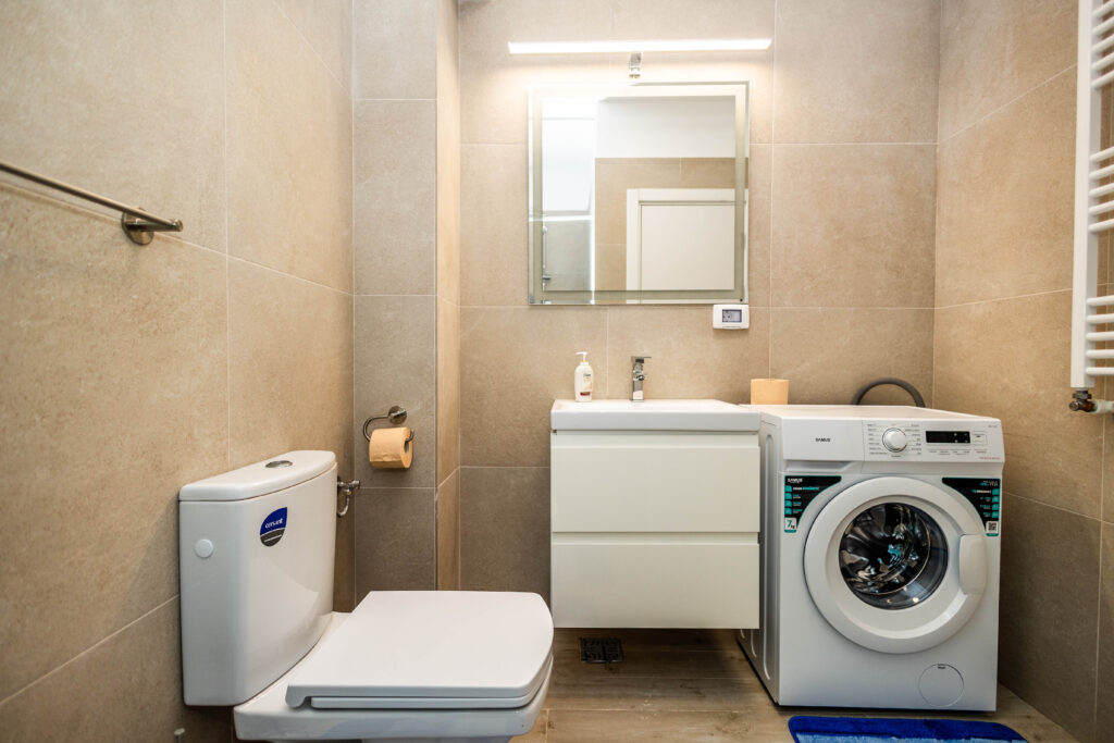 Baia este modernă și funcțională, dotată cu duș spațios, mașină de spălat și tot ce este necesar pentru confortul tău, indiferent de durata sejurului.