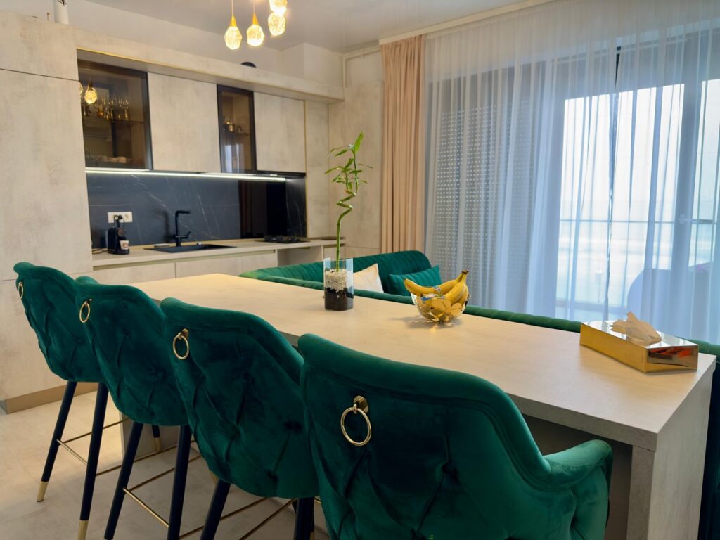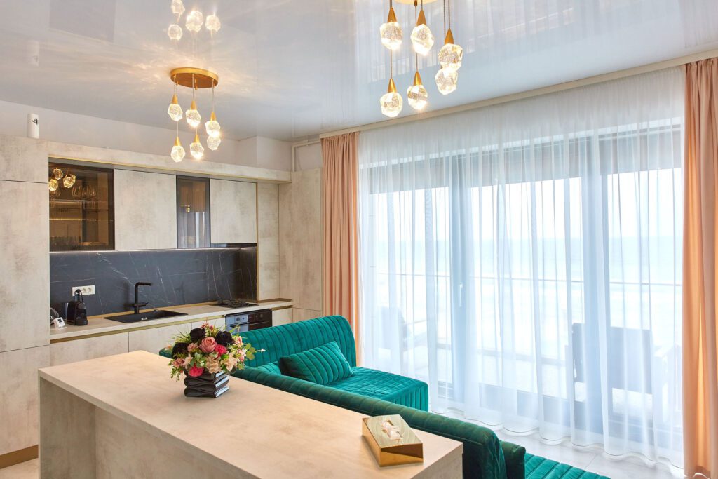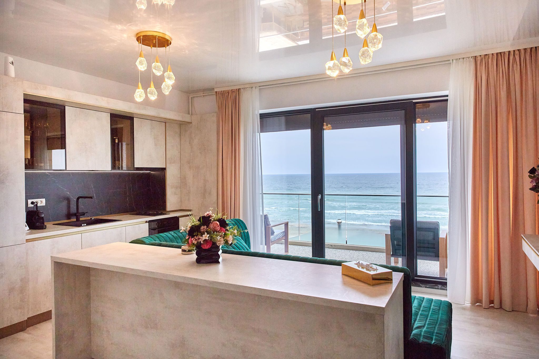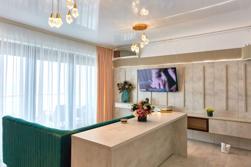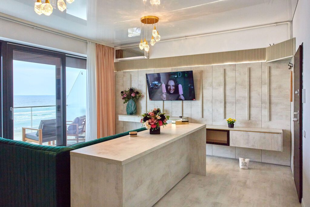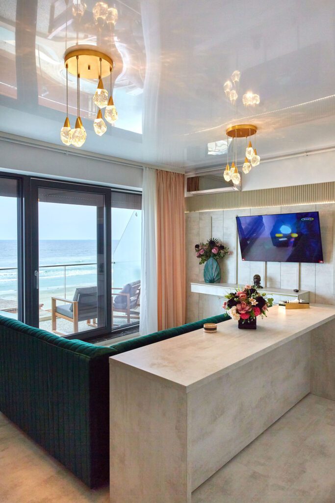 Sufrageria open space invită oaspeții într-un decor somptuos. O canapea extensibilă de culoare verde smarald, plasată strategic în fața unor ferestre imense, oferă o priveliște panoramică și frontală asupra mării. Acest cadru idilic este completat de un televizor smart montat pe perete, care adaugă o notă modernă și sofisticată spațiului.