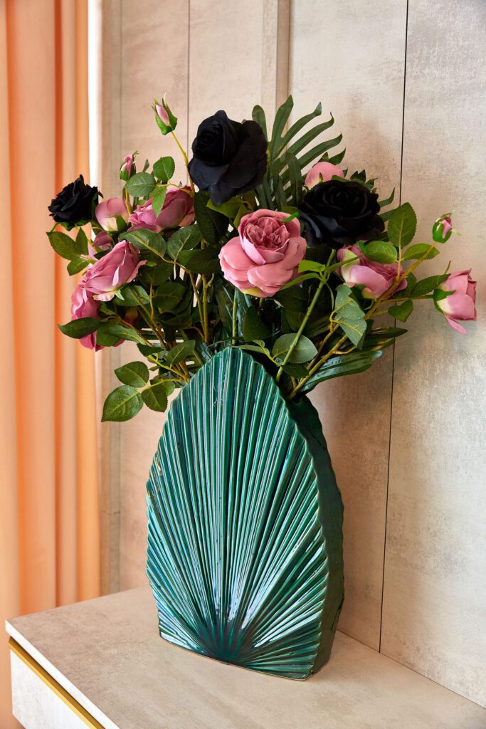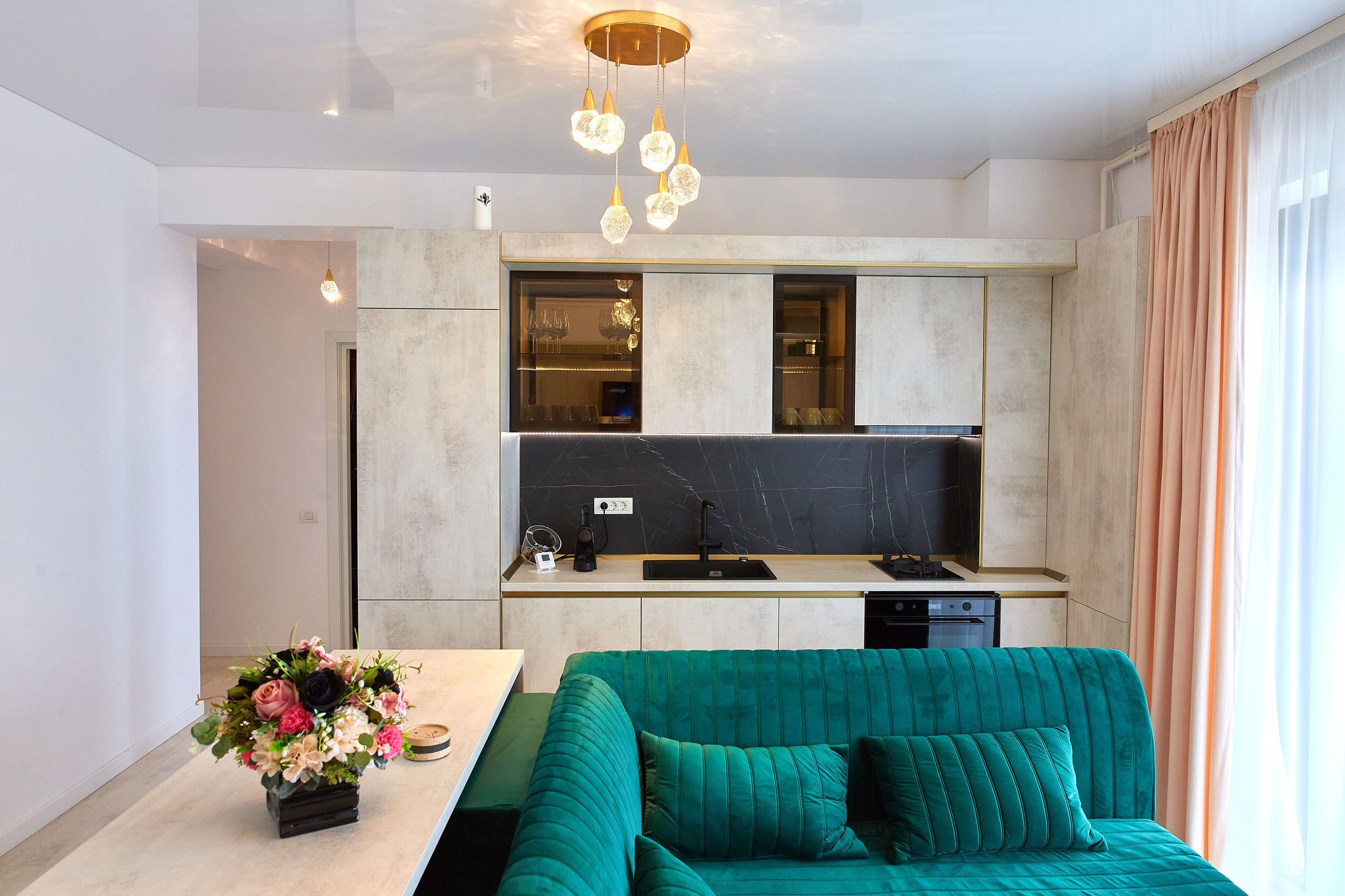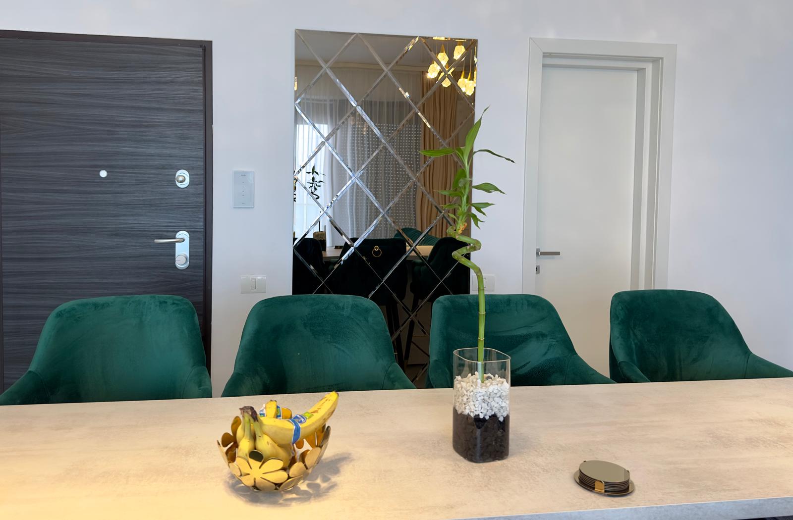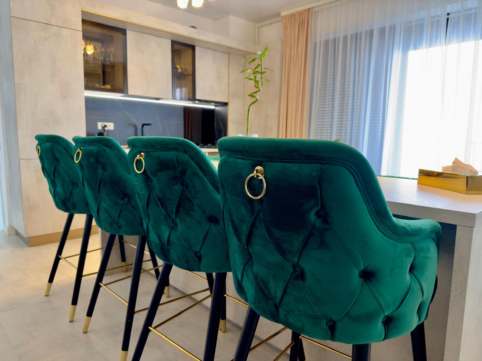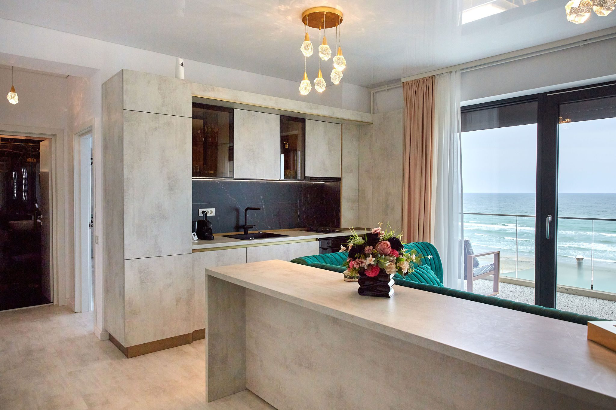 Sufrageria open space invită oaspeții într-un decor somptuos. O canapea extensibilă de culoare verde smarald, plasată strategic în fața unor ferestre imense, oferă o priveliște panoramică și frontală asupra mării. Acest cadru idilic este completat de un televizor smart montat pe perete, care adaugă o notă modernă și sofisticată spațiului.