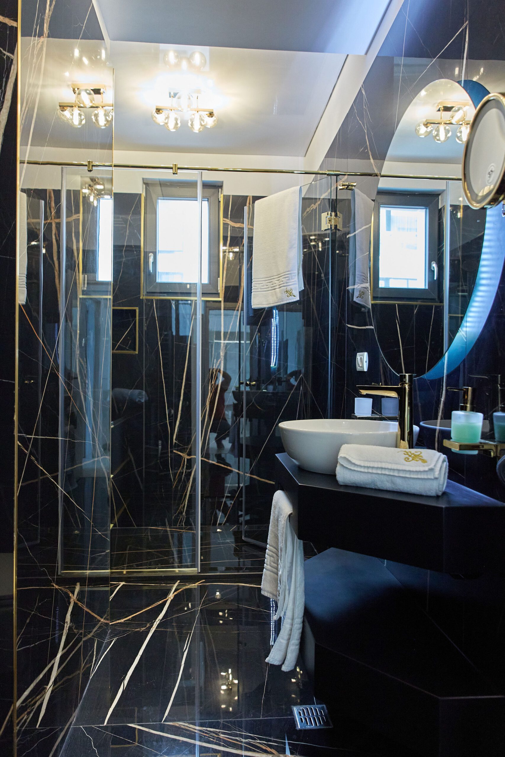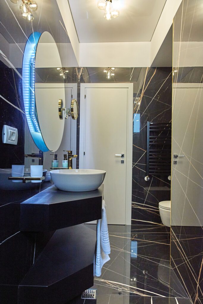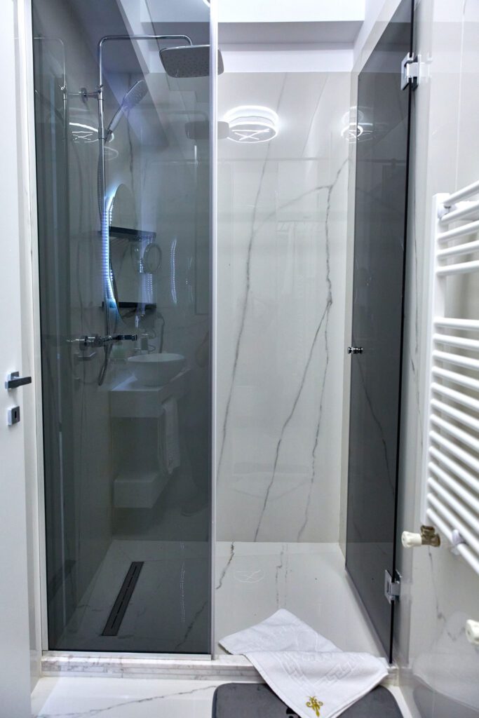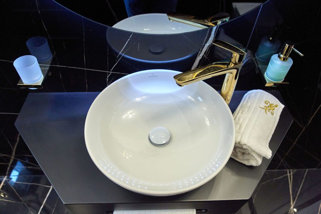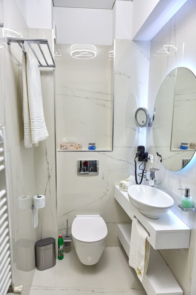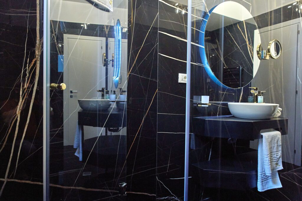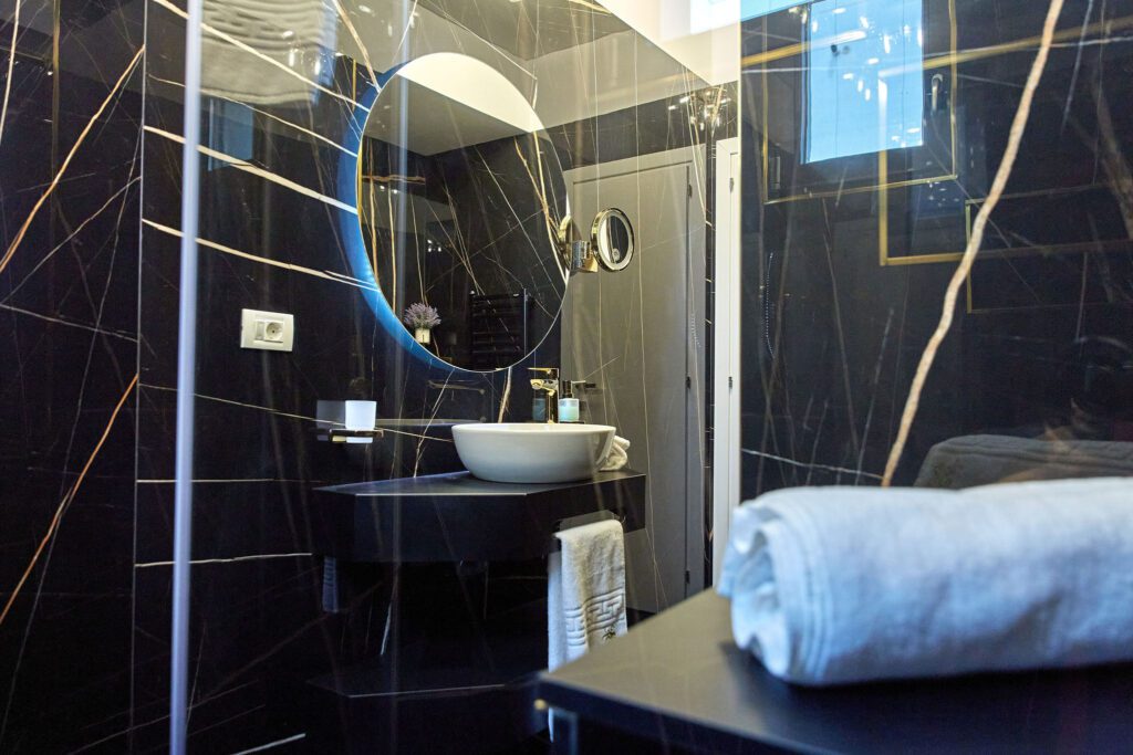 Baia 1 impresionează prin designul său luminos, dominat de nuanțe de alb. O cabină de duș modernă și o oglindă iluminată accentuează atmosfera de lux a spațiului. În contrast, Baia 2 prezintă nuanțe închise de negru, menținând același nivel de lux. O altă cabină de duș și o oglindă cu lumini completează amenajarea acestei încăperi.