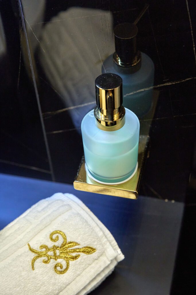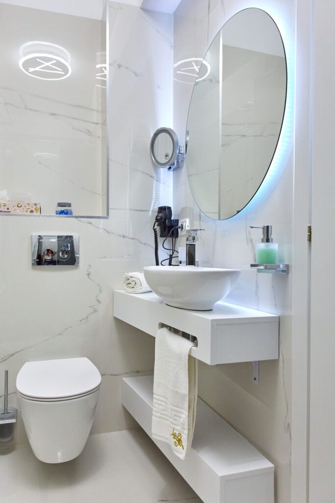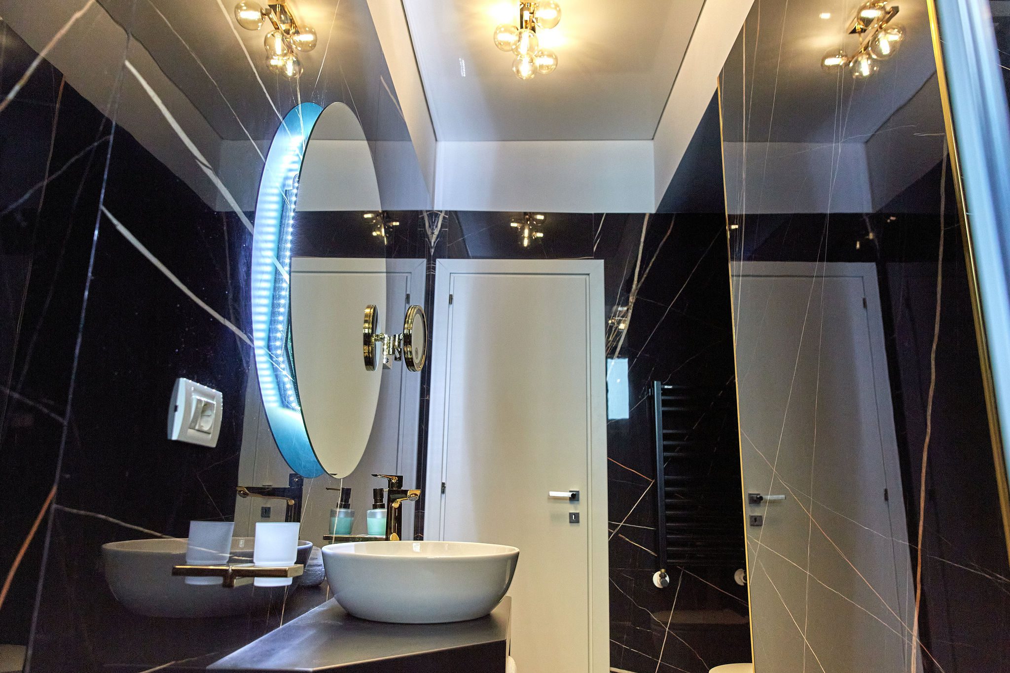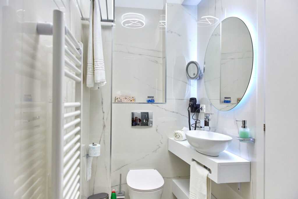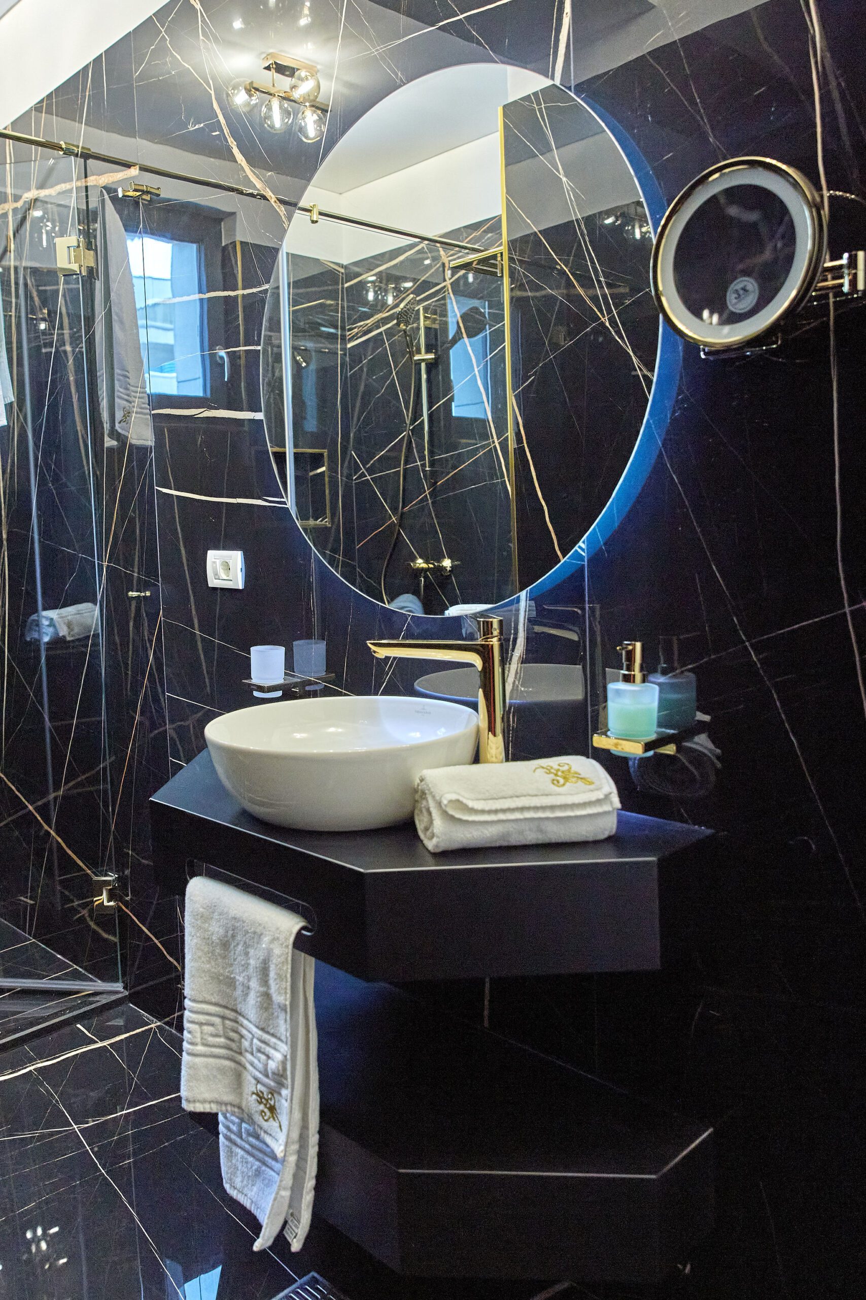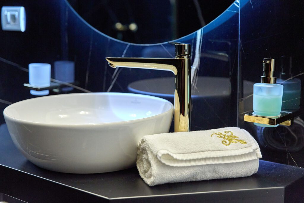 Baia 1 impresionează prin designul său luminos, dominat de nuanțe de alb. O cabină de duș modernă și o oglindă iluminată accentuează atmosfera de lux a spațiului. În contrast, Baia 2 prezintă nuanțe închise de negru, menținând același nivel de lux. O altă cabină de duș și o oglindă cu lumini completează amenajarea acestei încăperi.