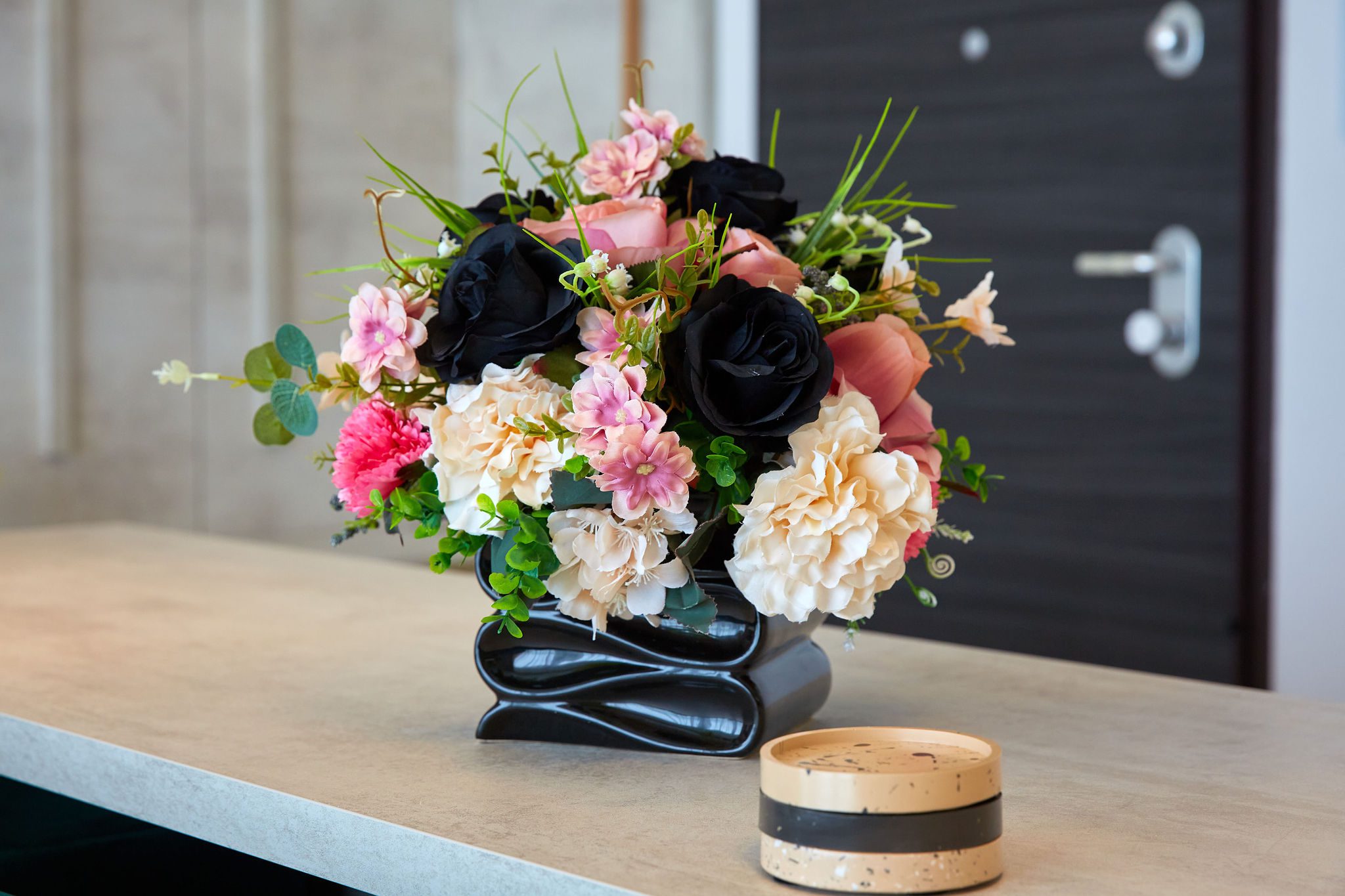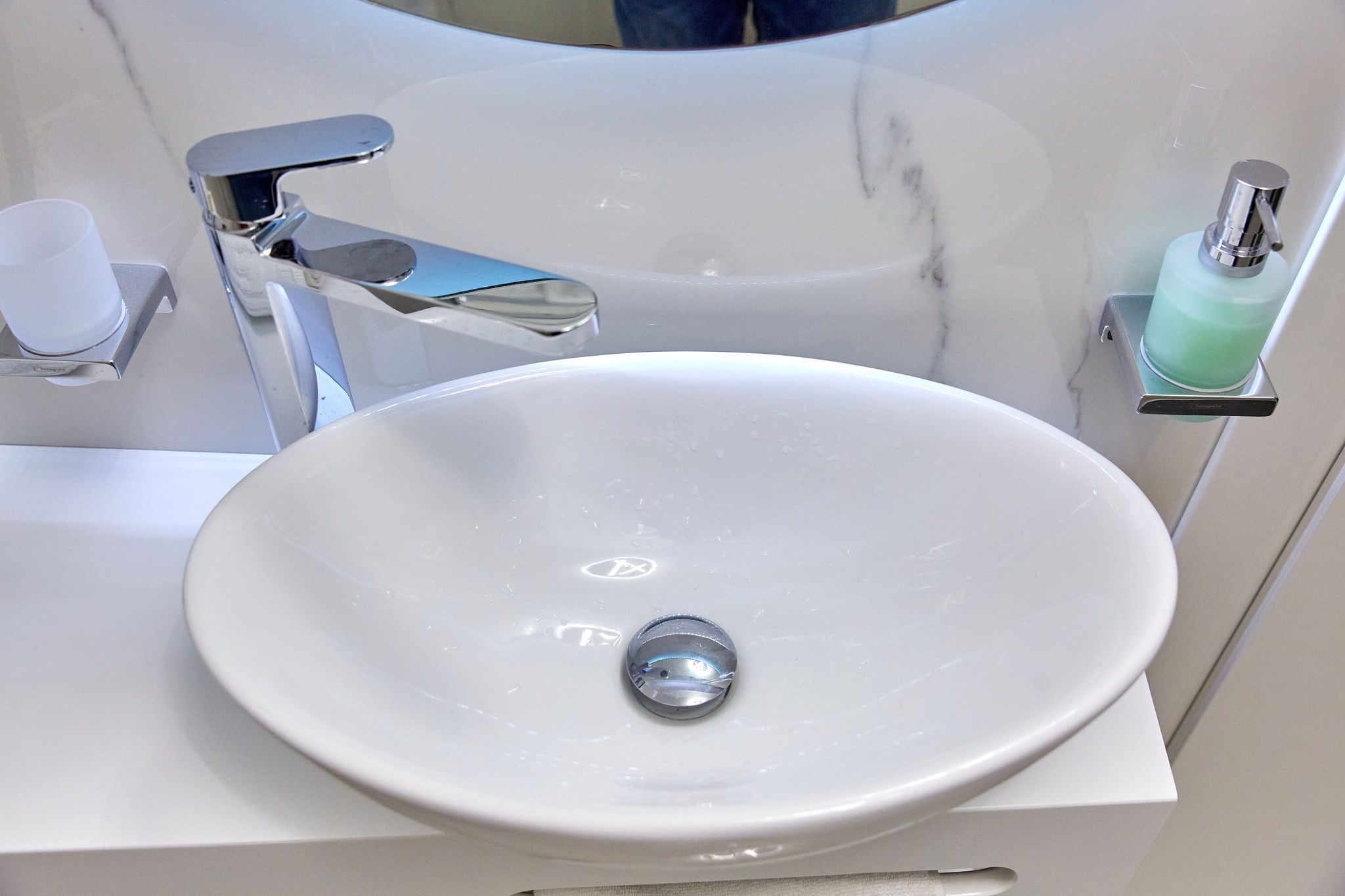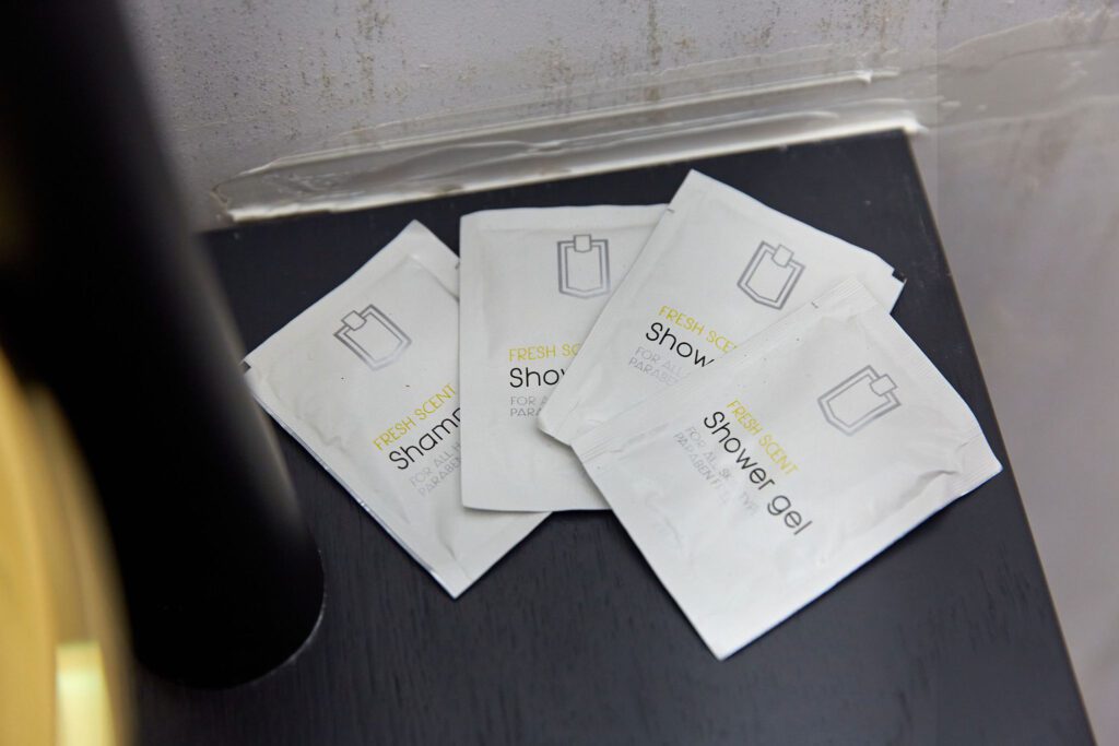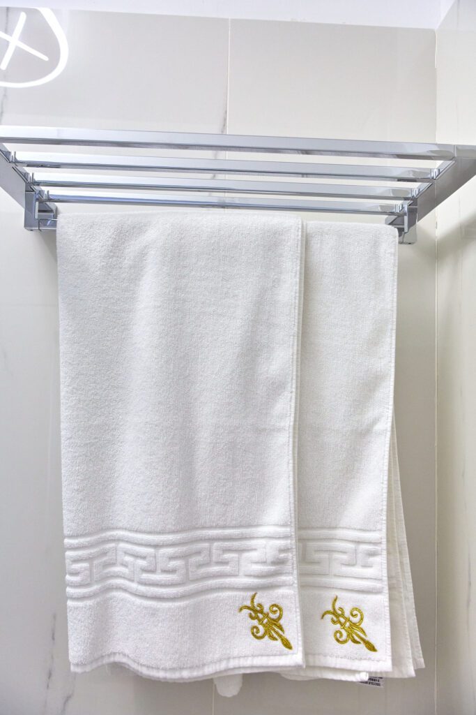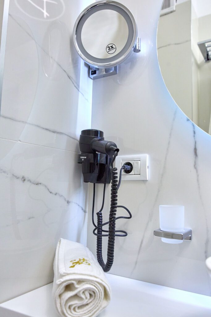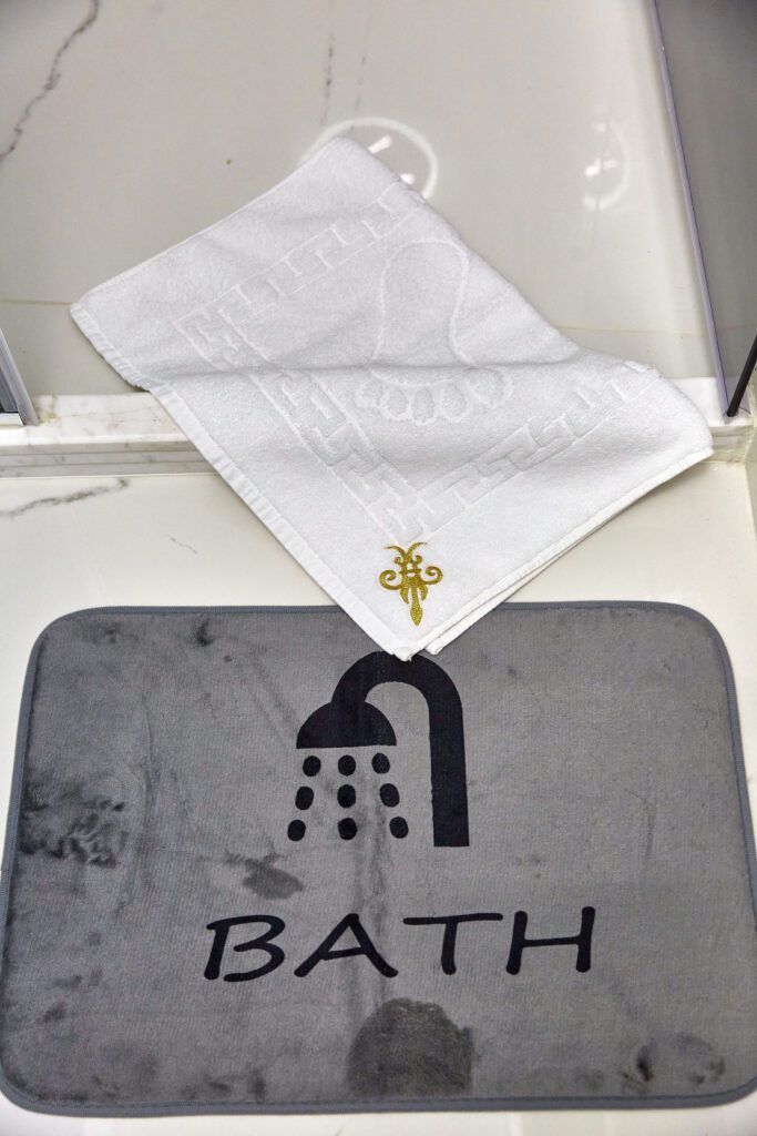 Baia 1 impresionează prin designul său luminos, dominat de nuanțe de alb. O cabină de duș modernă și o oglindă iluminată accentuează atmosfera de lux a spațiului. În contrast, Baia 2 prezintă nuanțe închise de negru, menținând același nivel de lux. O altă cabină de duș și o oglindă cu lumini completează amenajarea acestei încăperi.