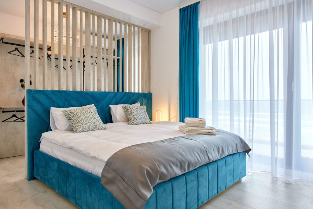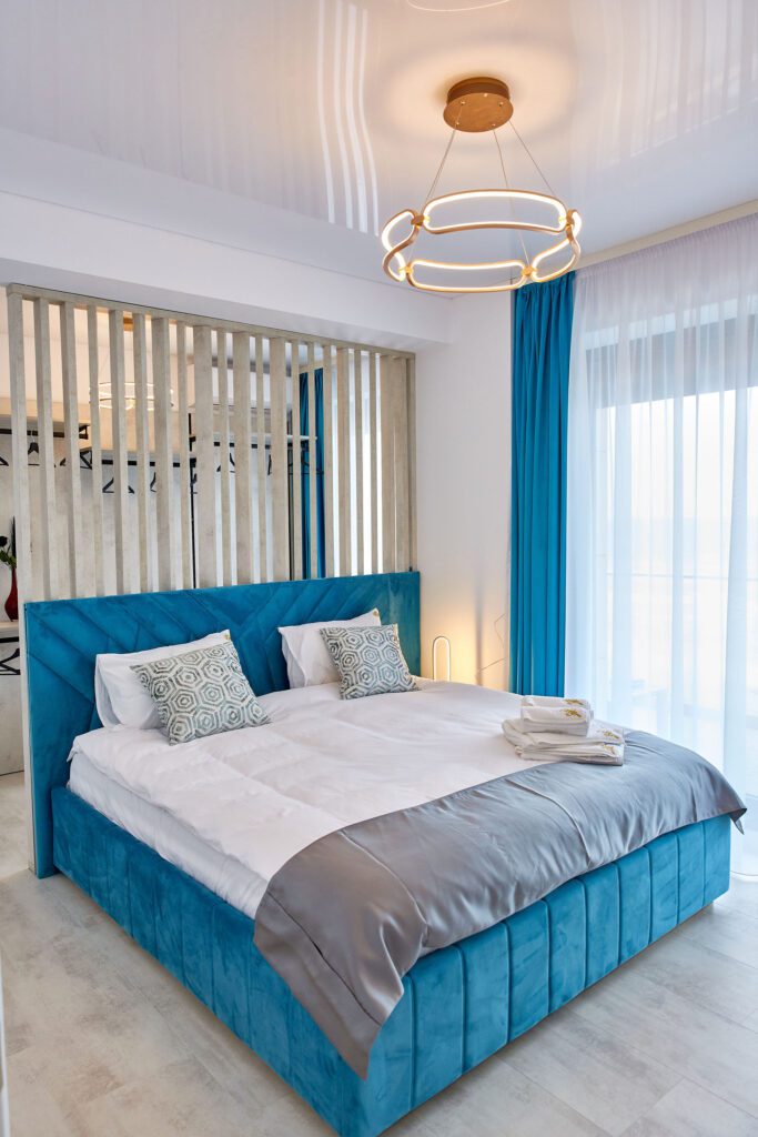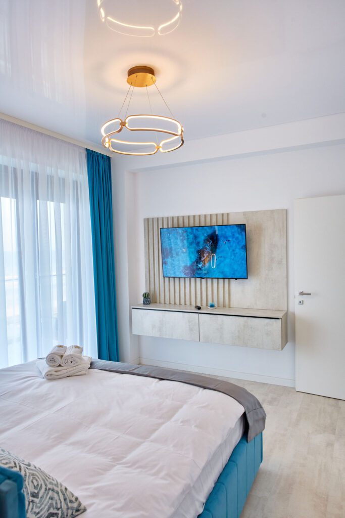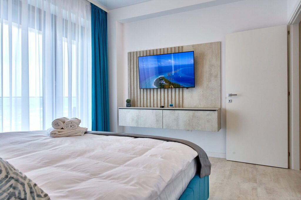 Dormitorul 1 emană o atmosferă calmă prin nuanțele de albastru. Un pat matrimonial cu lenjerie de calitate superioară tronează în cameră, iar vizavi de acesta, un alt televizor este montat pe perete. În spatele patului, un spațiu ingenios amenajat servește drept garderobă, în timp ce draperiile albastre completează designul camerei.