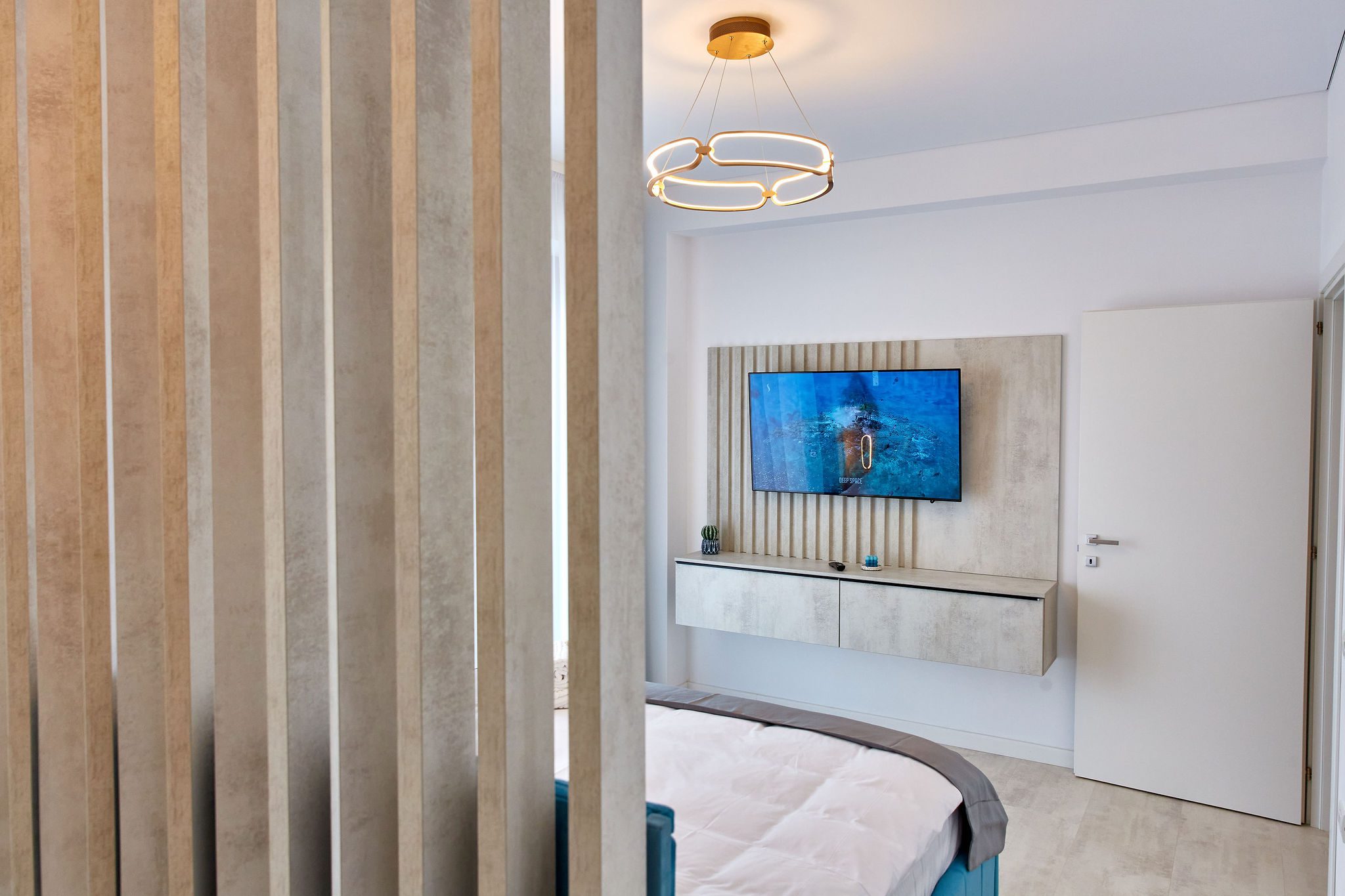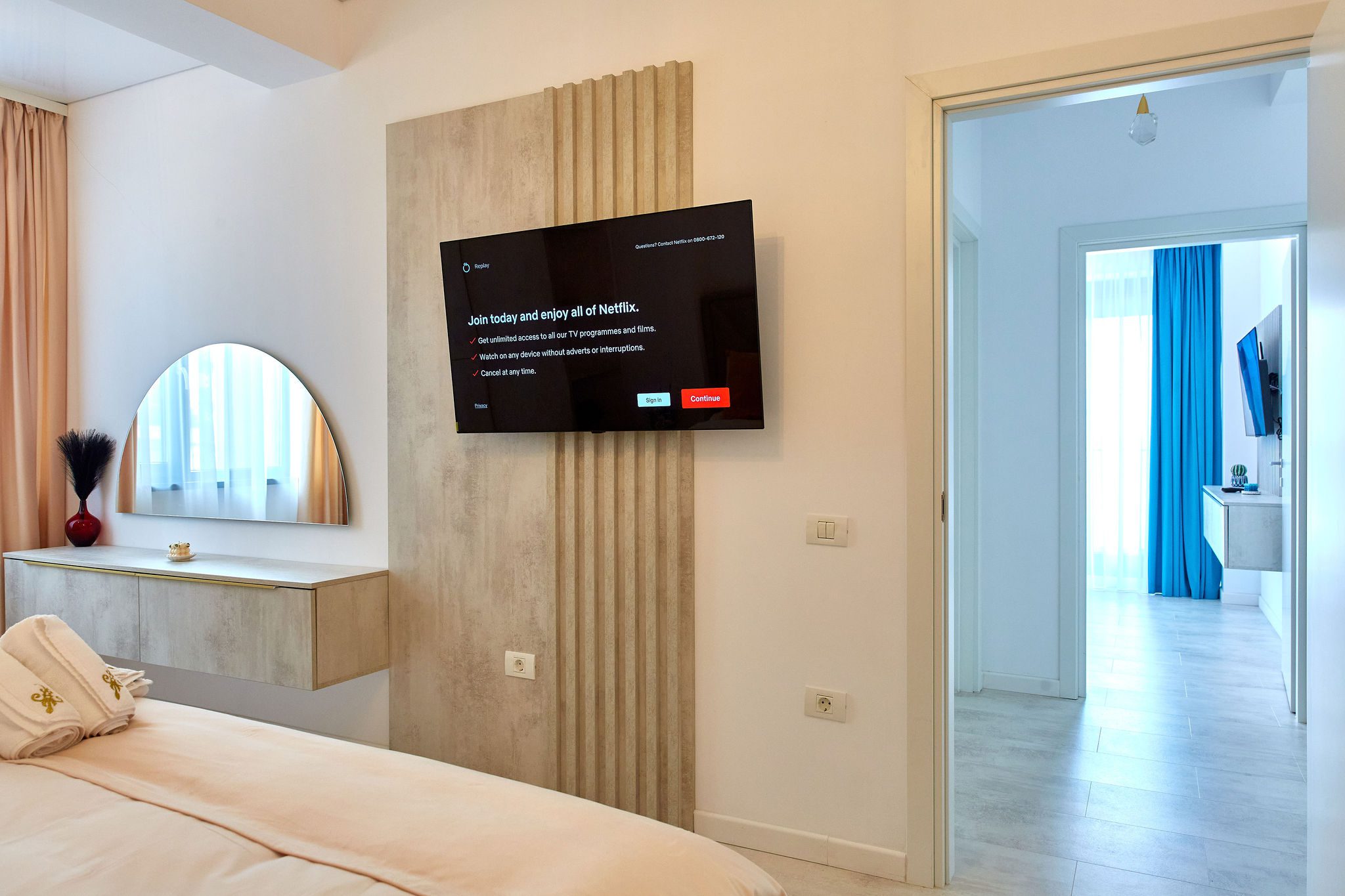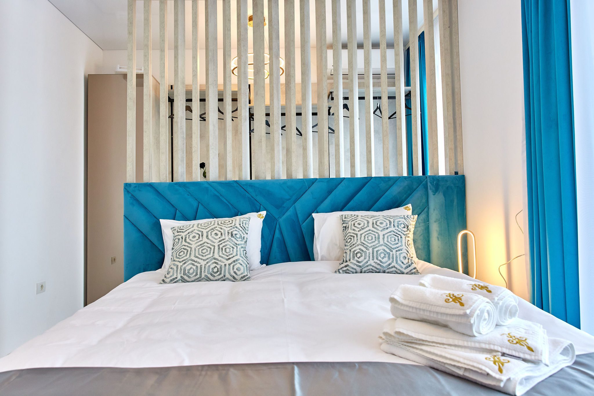 Dormitorul 1 emană o atmosferă calmă prin nuanțele de albastru. Un pat matrimonial cu lenjerie de calitate superioară tronează în cameră, iar vizavi de acesta, un alt televizor este montat pe perete. În spatele patului, un spațiu ingenios amenajat servește drept garderobă, în timp ce draperiile albastre completează designul camerei.