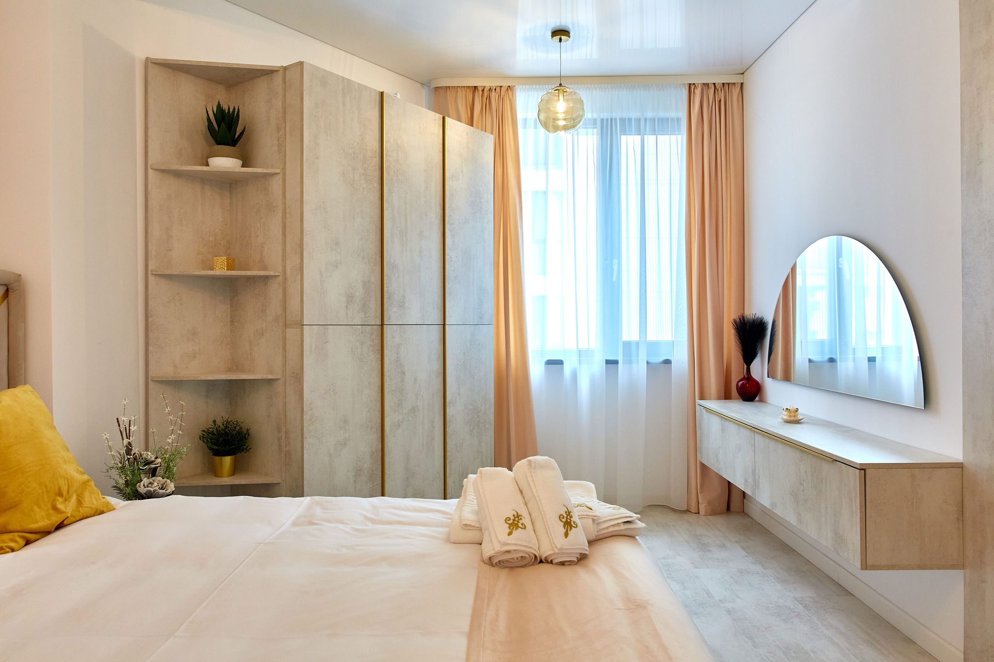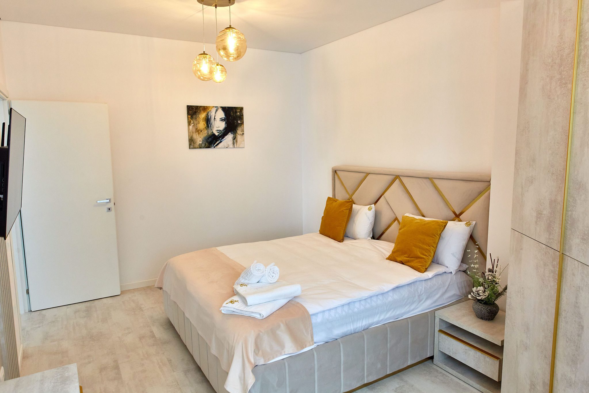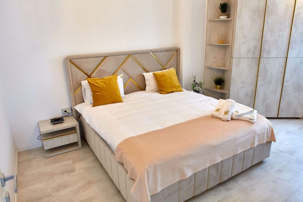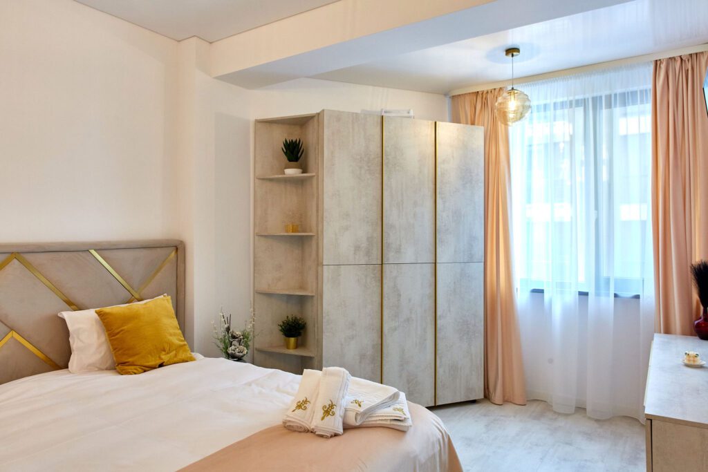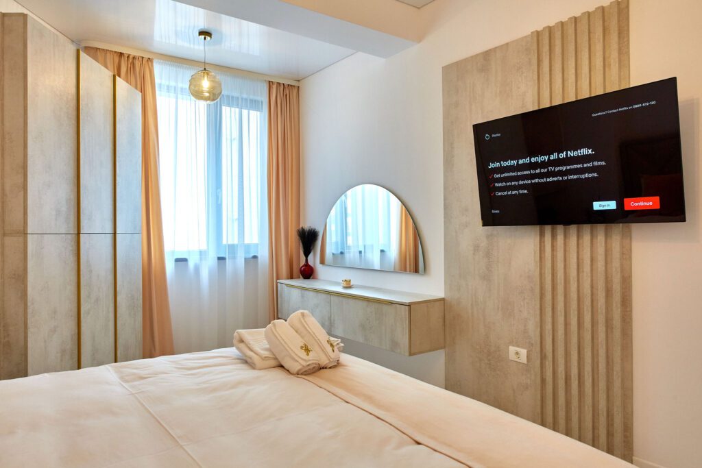 Dormitorul 2 este caracterizat de tonuri calde de bej. Un pat matrimonial confortabil este însoțit de un dulap generos, oferind suficient spațiu de depozitare. Televizorul smart amplasat în fața patului și draperiile bej, alături de lenjeria de calitate, creează un cadru relaxant și primitor.