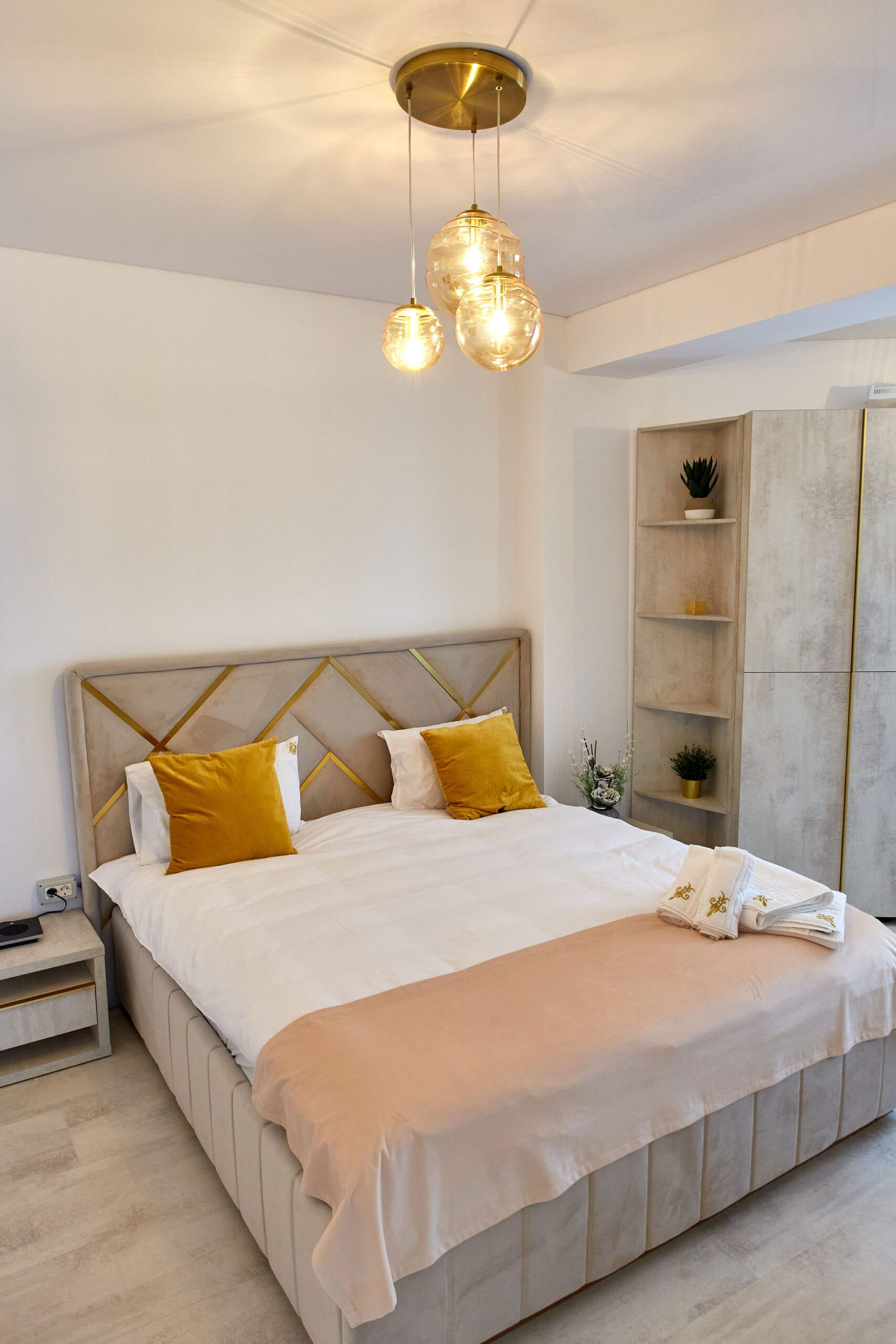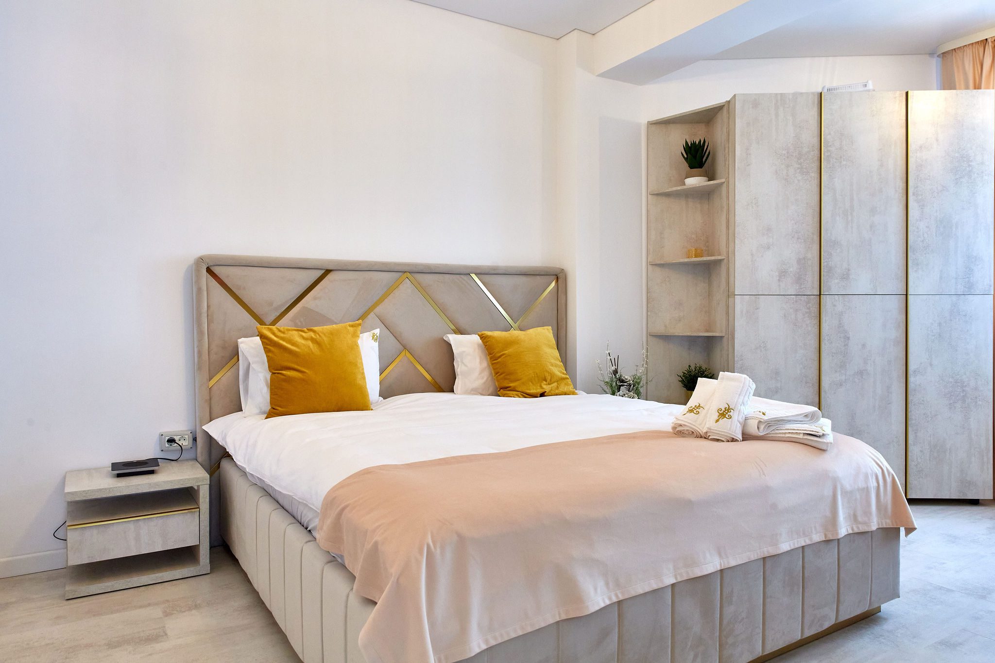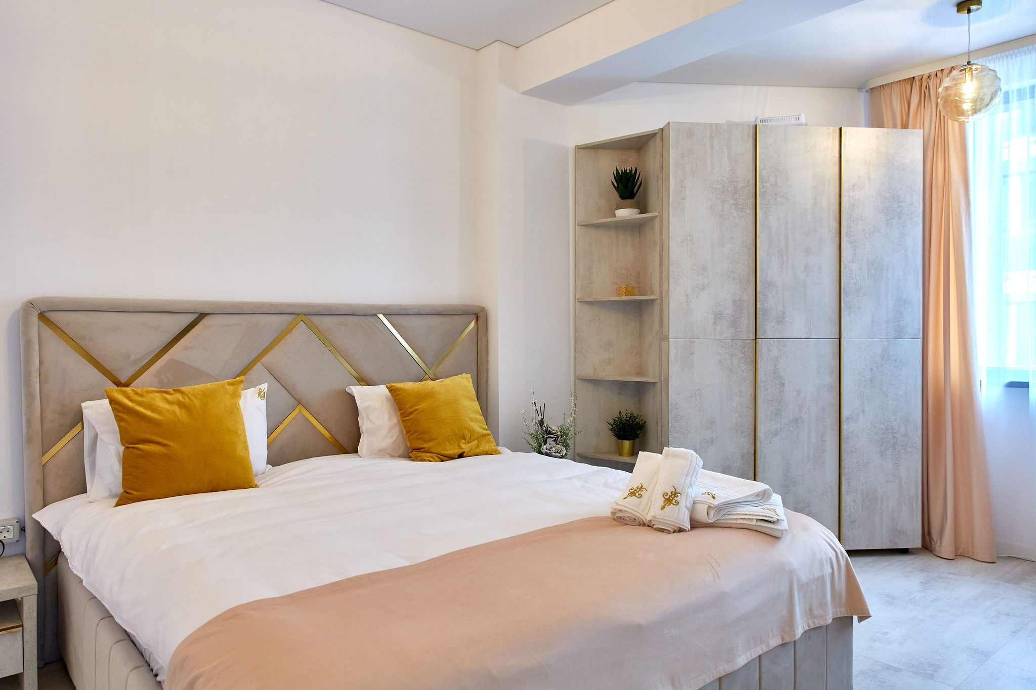 Dormitorul 2 este caracterizat de tonuri calde de bej. Un pat matrimonial confortabil este însoțit de un dulap generos, oferind suficient spațiu de depozitare. Televizorul smart amplasat în fața patului și draperiile bej, alături de lenjeria de calitate, creează un cadru relaxant și primitor.