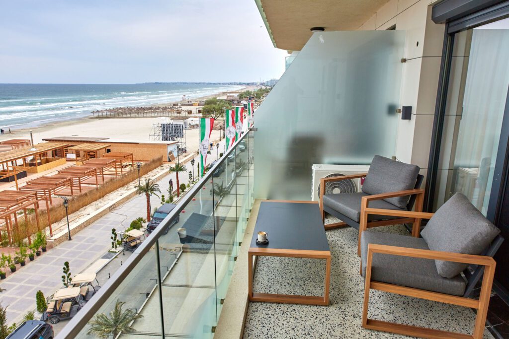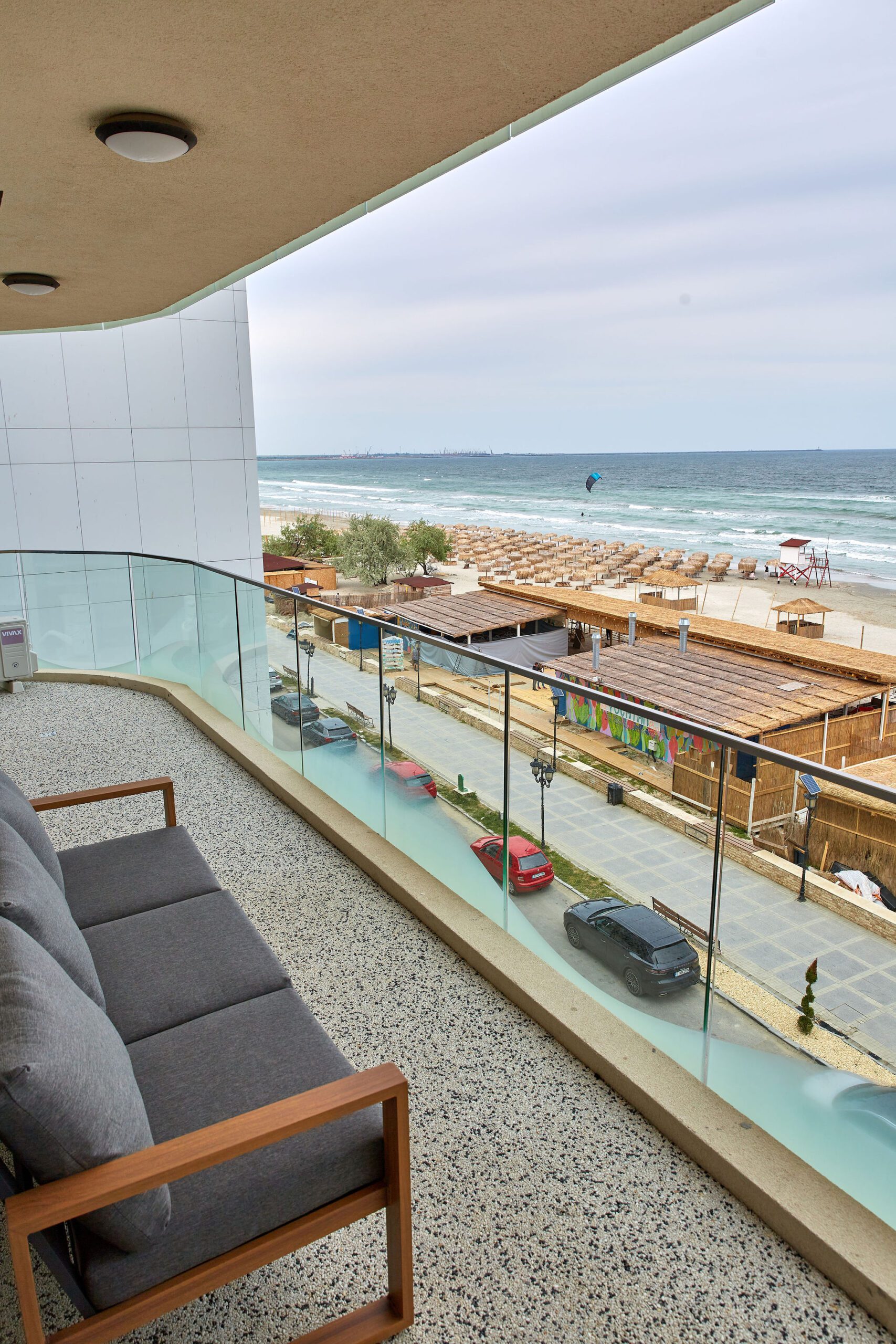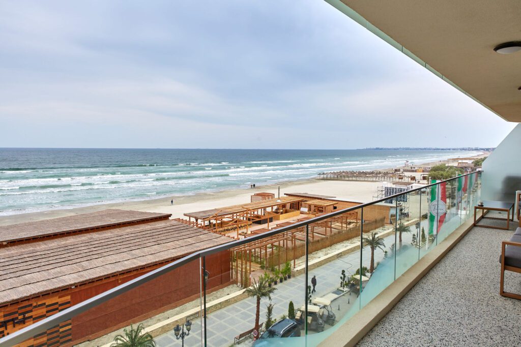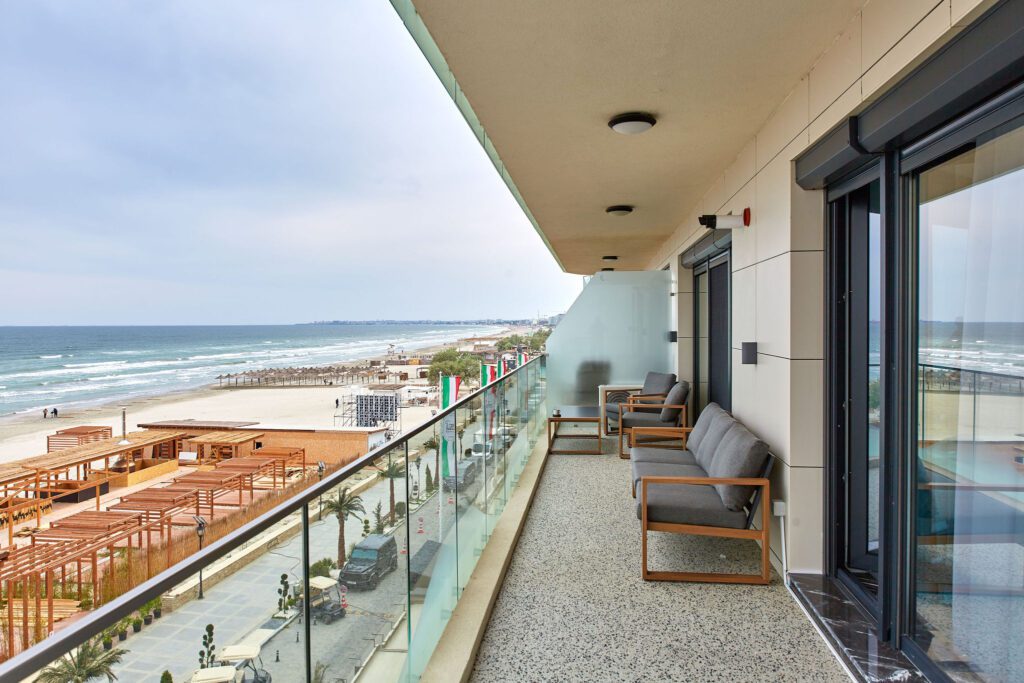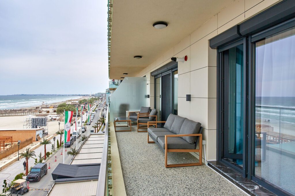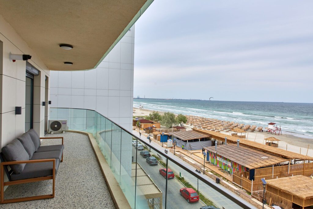 Balconul, locul perfect pentru relaxare, este dotat cu mobilier confortabil și oferă o priveliște frontală impresionantă asupra mării, fiind un punct de atracție major al apartamentului.