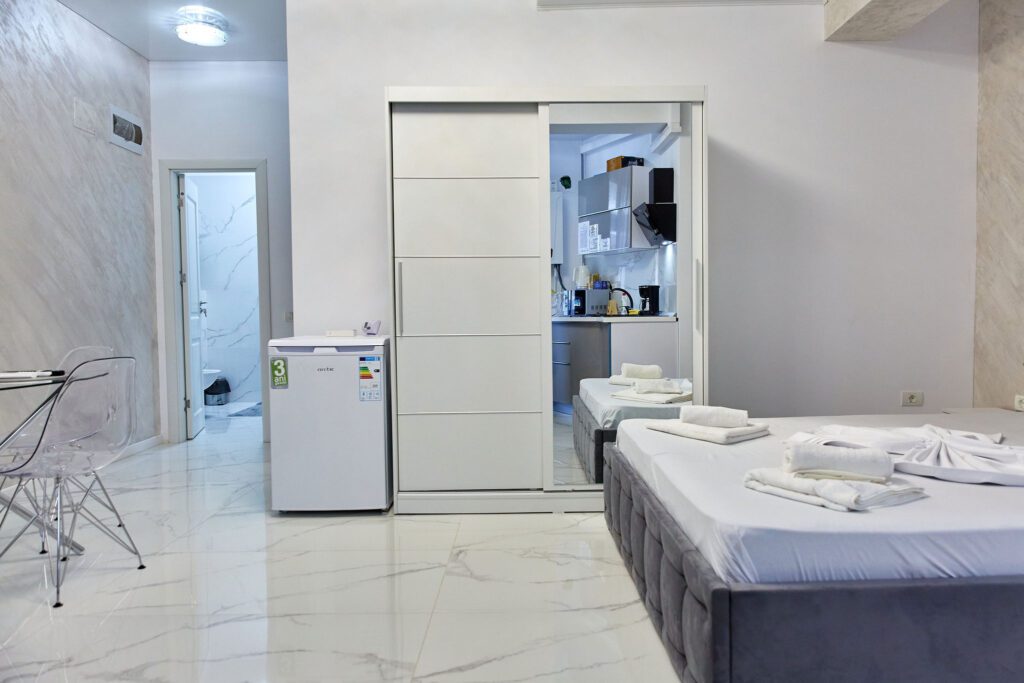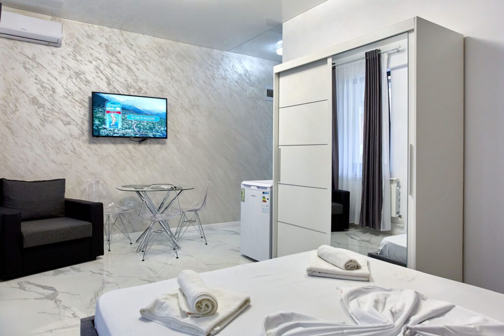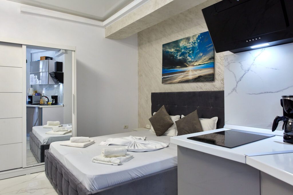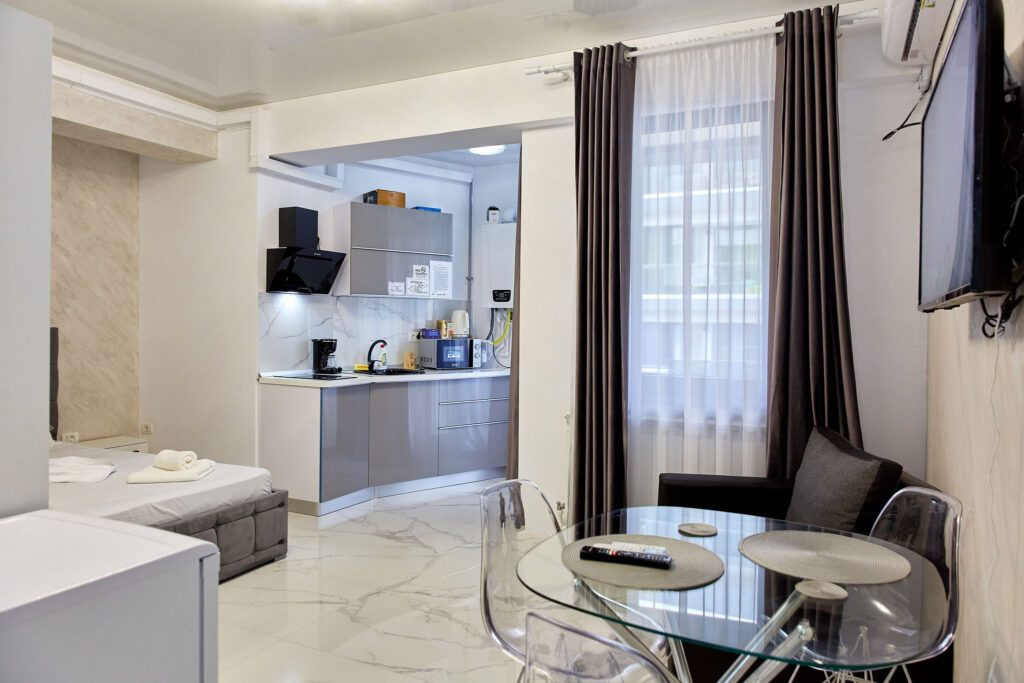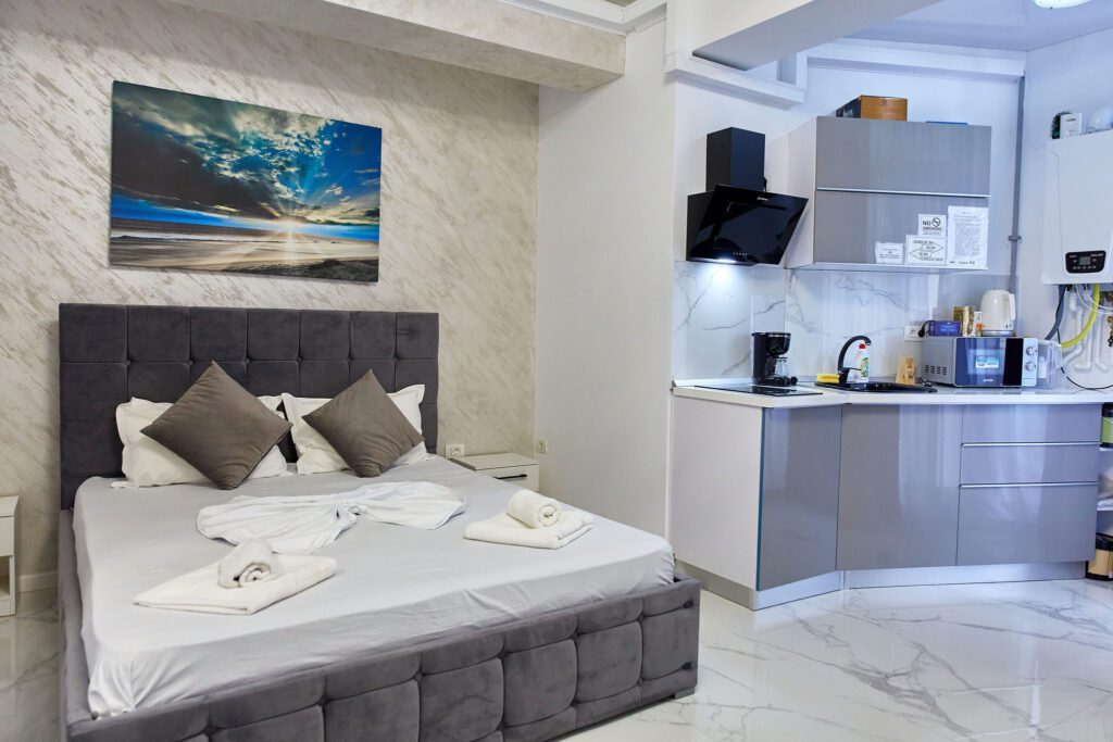 Studio “Lotus” oferă o atmosferă contemporană și confortabilă, unde designul modern și finisajele elegante se întâlnesc pentru a crea un spațiu plăcut și funcțional.