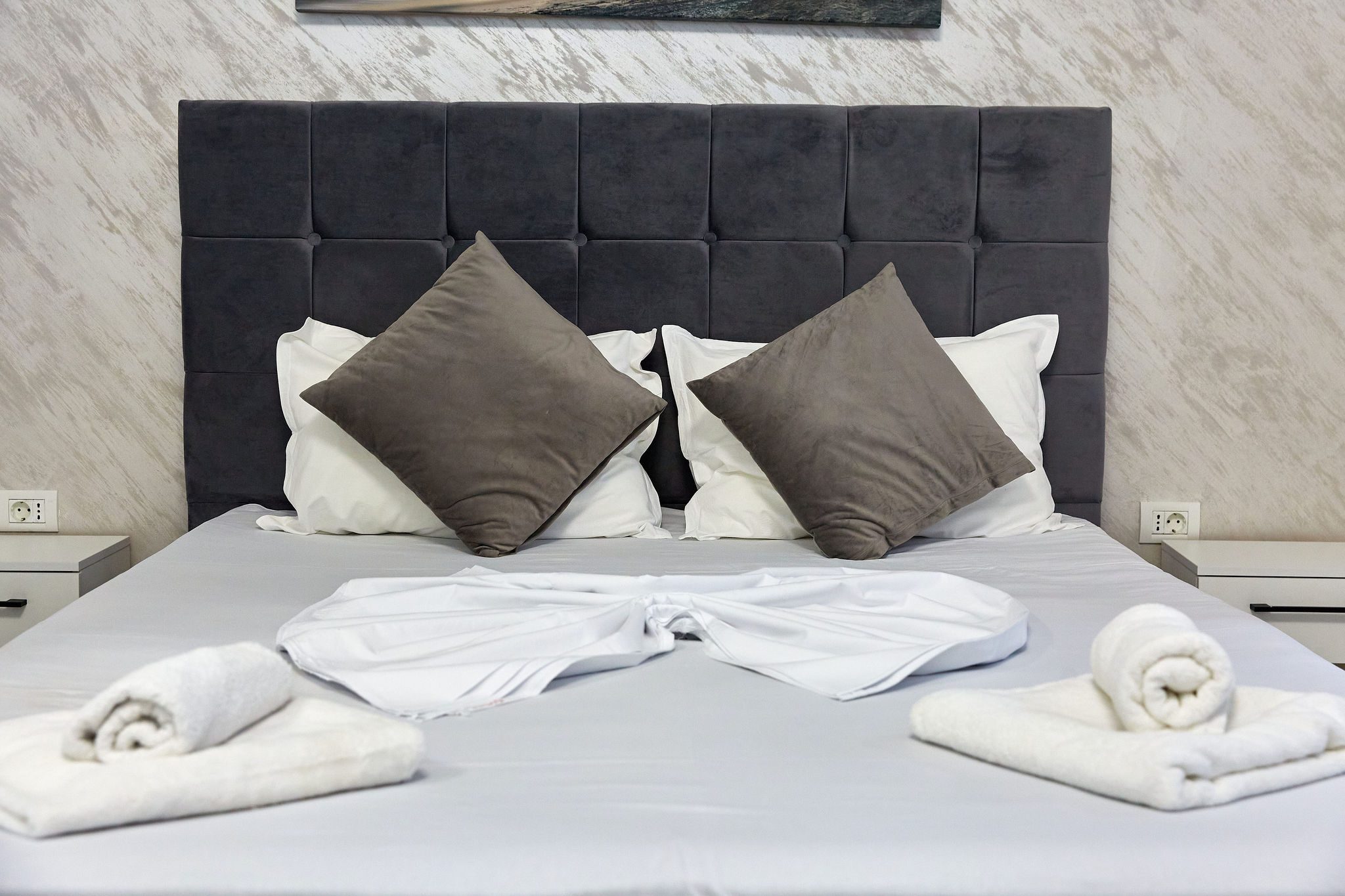 Studio Lotus Stefan Resort va ofera un ambient cat mai placut si relaxant datorita finisajelor si elementelor decorative atent alese si contrastului de culori perfect echilibrat.Zona de Dormit: În centrul camerei se află un pat matrimonial modern, de culoare gri închis, îmbrăcat în lenjerie albă de calitate. Lângă pat, un dulap alb generos oferă spațiu de depozitare practic. În fața patului, un televizor montat pe perete și un fotoliu negru extensibil completează zona.