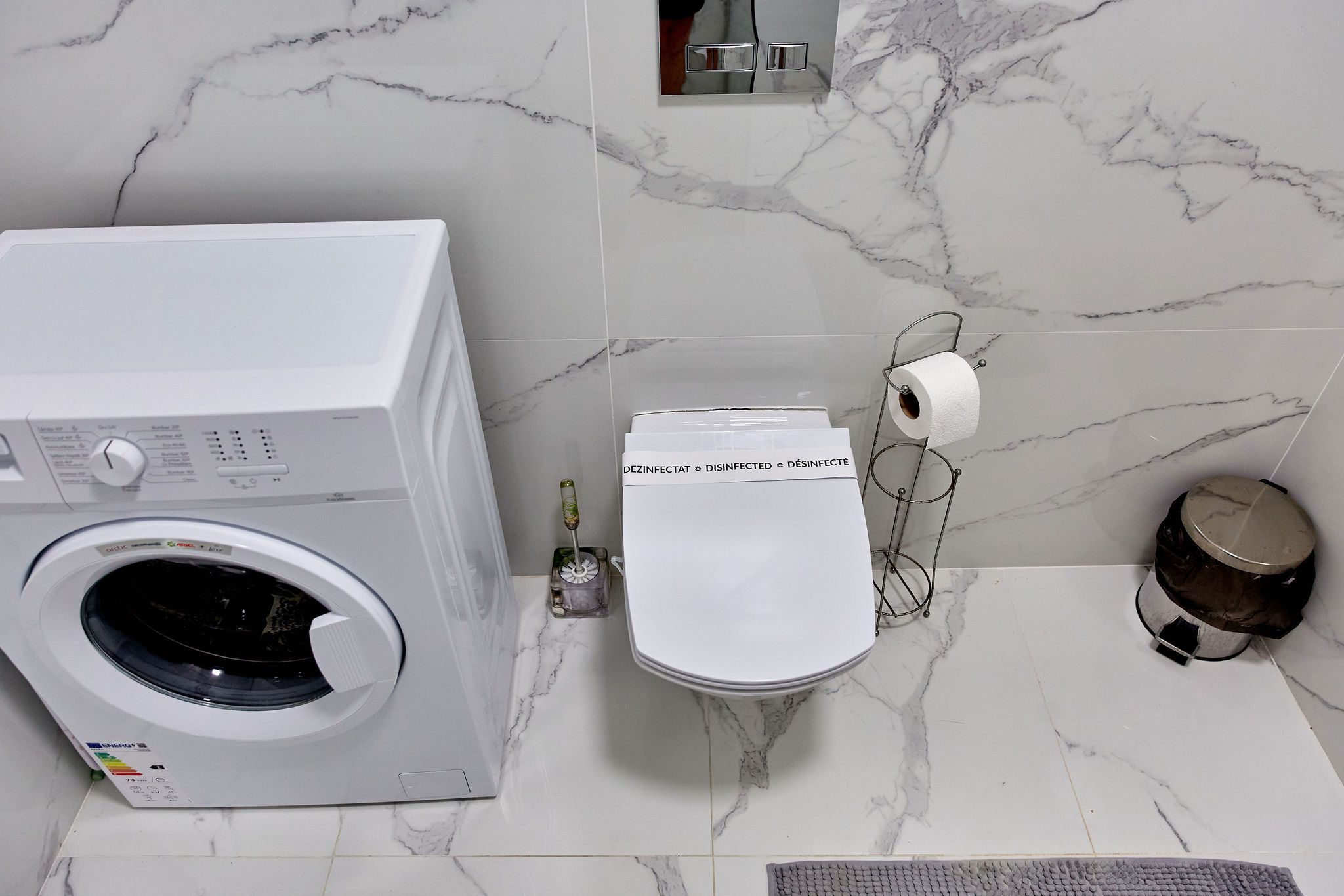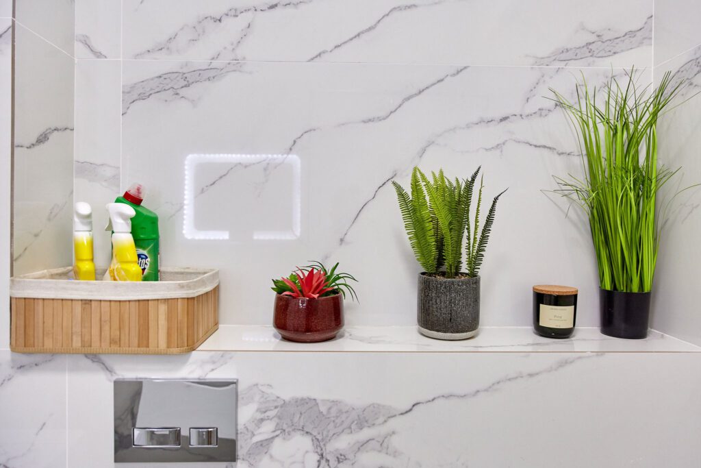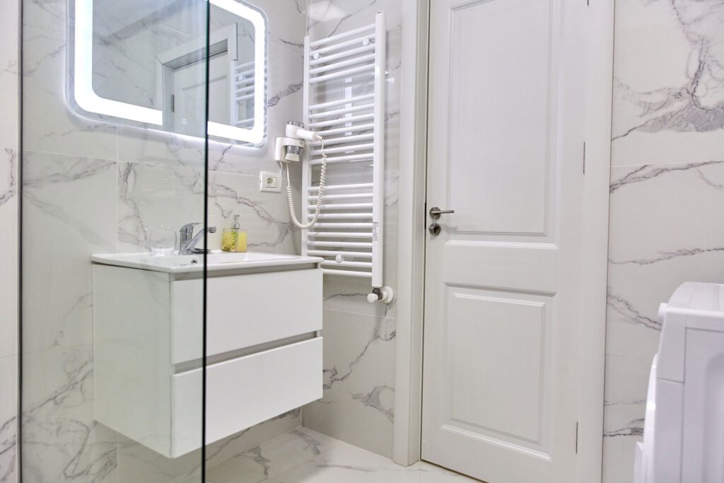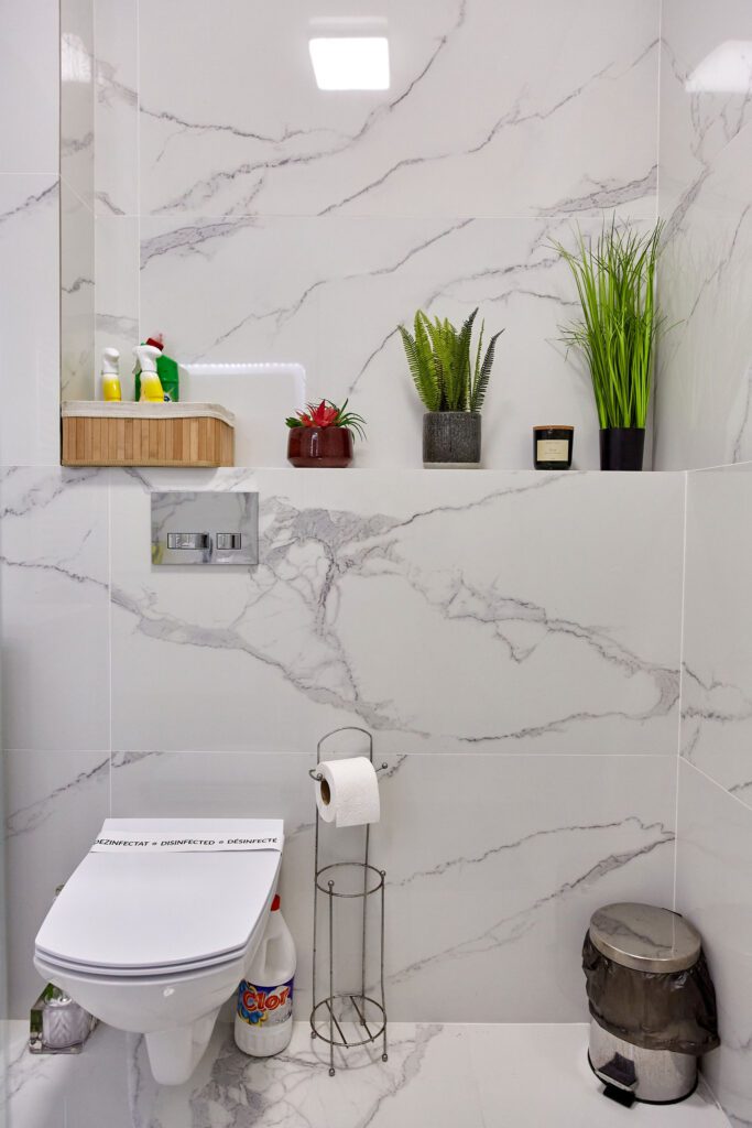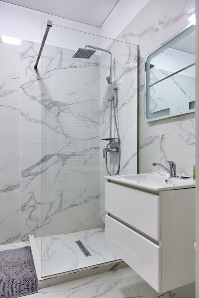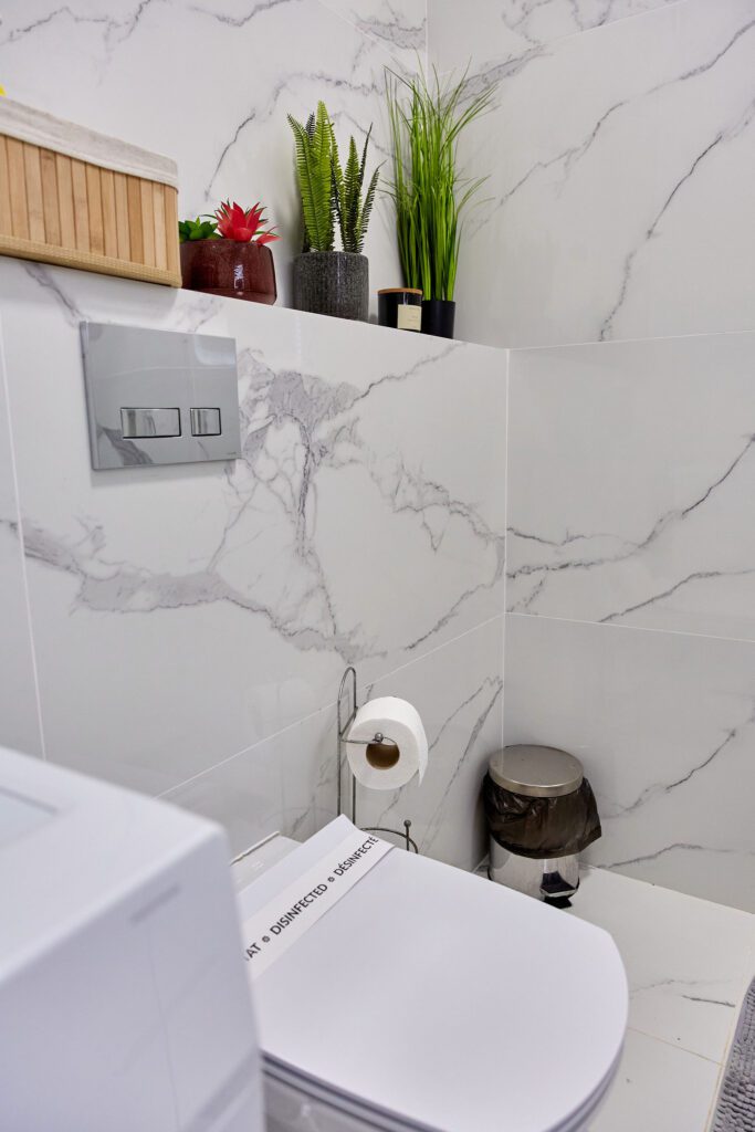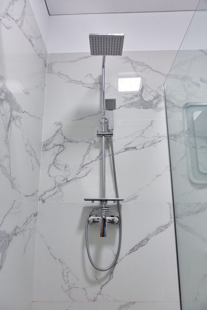 Baie: Baia impresionează prin faianta în stil marmură și dispune de un duș walk-in modern. Finisajele de calitate completează aspectul spațios și luxos al băii.