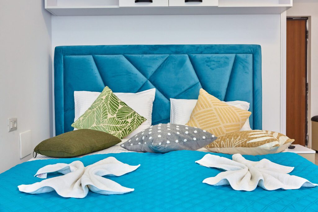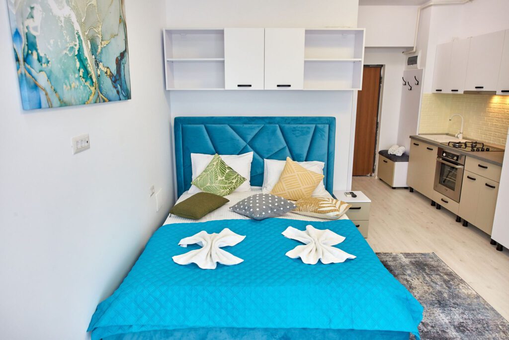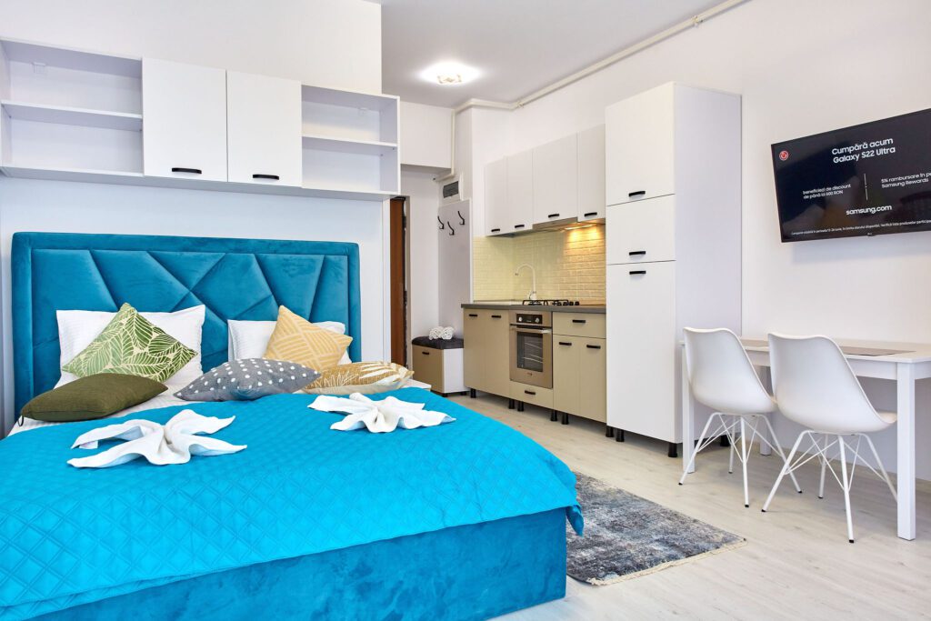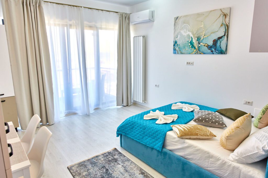 Zona de dormit este un sanctuar al serenității, dominată de un pat matrimonial albastru care reflectă cromatica mării, completat de lenjerie de pat de înaltă calitate pentru un somn odihnitor. Elementul central al acestui spațiu este fereastra mare, un portal către peisajul marin, oferind priveliști încântătoare ale apei în mișcare și ale orizontului întins. În stânga, un dulap asigură spațiu amplu de depozitare, menținând ordinea și simplitatea în decor, iar televizorul, amplasat strategic, împreună cu masa și cele două scaune, formează colțul perfect pentru relaxare și divertisment.