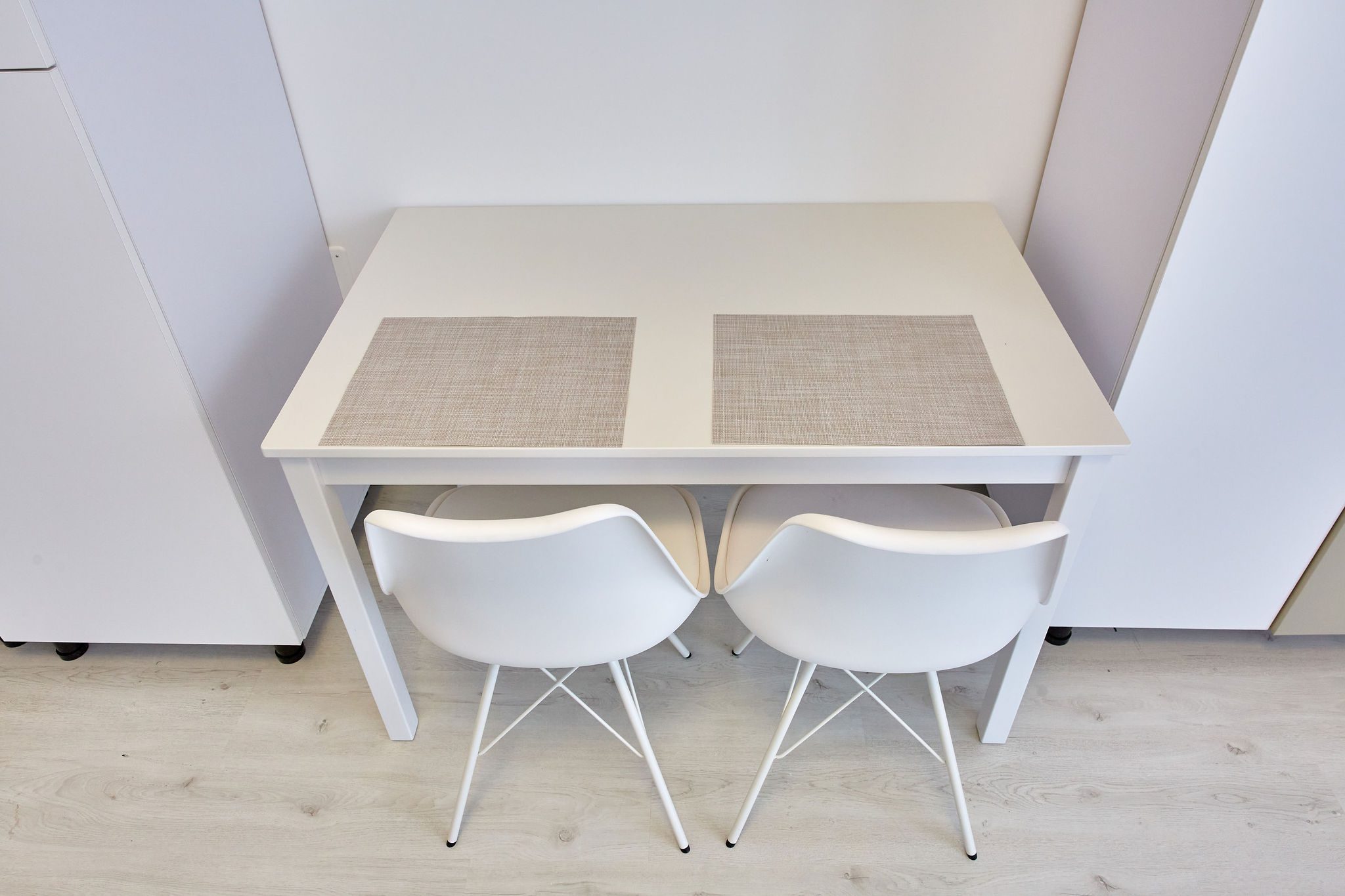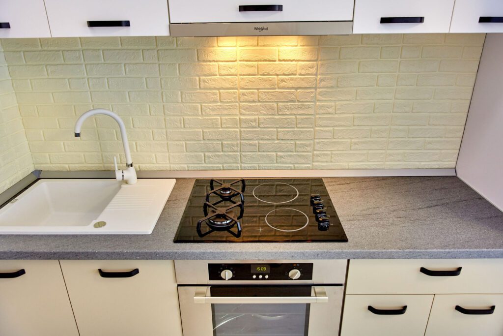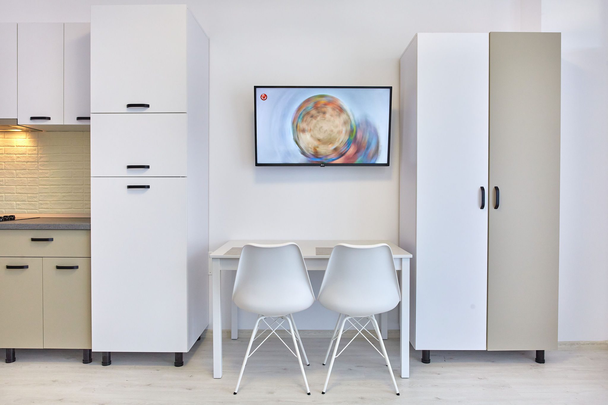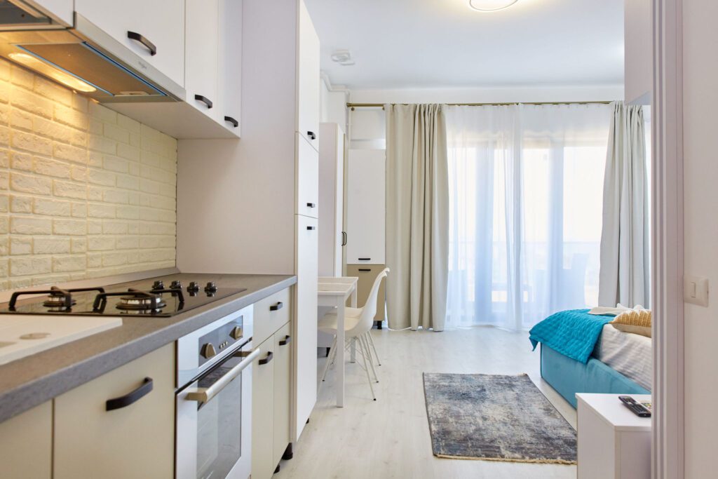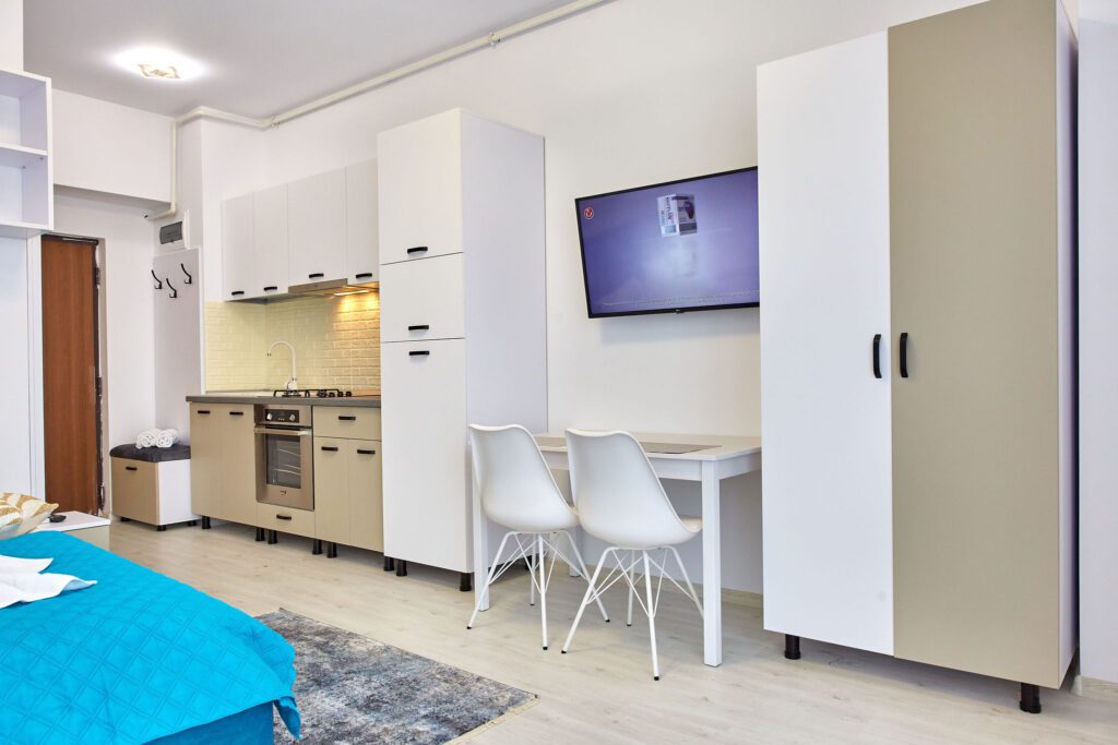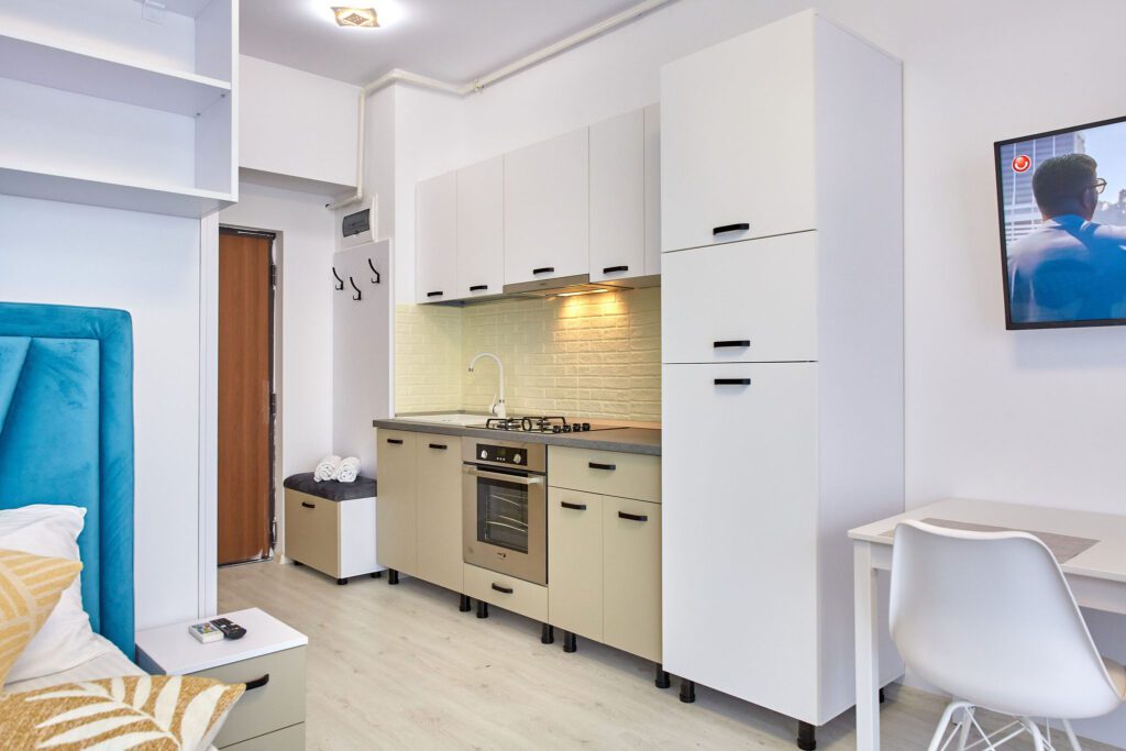 Zona de bucătărie este un amestec armonios de funcționalitate și estetică plăcută, cu mobilier în nuanțe de bej și alb care amplifică luminozitatea și senzația de spațiu deschis. Dotările moderne oferă toate facilitățile necesare pentru prepararea mesei, fără a compromite stilul și eleganța.