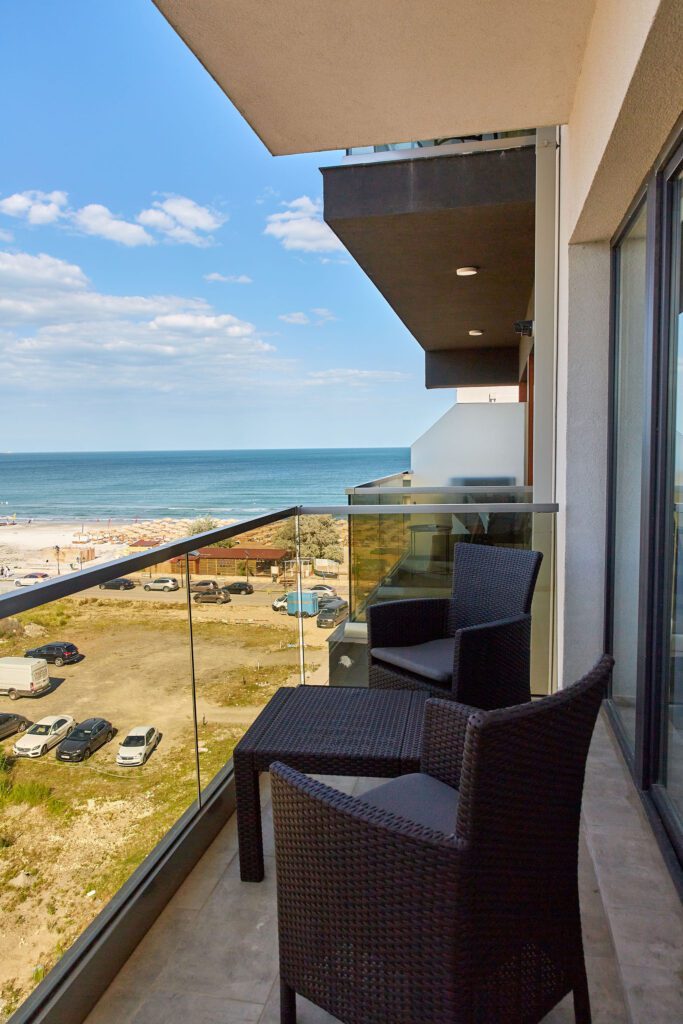 Balconul, un spațiu intim de contemplare, este mobilat cu grijă pentru a permite oaspeților să se bucure de briza mării și de vederile laterale spre valurile liniștitoare. Acesta servește ca o extensie a spatiului de locuit, un loc unde diminețile și serile se pot savura în ritm cu marea.