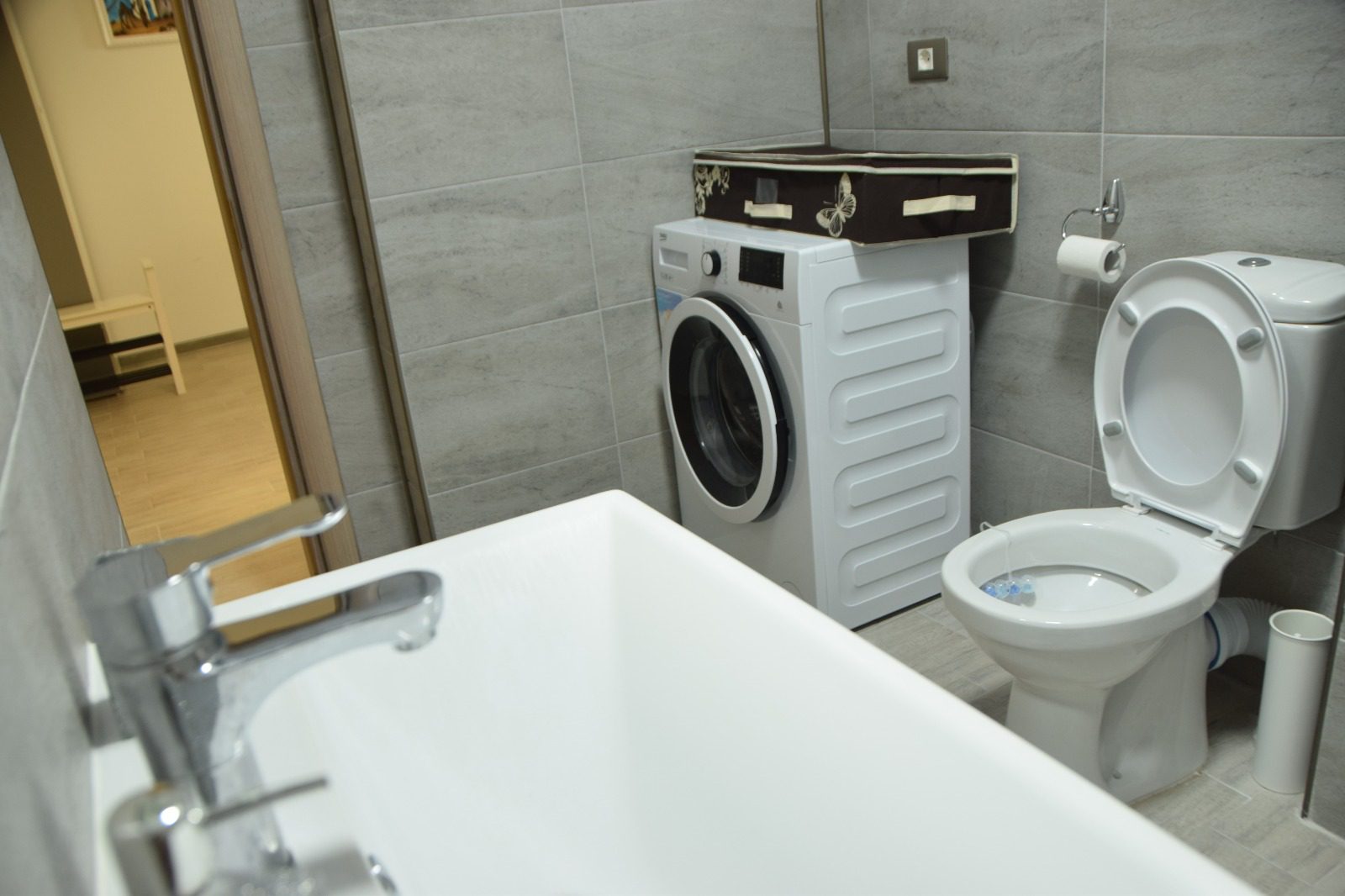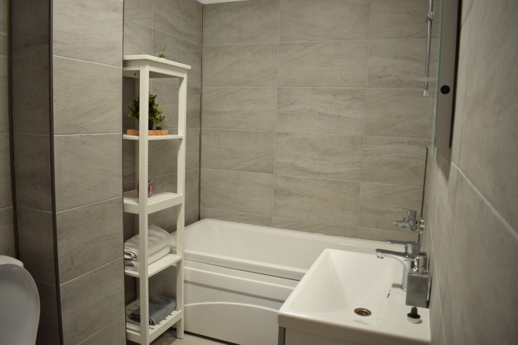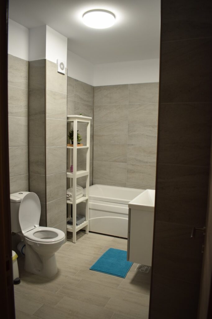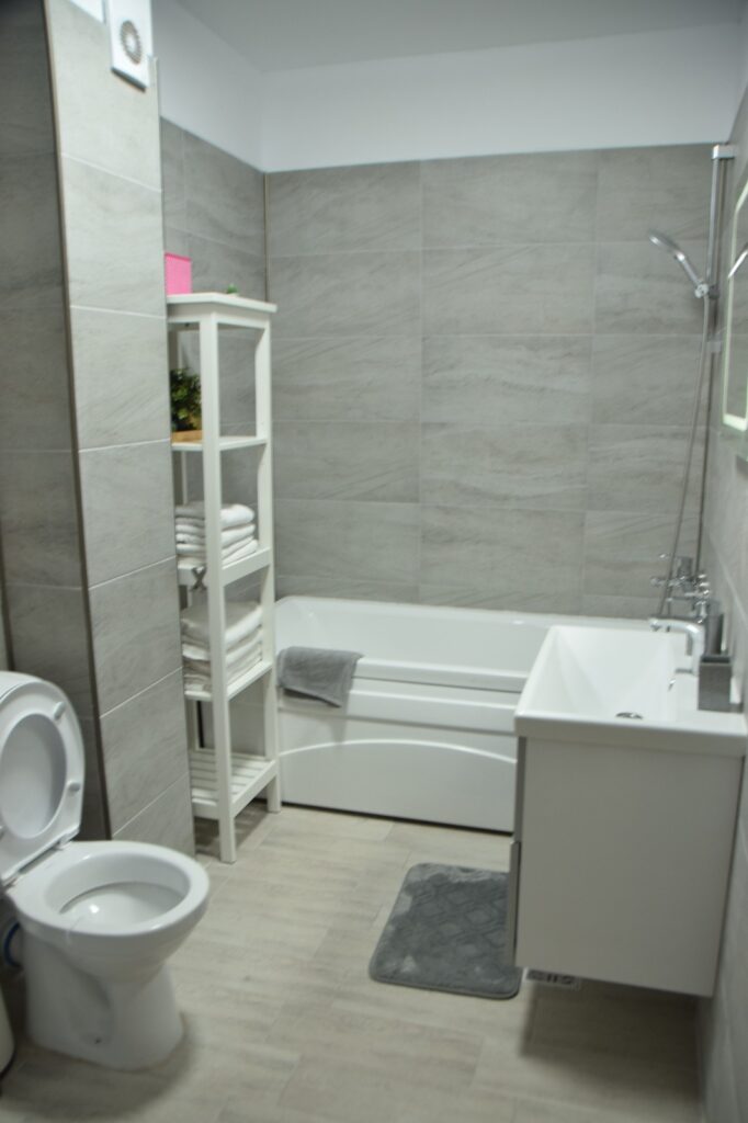 Baia, în tonuri de alb și cu linii curate, este un sanctuar de intimitate și confort. Cada generoasă invită la băi relaxante, în timp ce mașina de spălat, inteligent incorporată în mobilierul alb, subliniază funcționalitatea acestui spațiu. Fiecare detaliu este gândit pentru a maximiza confortul și utilitatea.