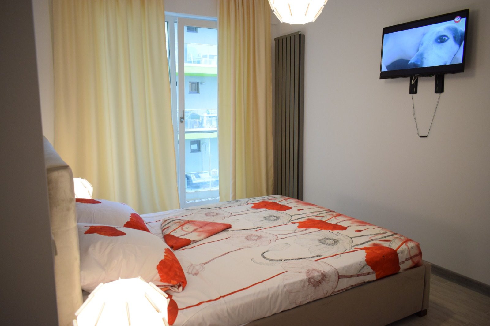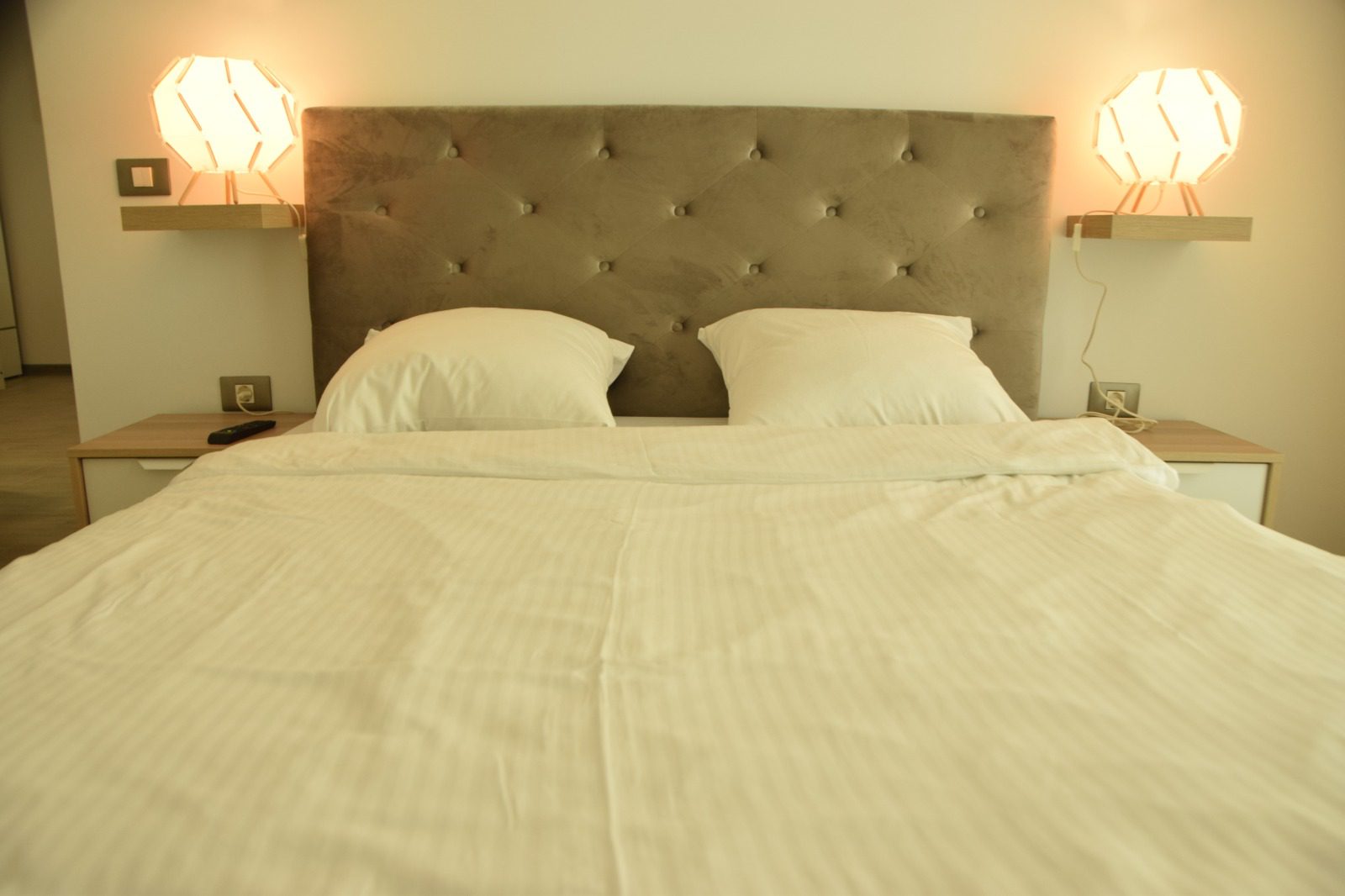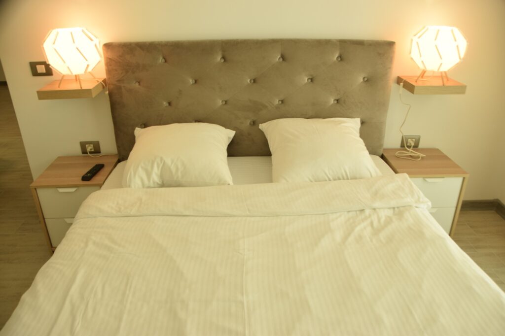 Dormitorul continuă tema de design calmă și relaxantă, cu un pat matrimonial amplasat strategic pentru a oferi o odihnă de neegalat. Lenjeria de pat albă de înaltă calitate accentuează sentimentul de puritate și liniște, în timp ce un televizor fixat pe perete oferă divertisment privat, fără a încărca spațiul.