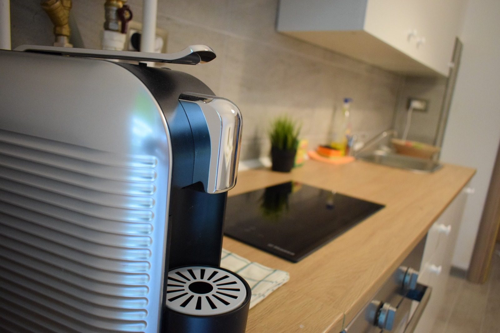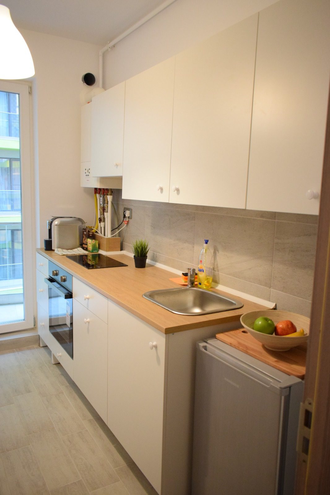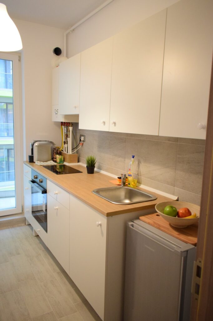 Bucătăria, separată de sufragerie printr-o ușă discretă, este un model de eficiență și stil modern. Mobilierul alb, curat și fără ornamente inutile, este accentuat de un blat de lemn care adaugă o notă de căldură naturală. Dotările moderne sunt atent alese pentru a satisface nevoile culinare ale oaspeților, oferind totodată un cadru plăcut pentru prepararea și servirea meselor. Masa, înconjurată de scaune confortabile, este spațiul perfect pentru a aduna familia sau prietenii în jurul unui festin sau al unei băuturi calde.