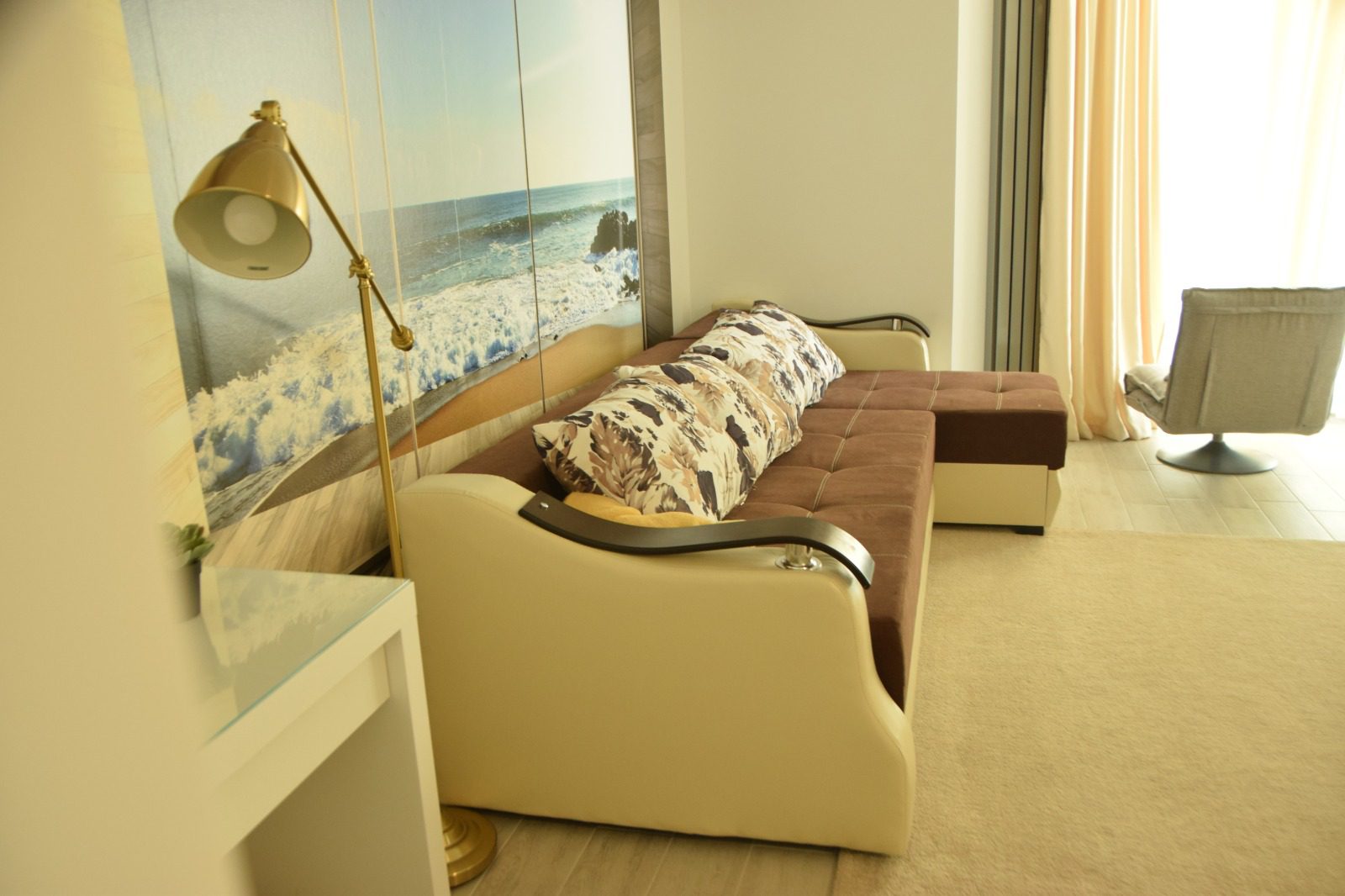 Sufrageria deschisă întâmpină vizitatorii cu o canapea extensibilă care îmbrățișează culorile calde ale soarelui la apus, creând un centru vizual și funcțional al încăperii. În fața canapelei, un televizor modern este așezat pe un mobilier minimalist, care reflectă simplitatea și stilul curat al spațiului. Elementul de focalizare al sufrageriei este tapetul amplasat în spatele canapelei, care prezintă o imagine idilică a mării, invitând la visare și relaxare.